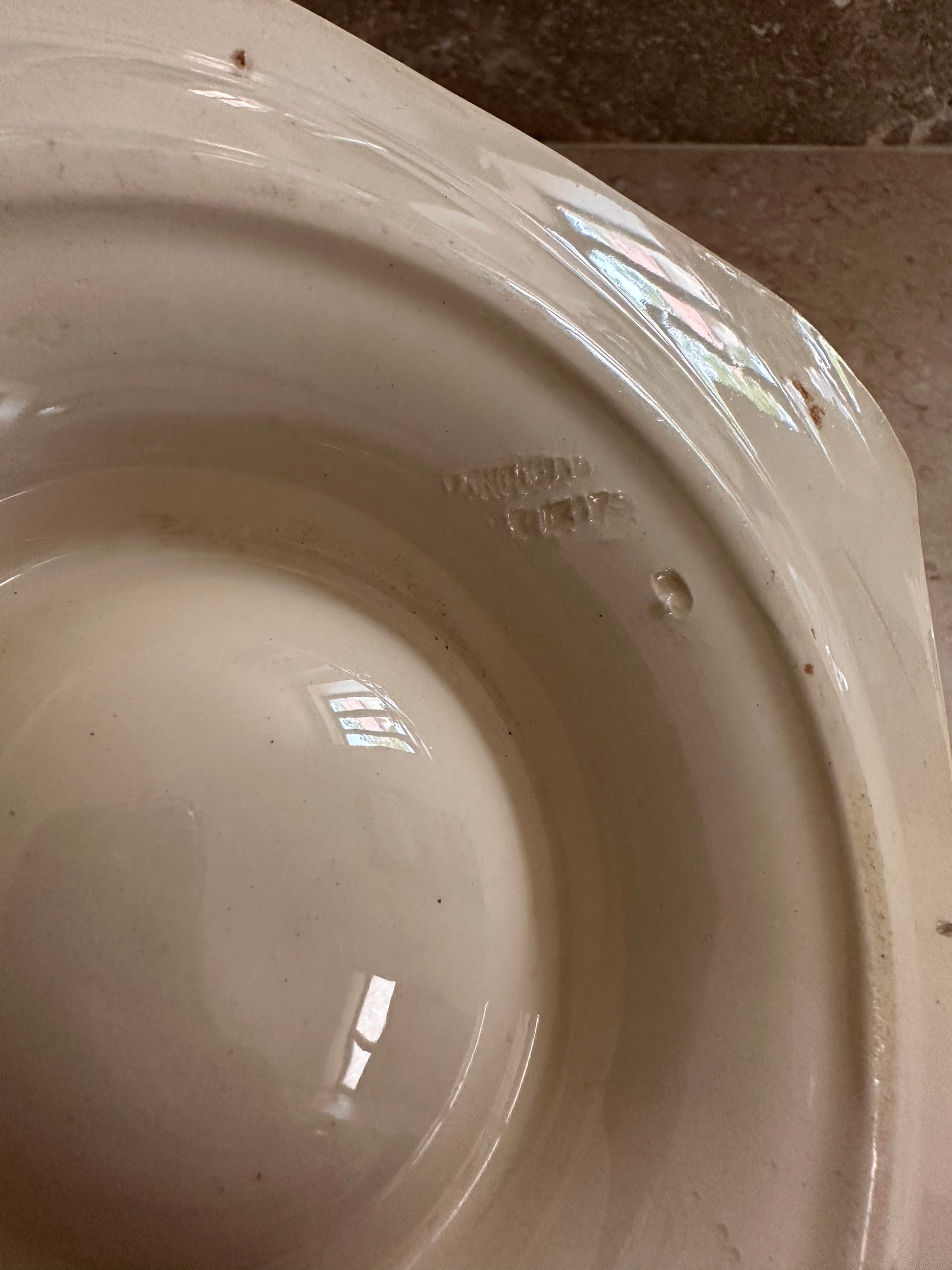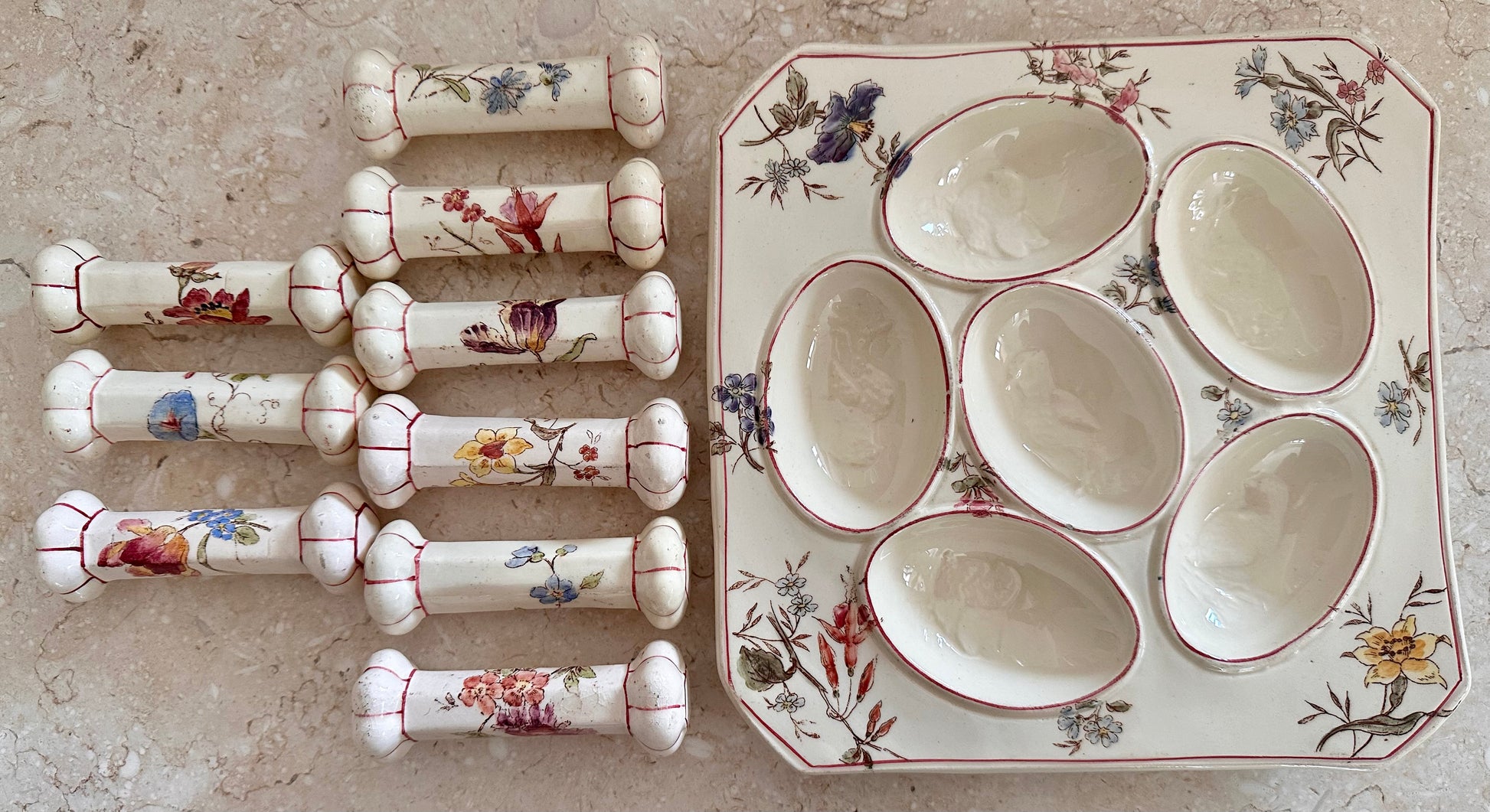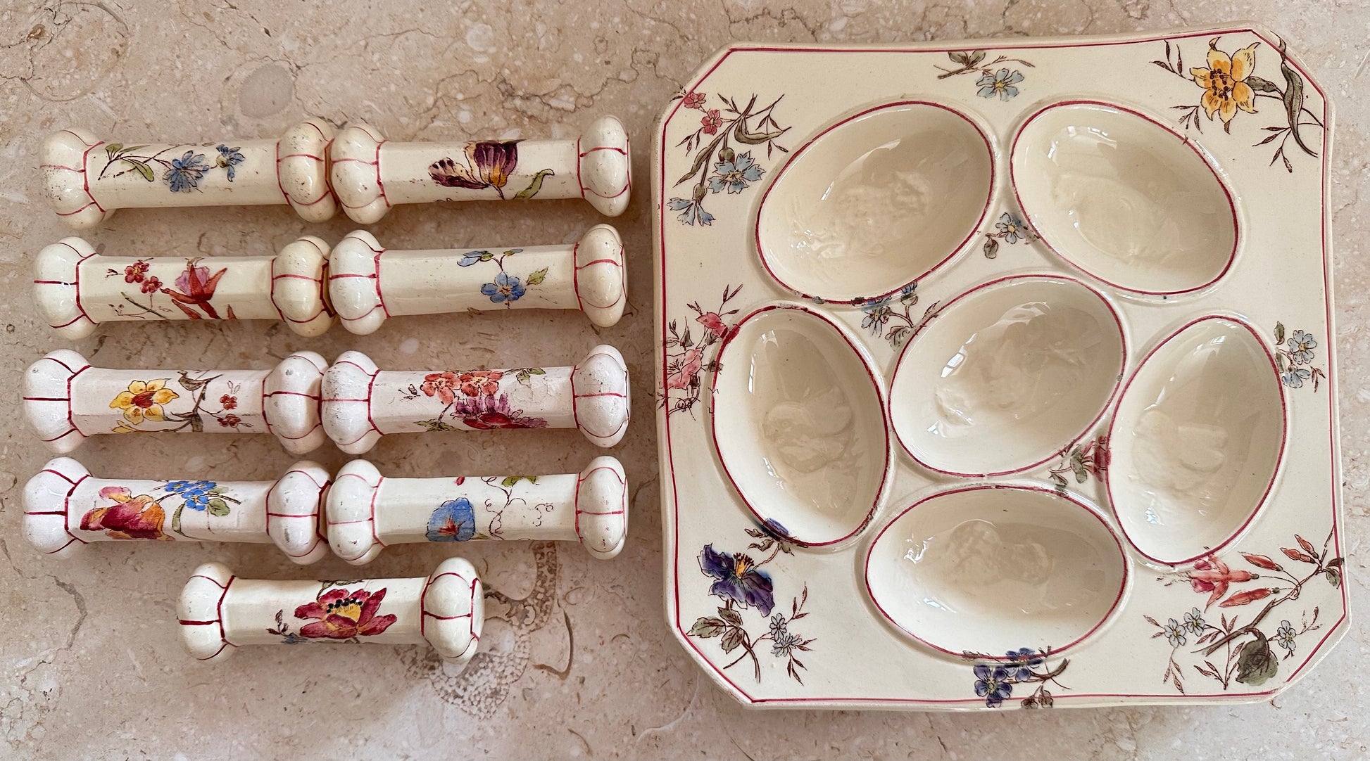 A French antique majolica set of 9 knife rests made by the manufacture of Longchamp in the 1900's. They do not bear the deep mark of the pottery fabric but the pattern is easily recognizable, the same as the egg plate in the photo that bears the Longchamp's mark.