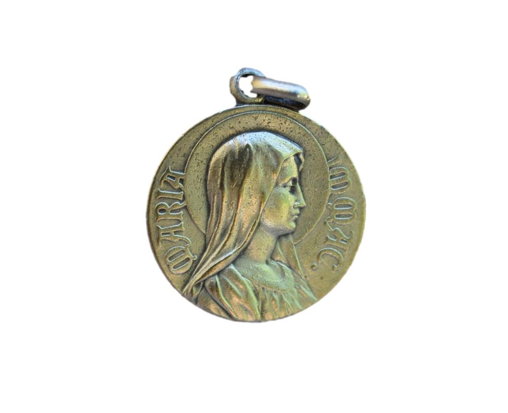 A charming French antique medal from the Art Nouveau period. The silver plated pendant finely features a beautiful portrait of Mary. This authentic French religious medal was a souvenir of Our Lady of Lourdes (NDL).