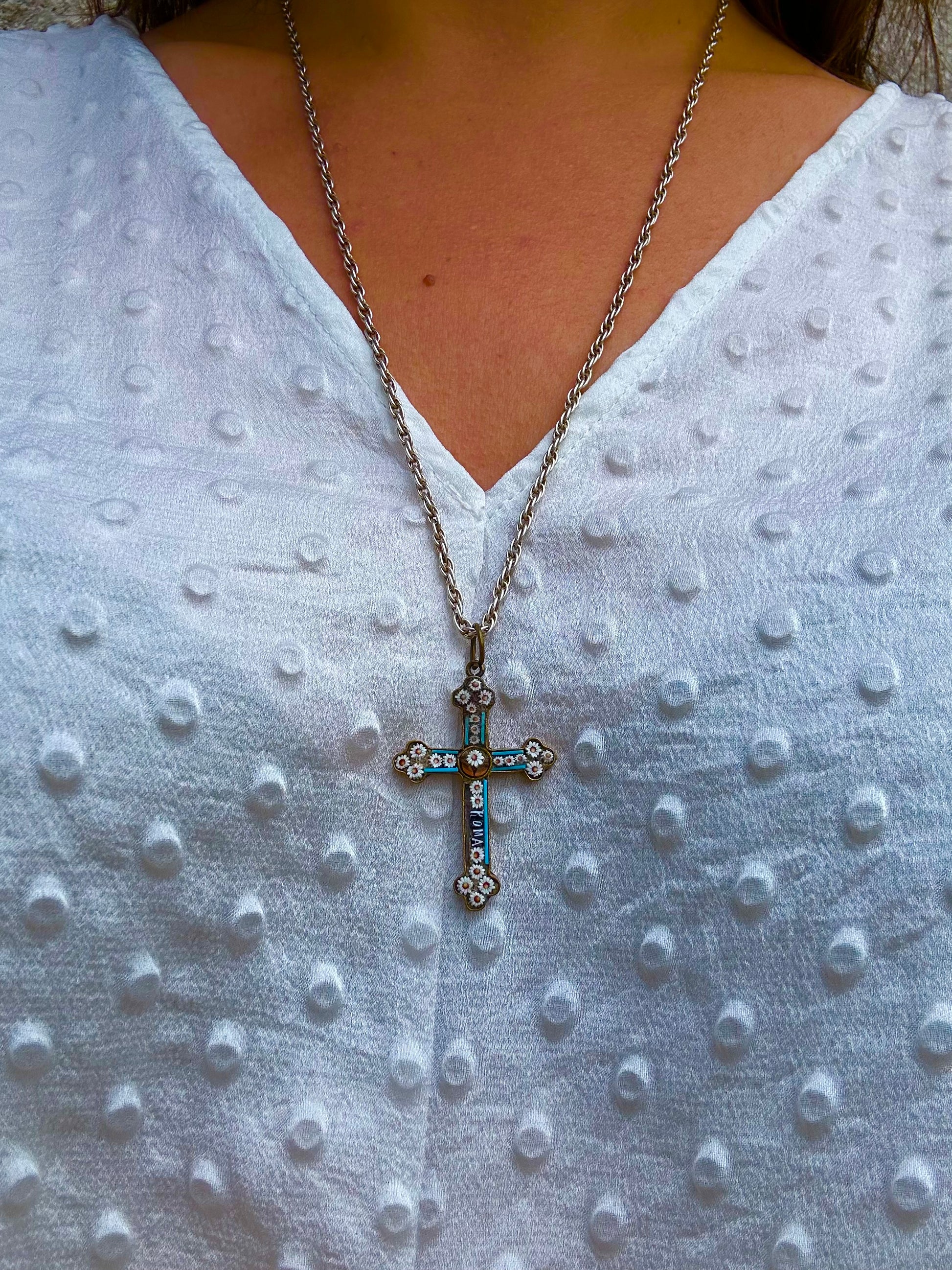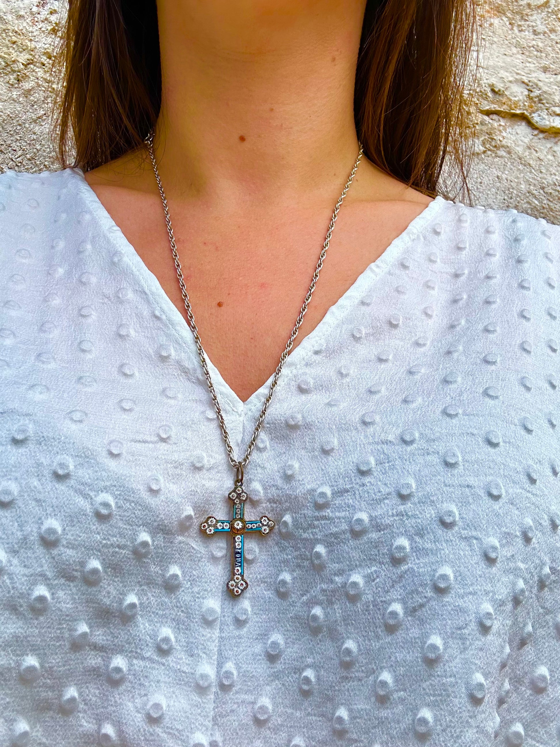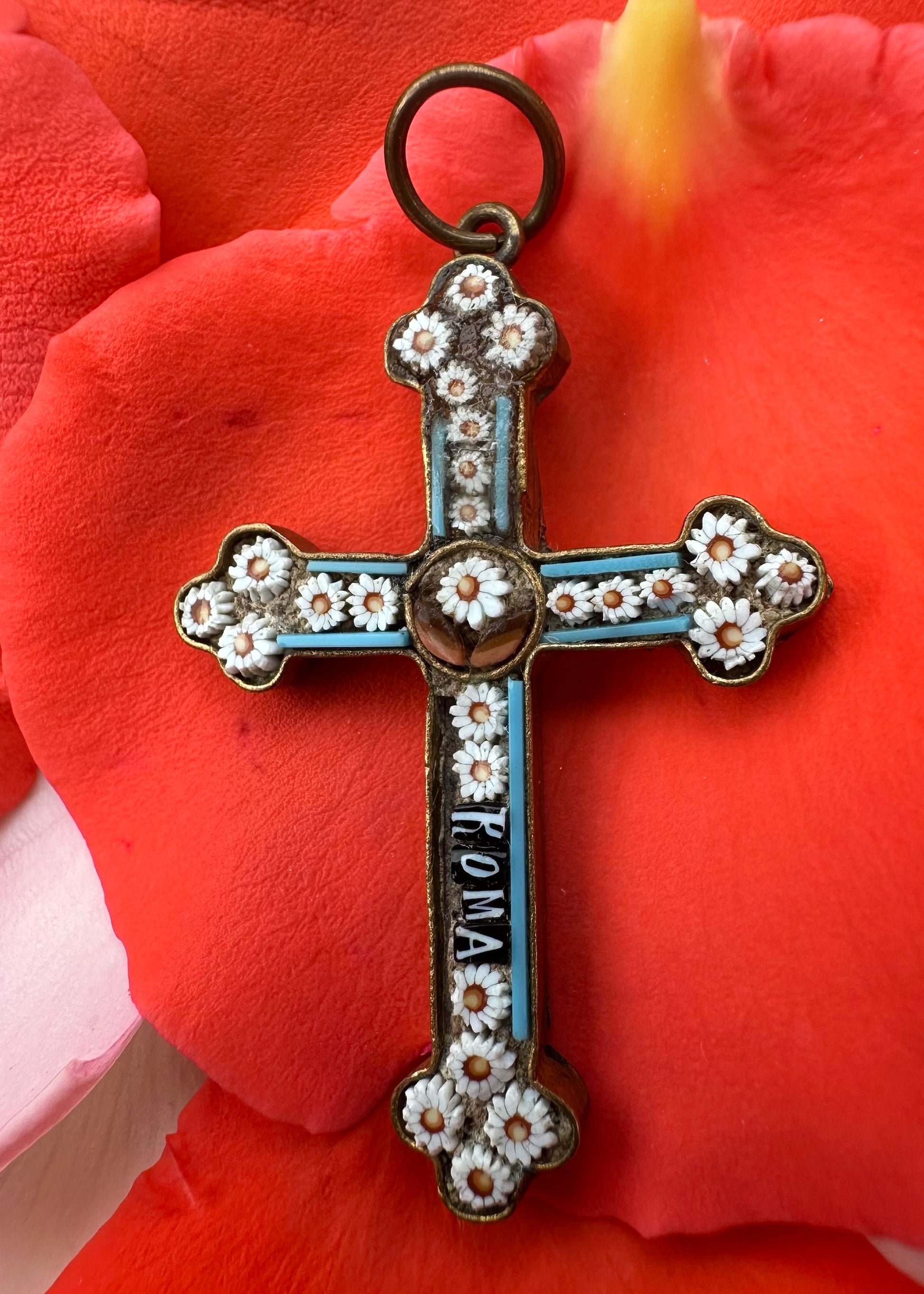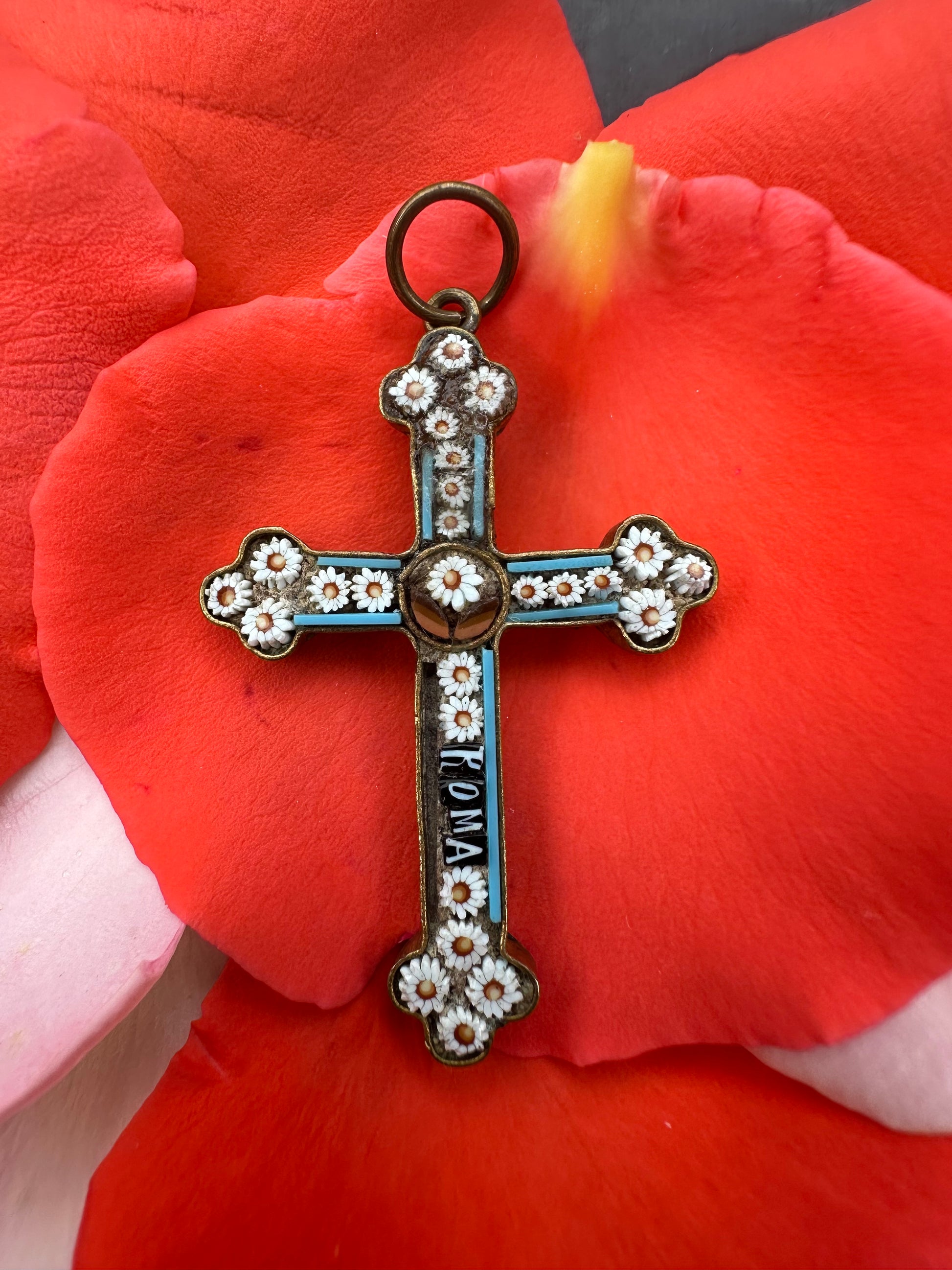 Beautiful antique Italian micro mosaic cross pendant with a pleasing combination of blue, white and yellow tiles. The floral design features delicate daisies. This cross shaped jewelry is a souvenir or pilgrimage to the Holy city of Rome.