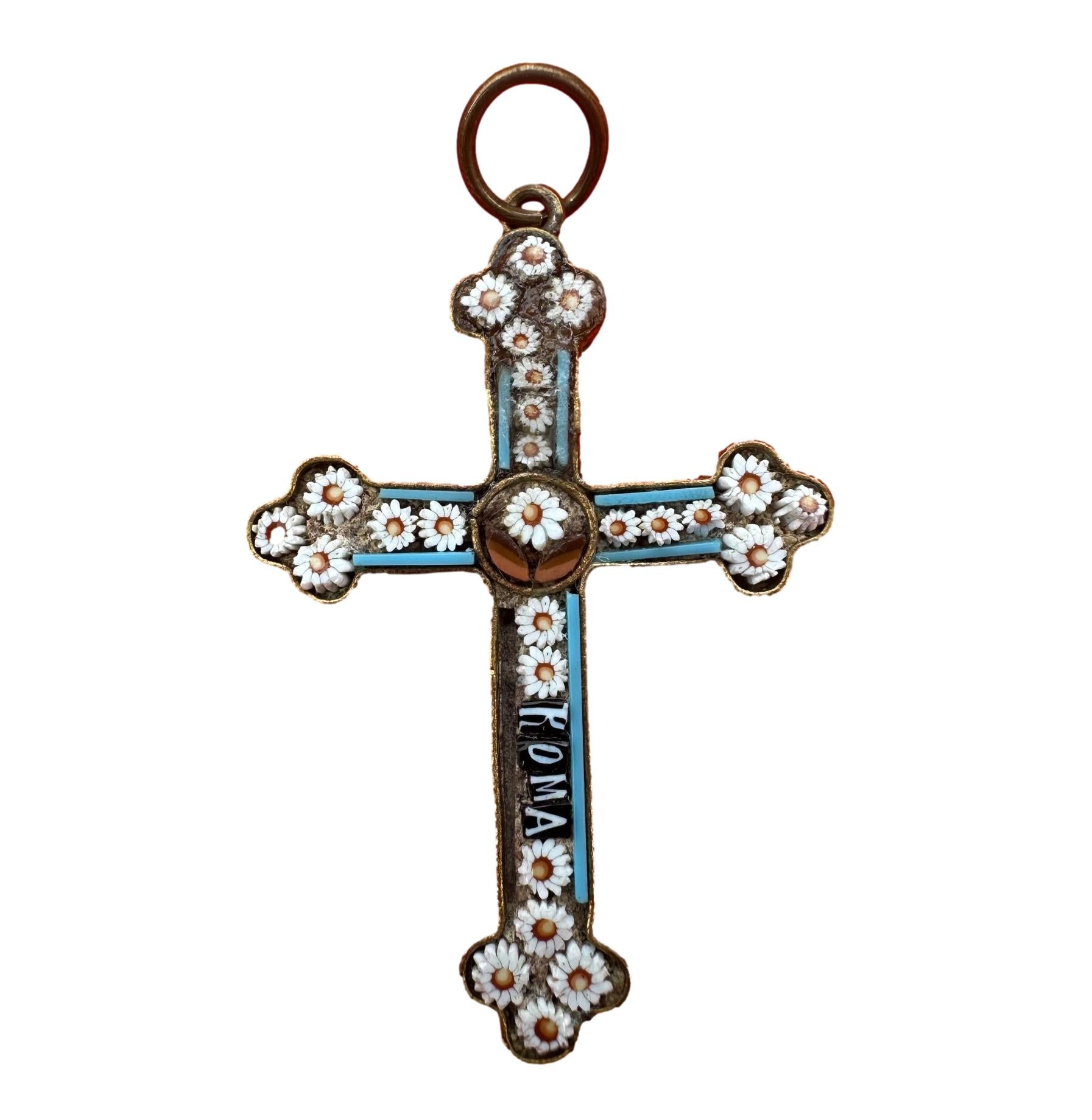 Antique Italian Micro Mosaic Cross Pendant with Floral Design Roma, Gift for Her