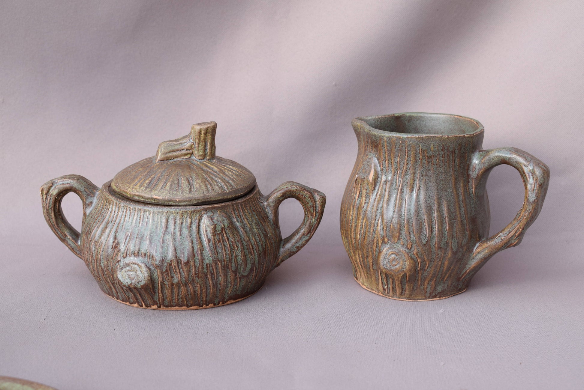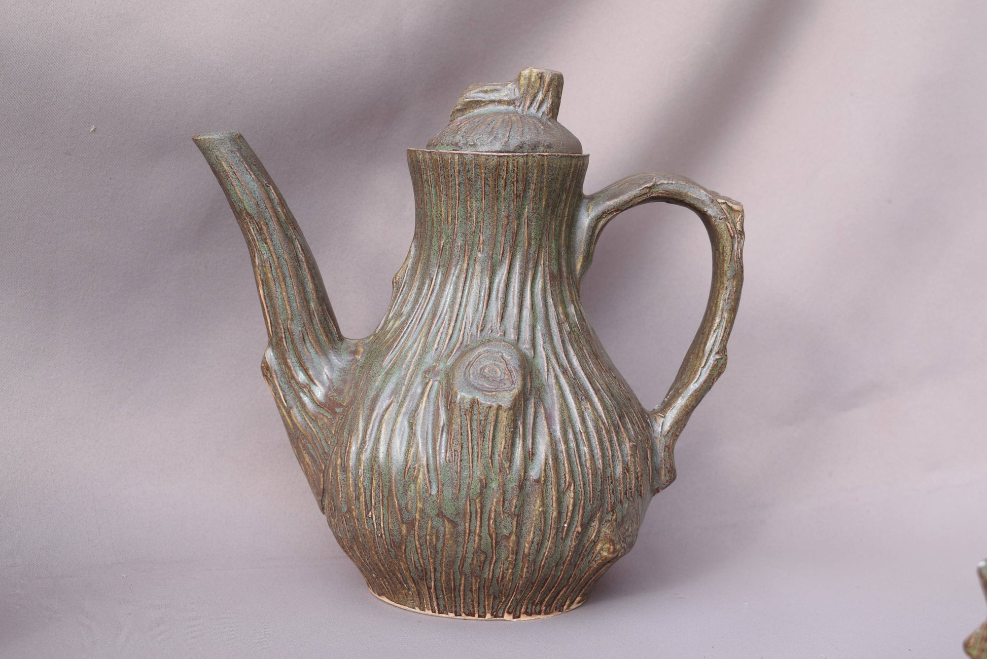 The set is designed to resemble a tree trunk, with each piece meticulously crafted to capture the texture and appearance of natural wood. The exterior features a rich, earthy brown glaze, accentuated with intricate detailing that mimics the bark and knots of a tree. The handles are cleverly integrated into the design, resembling a small branch extending from the trunk, enhancing the organic and rustic charm of the set.