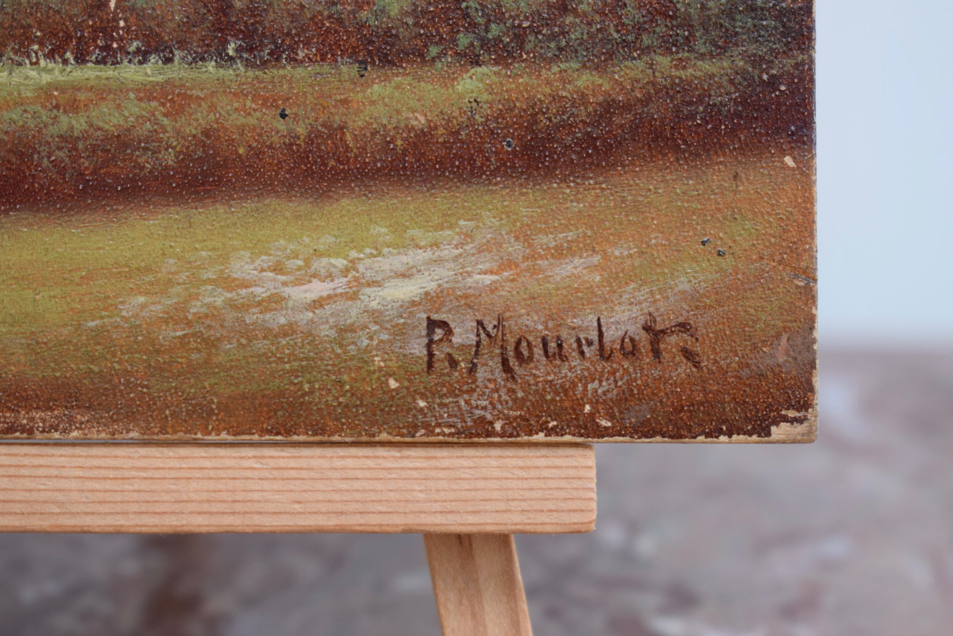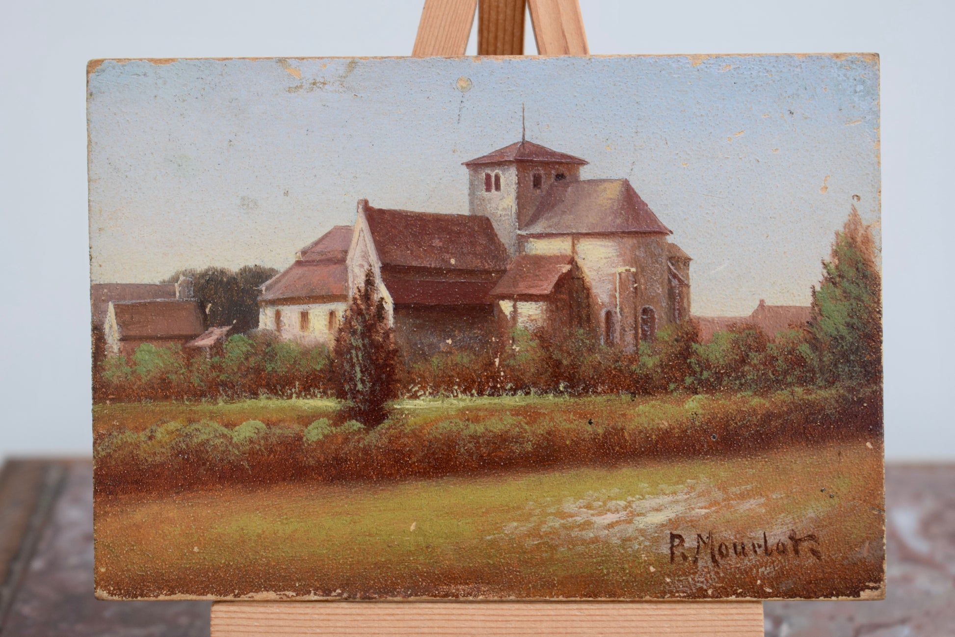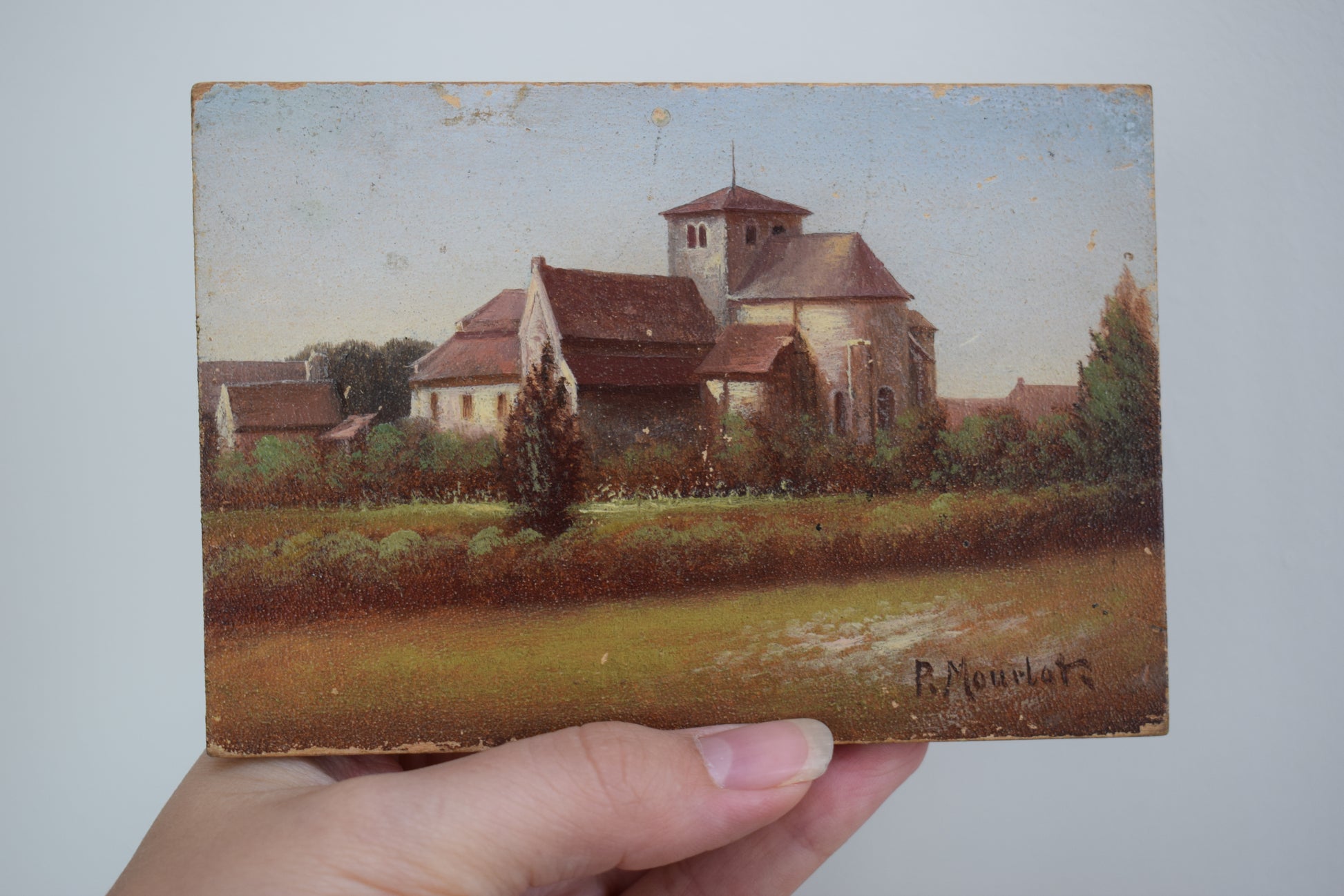 A vintage French oil painting on wood panel dating to the early 20th century. The beautifully made miniature painting depicts a church in a village of France. It has been signed by the artist P.Mourlot. It comes with a new easel to easily display it in your home.