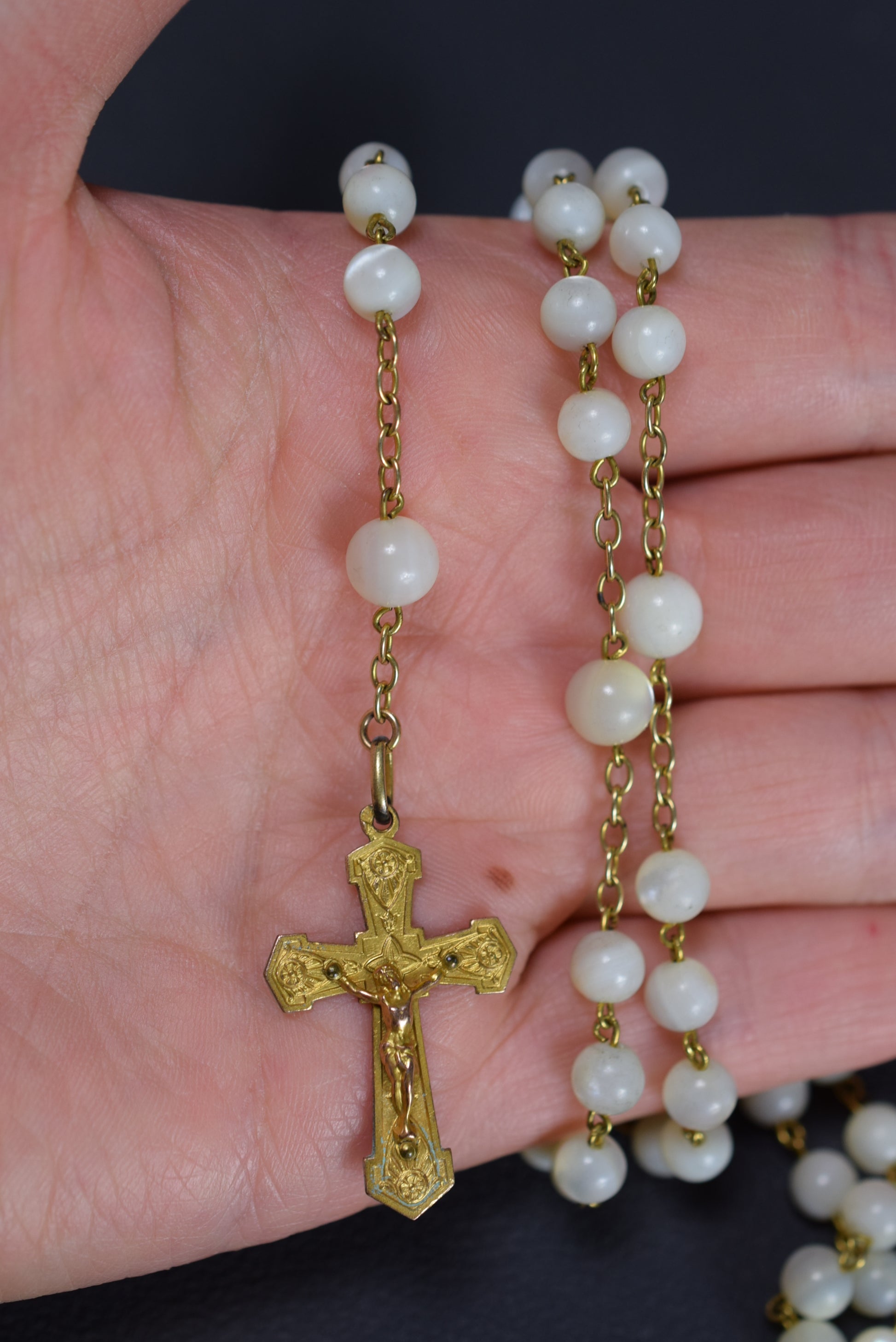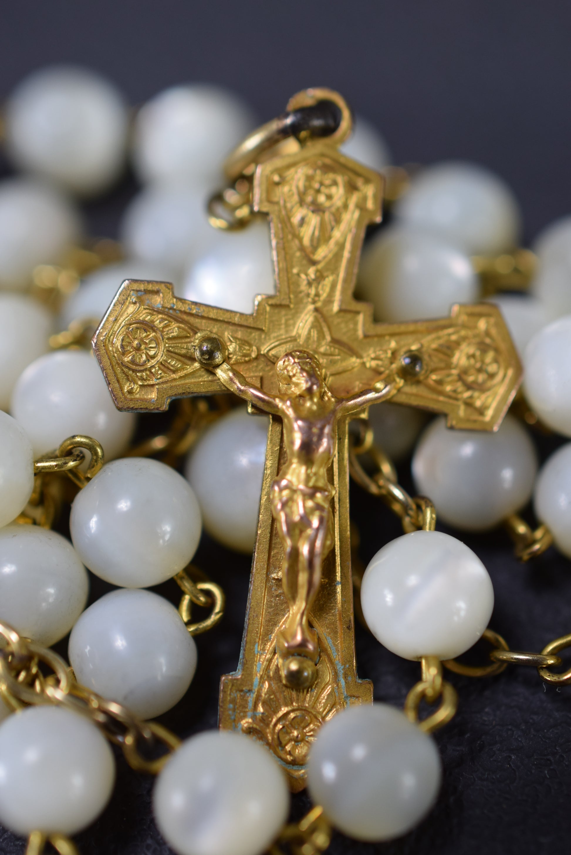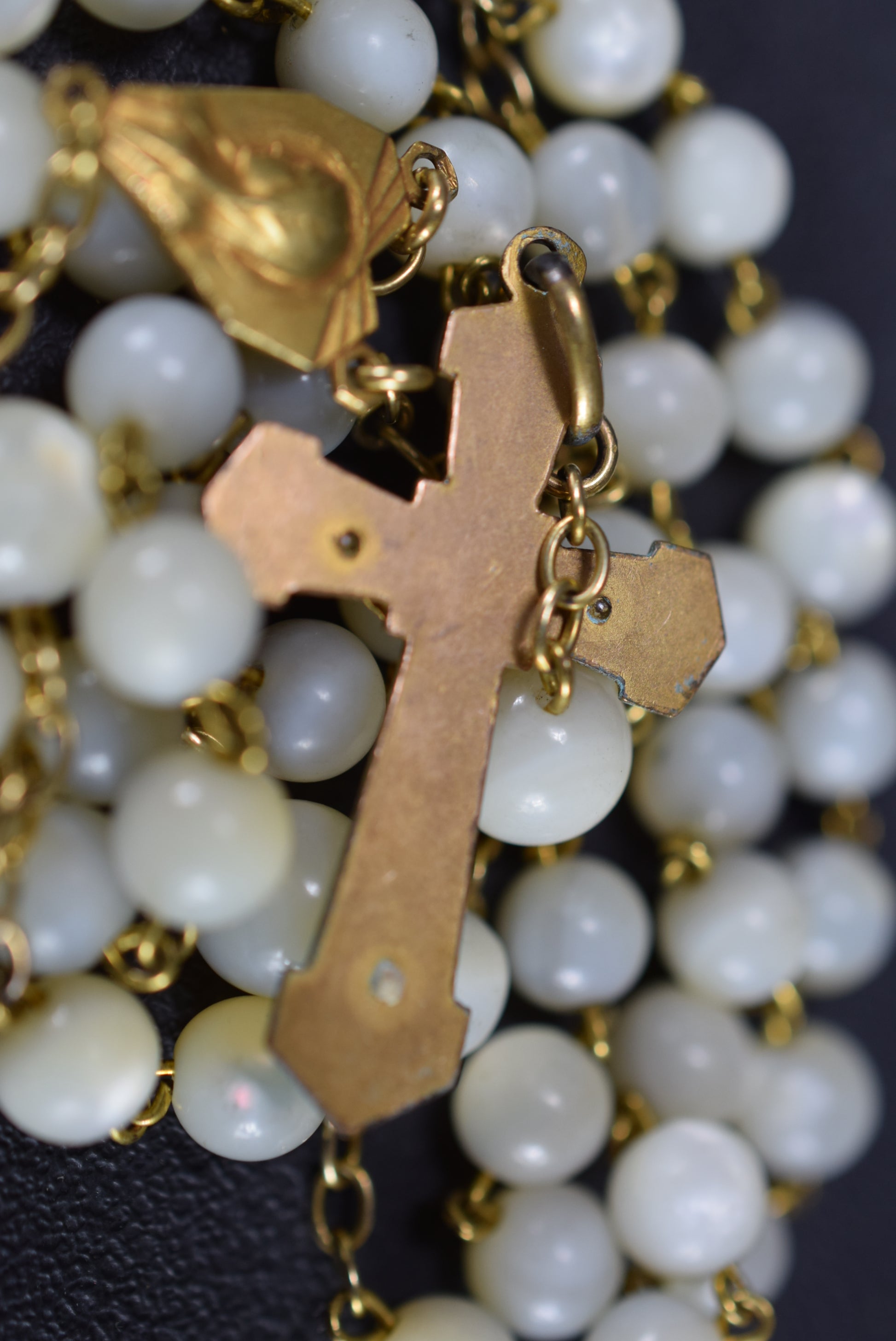 A fabulous and authentic French rosary from the 1940's. It is made of 59 mother of pearl beads and gold plated metal. The cross and the connector are finely crafted and marked France.