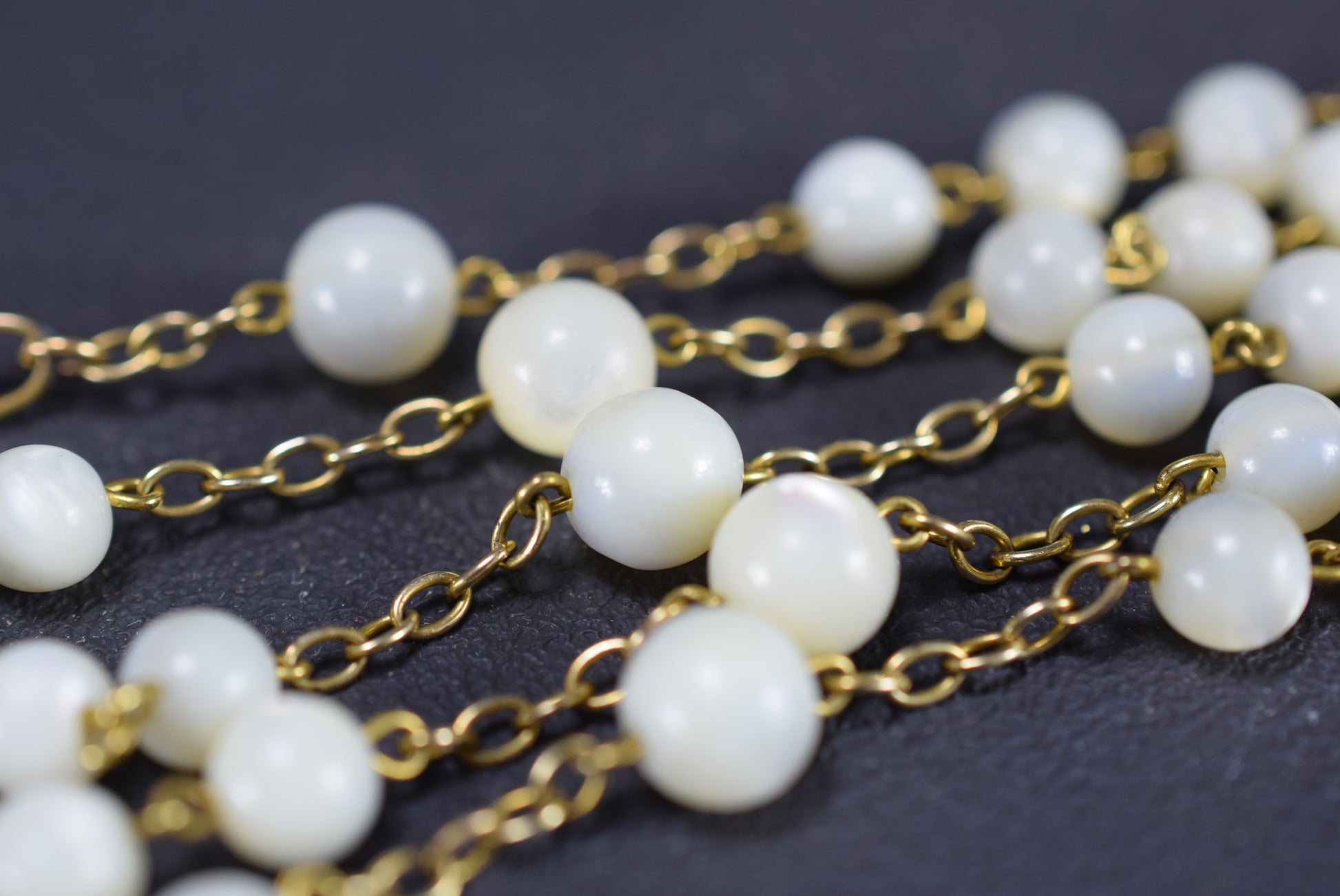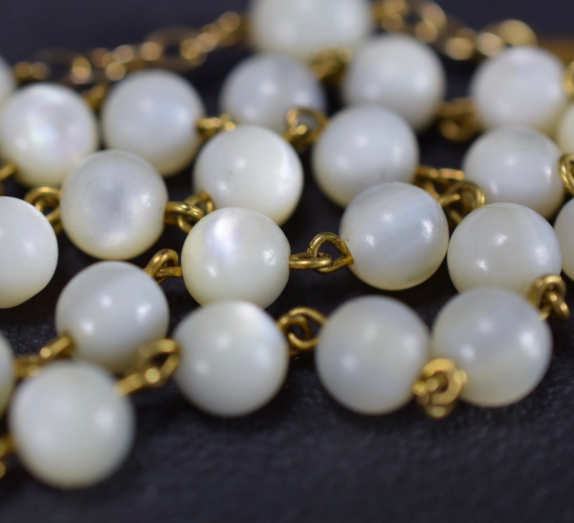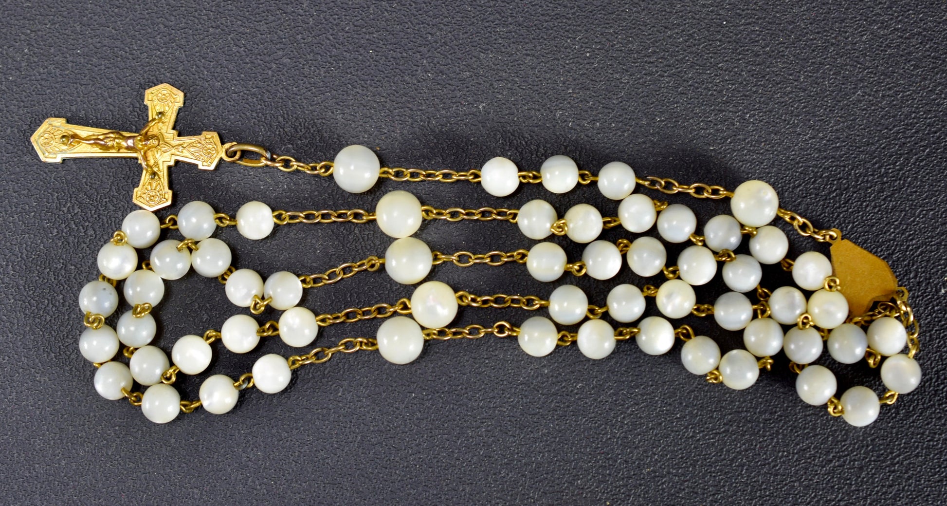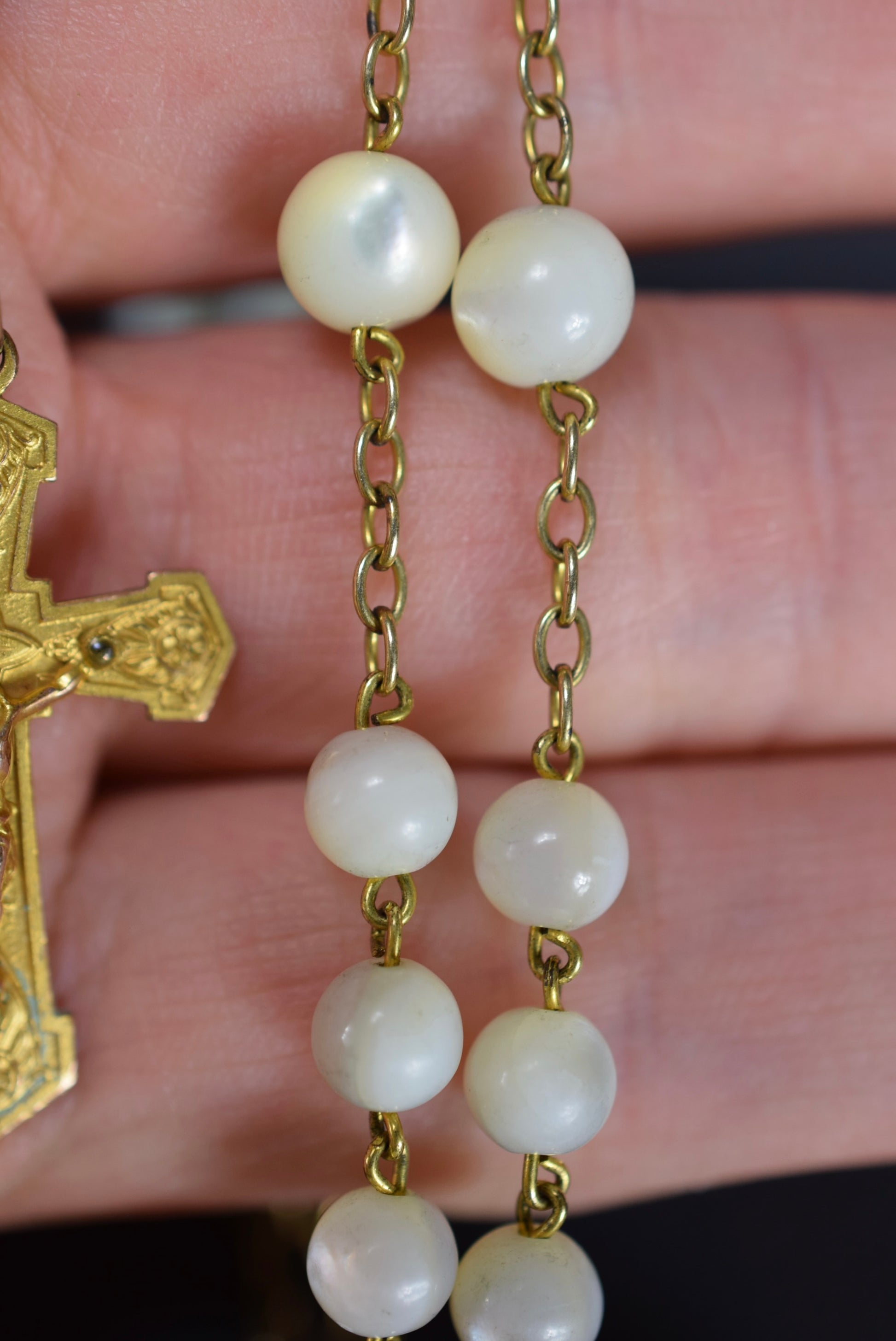 A fabulous and authentic French rosary from the 1940's. It is made of 59 mother of pearl beads and gold plated metal. The cross and the connector are finely crafted and marked France.