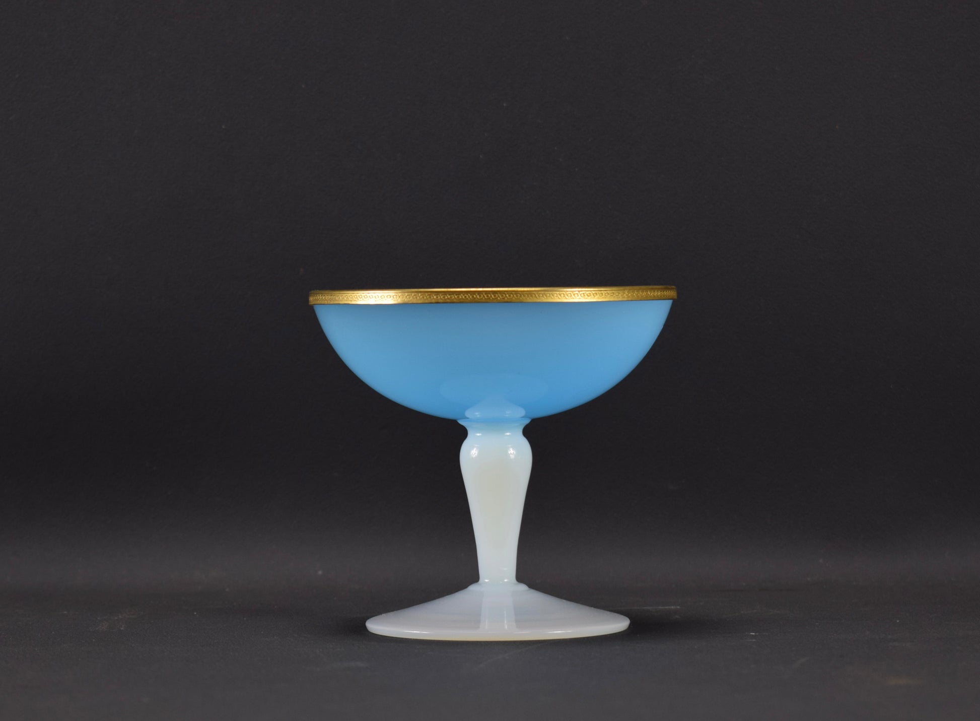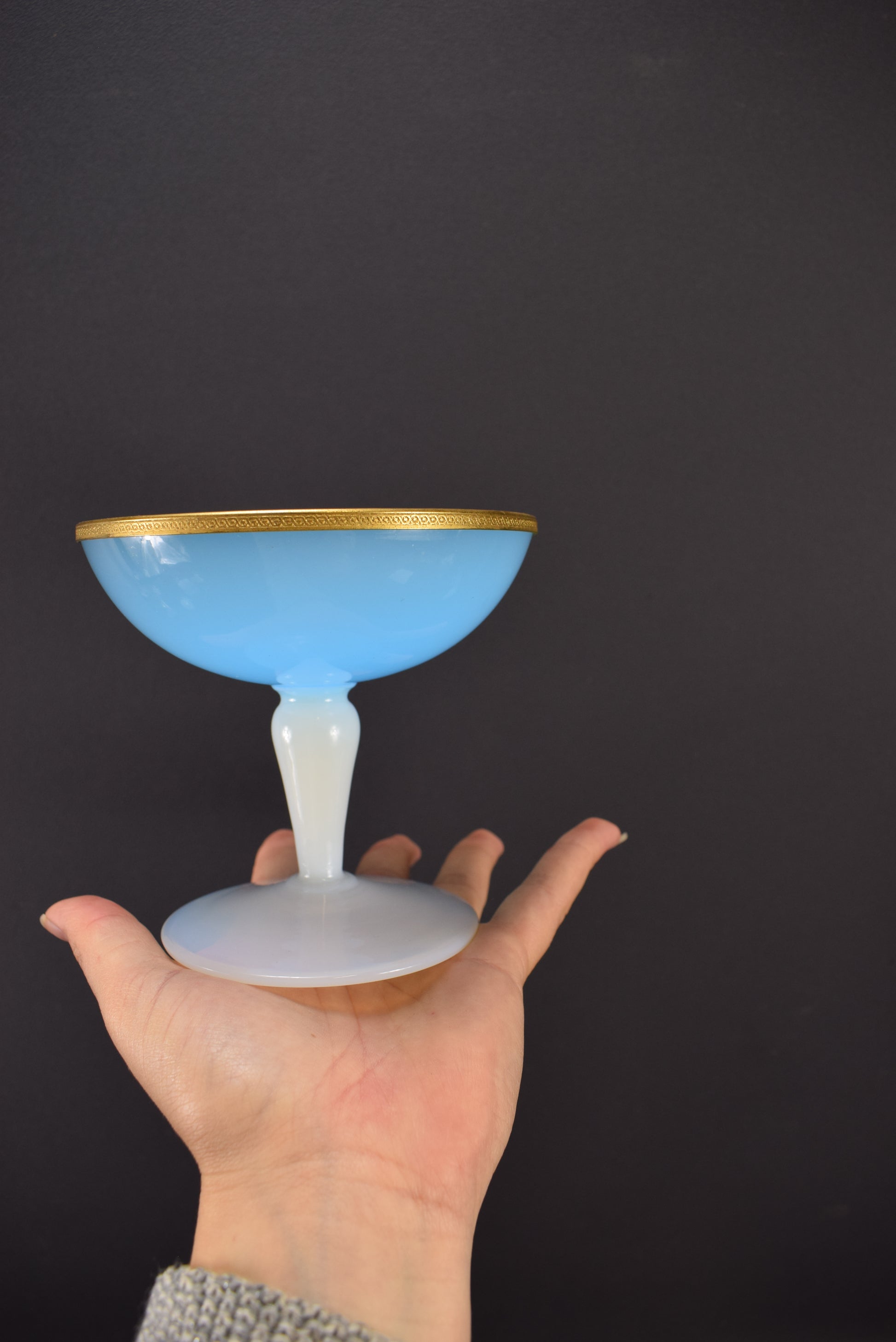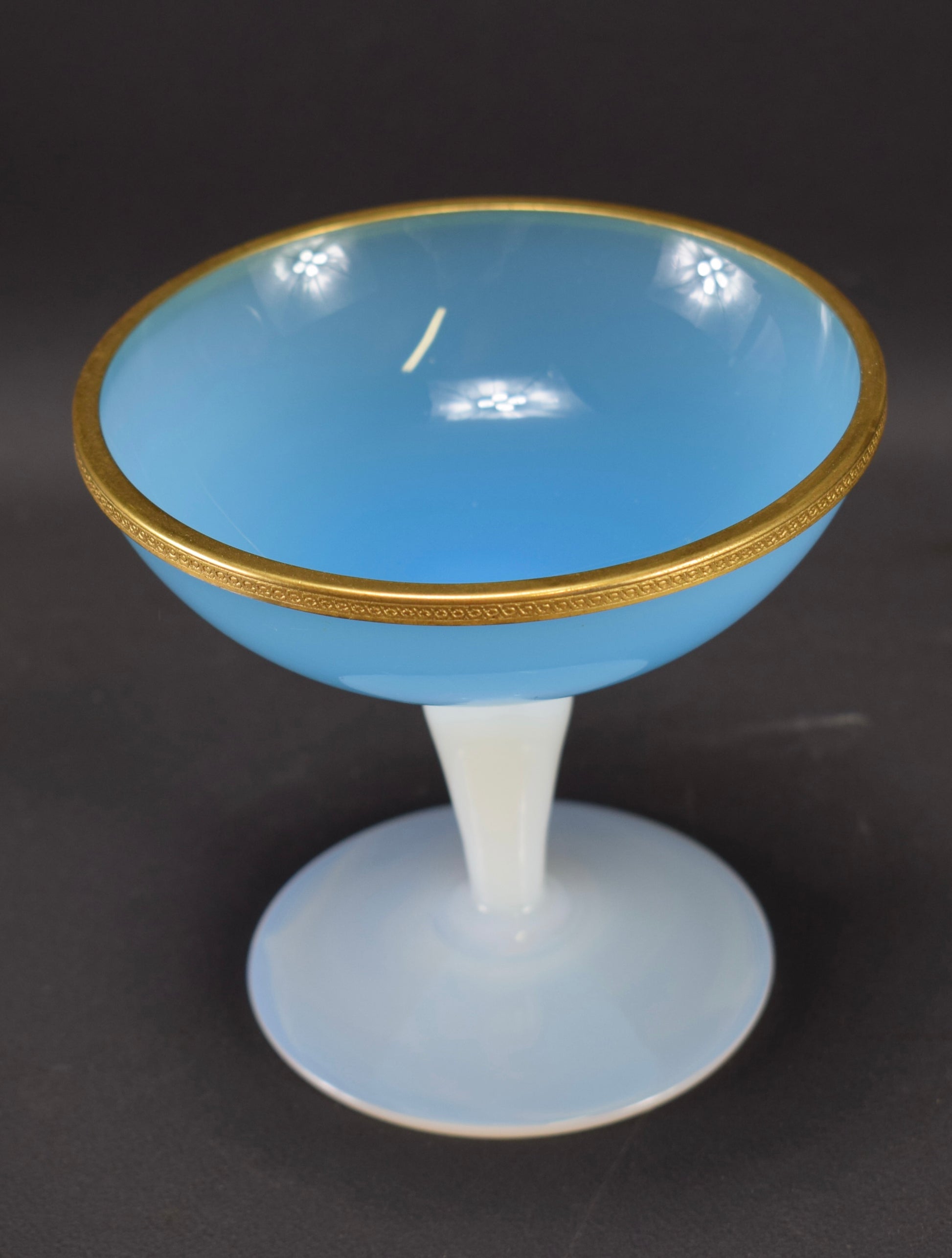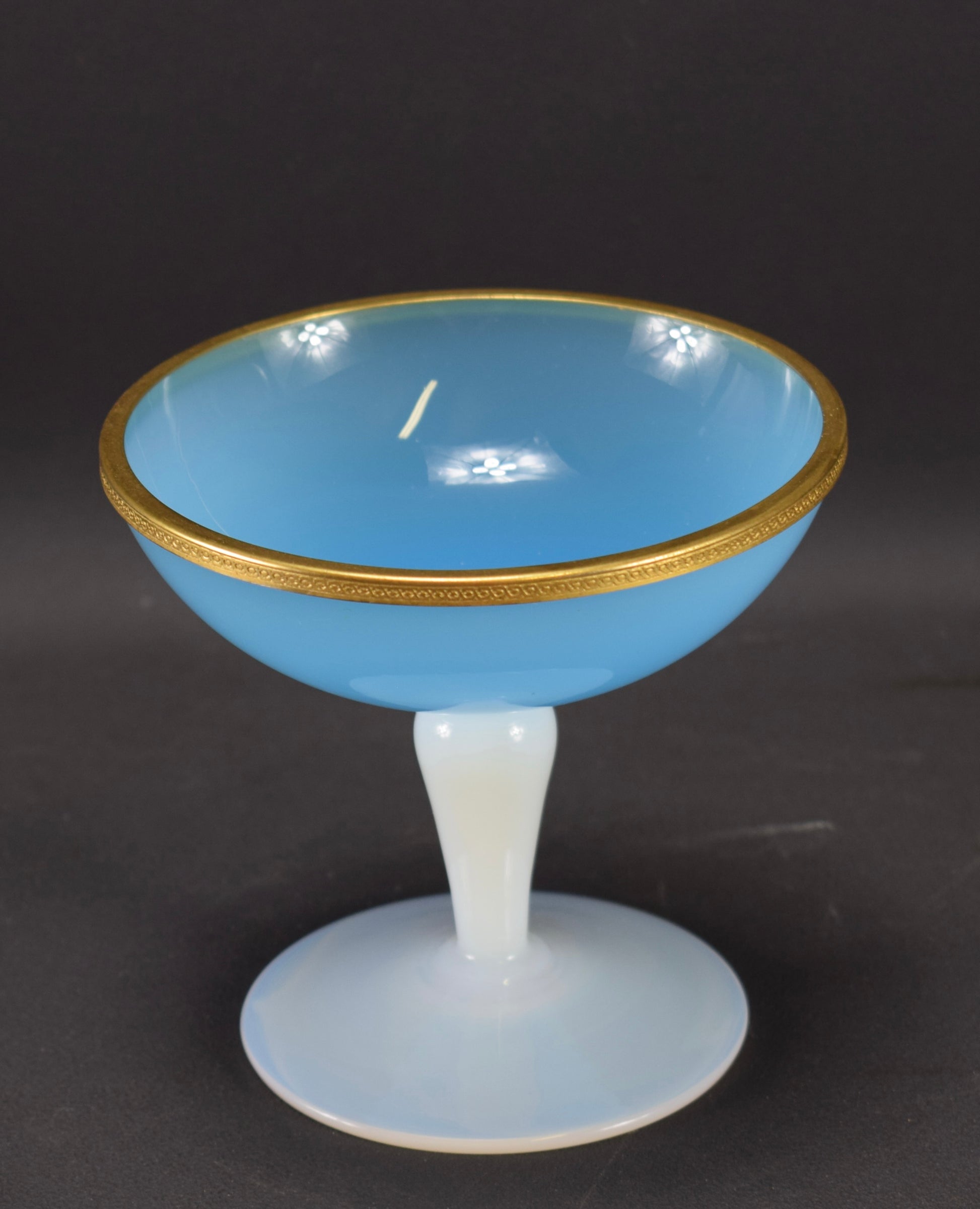 A delightful French rare blue and white opaline glass with brass dore mount compote from the 1950's. This vanity cup is called in France: "un baguier", it was made to put your small jewelry on the bowl (bedroom, bathroom). Very elegant vintage opaline piece, highly collectible.
