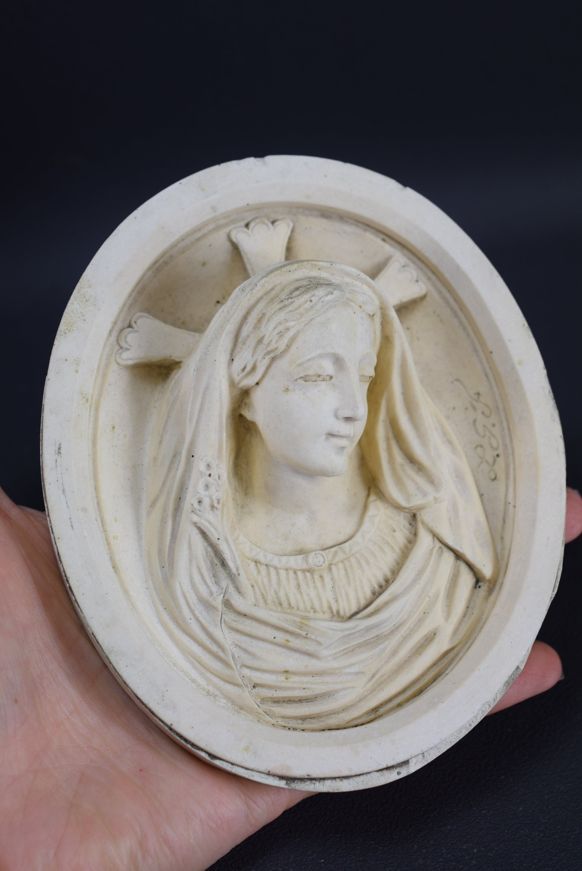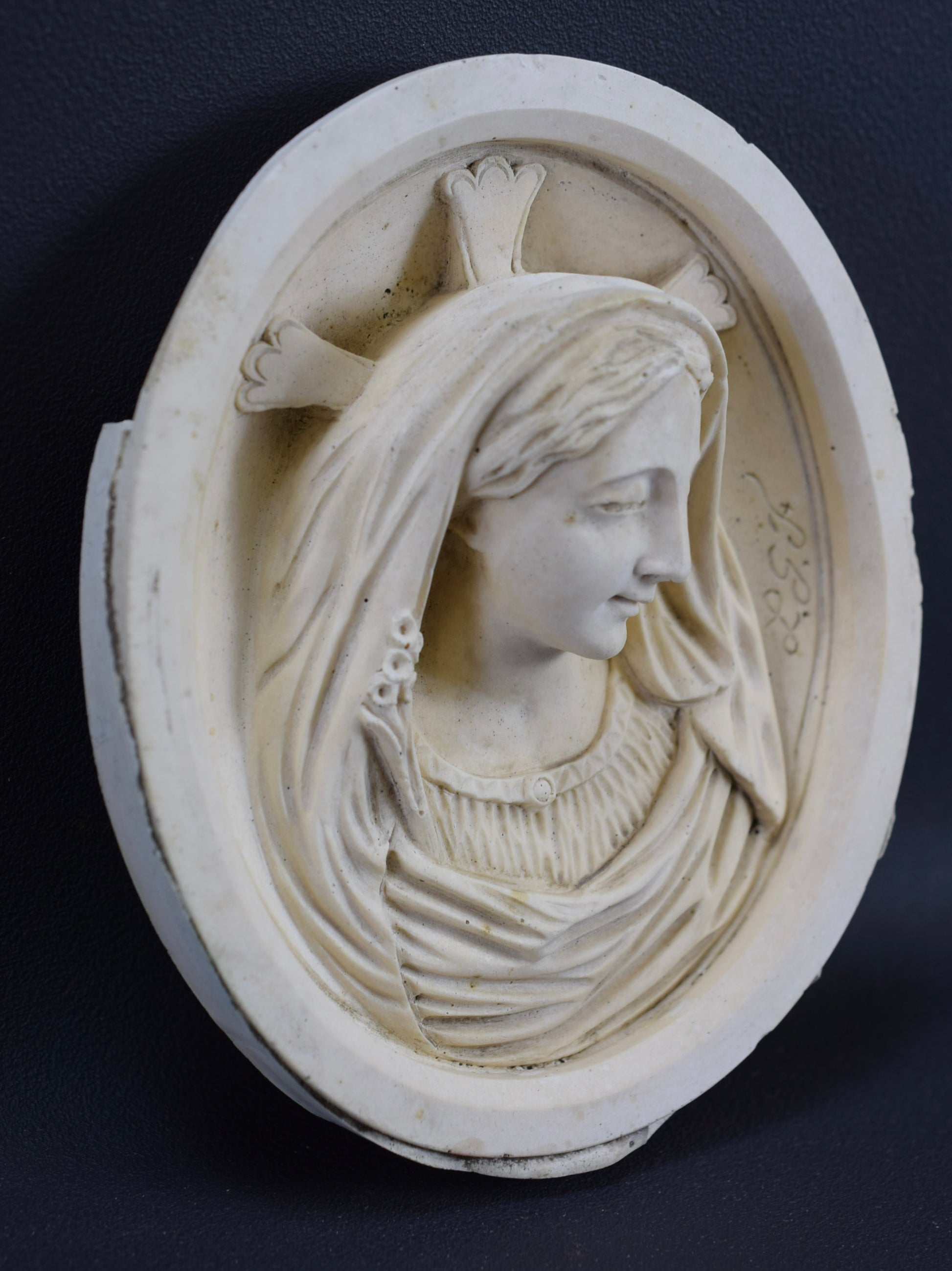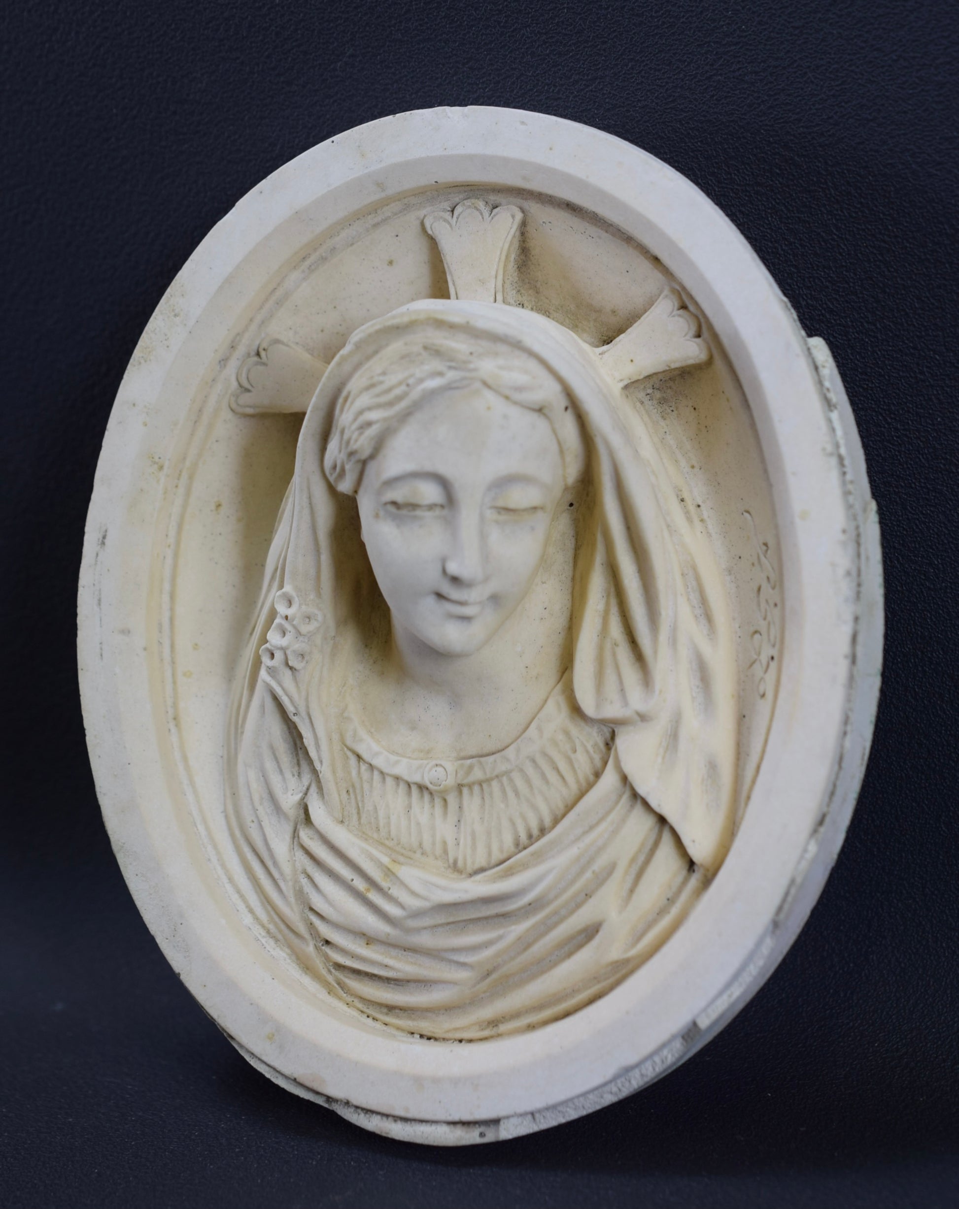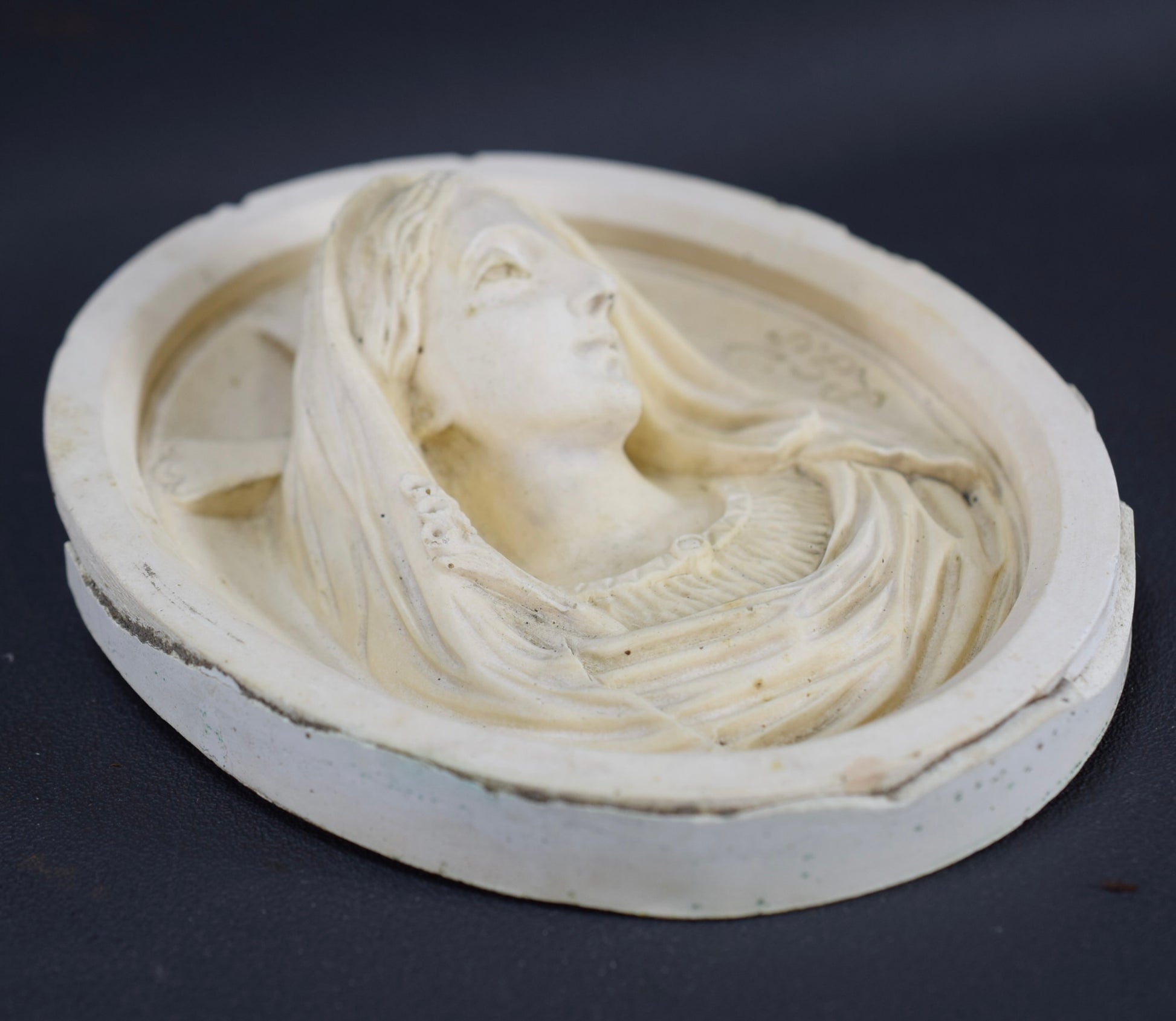 Antique French reliquary pendant made of carved soap plaster (imitating carved meerschaum). The carved medallion features a beautiful portrait of Mary. It certainly used to be a frame.