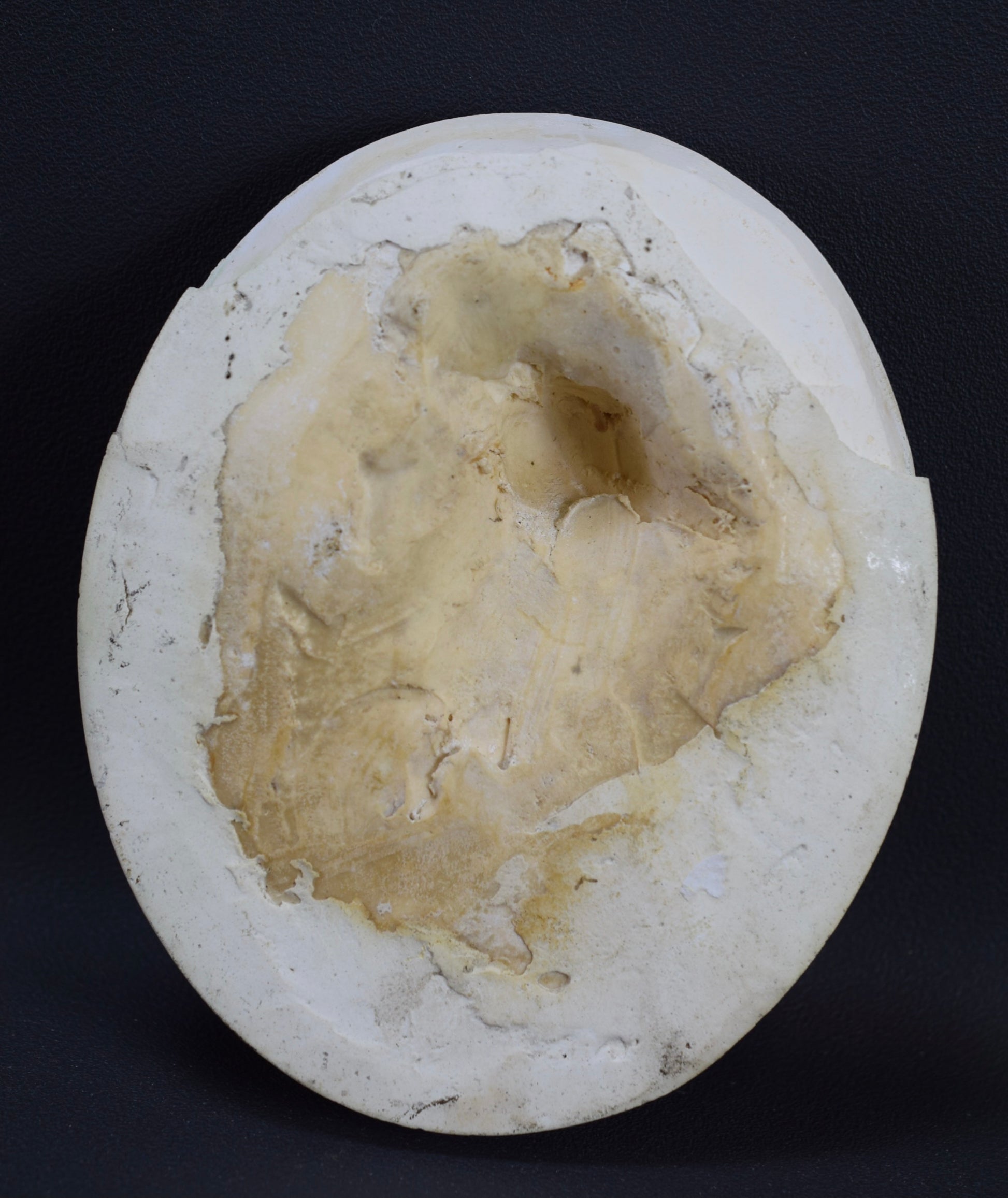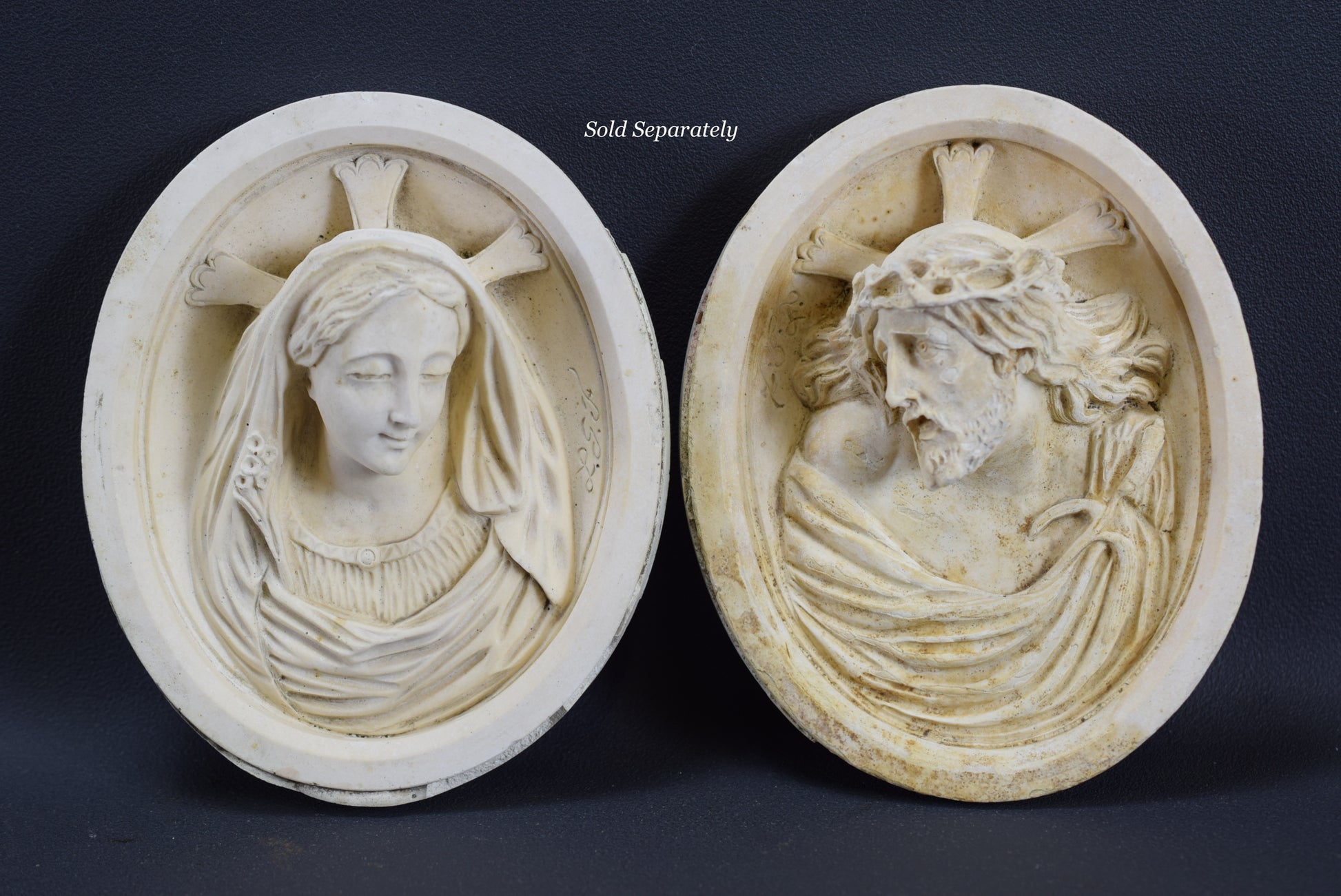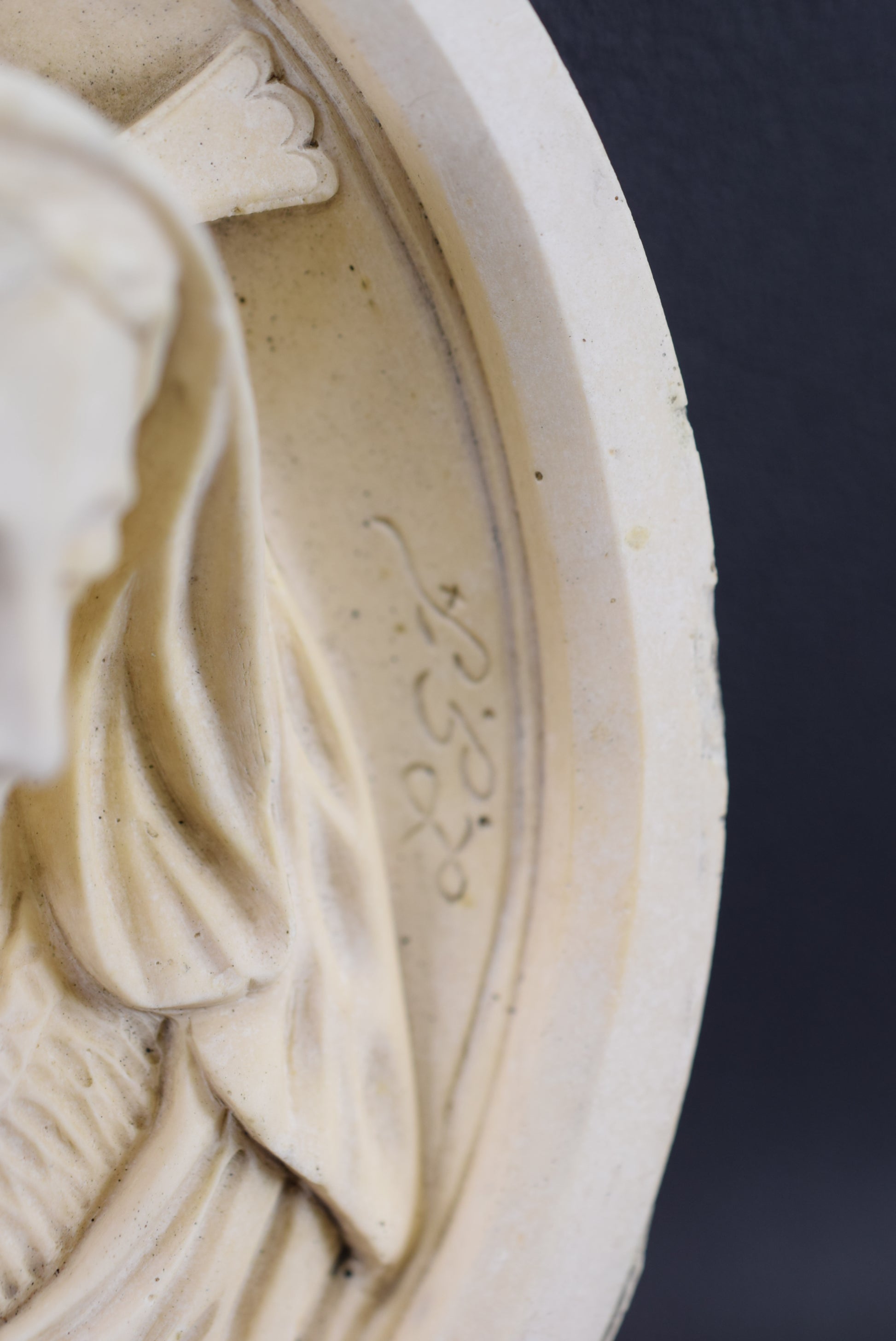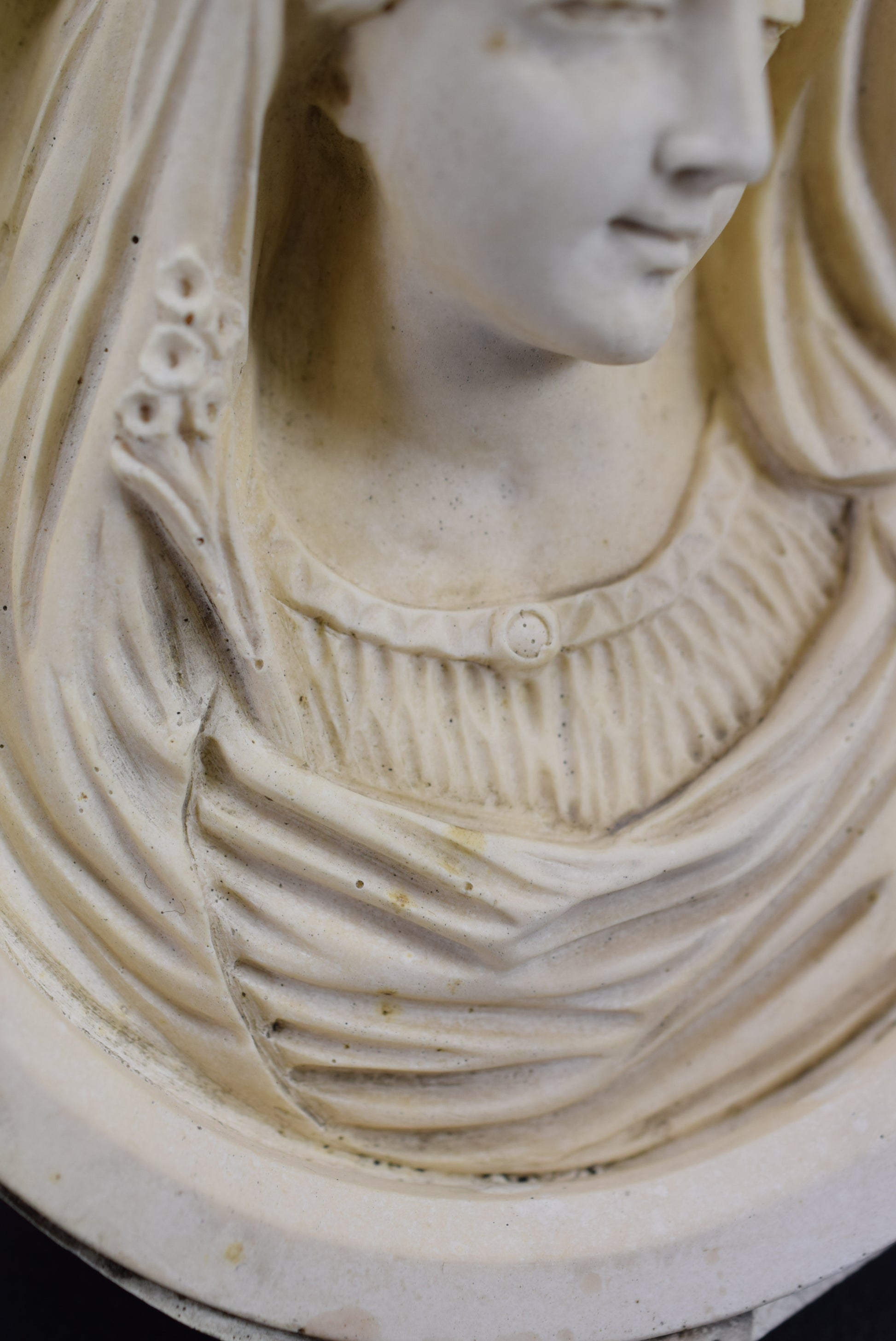 Antique French reliquary pendant made of carved soap plaster (imitating carved meerschaum). The carved medallion features a beautiful portrait of Mary. It certainly used to be a frame.