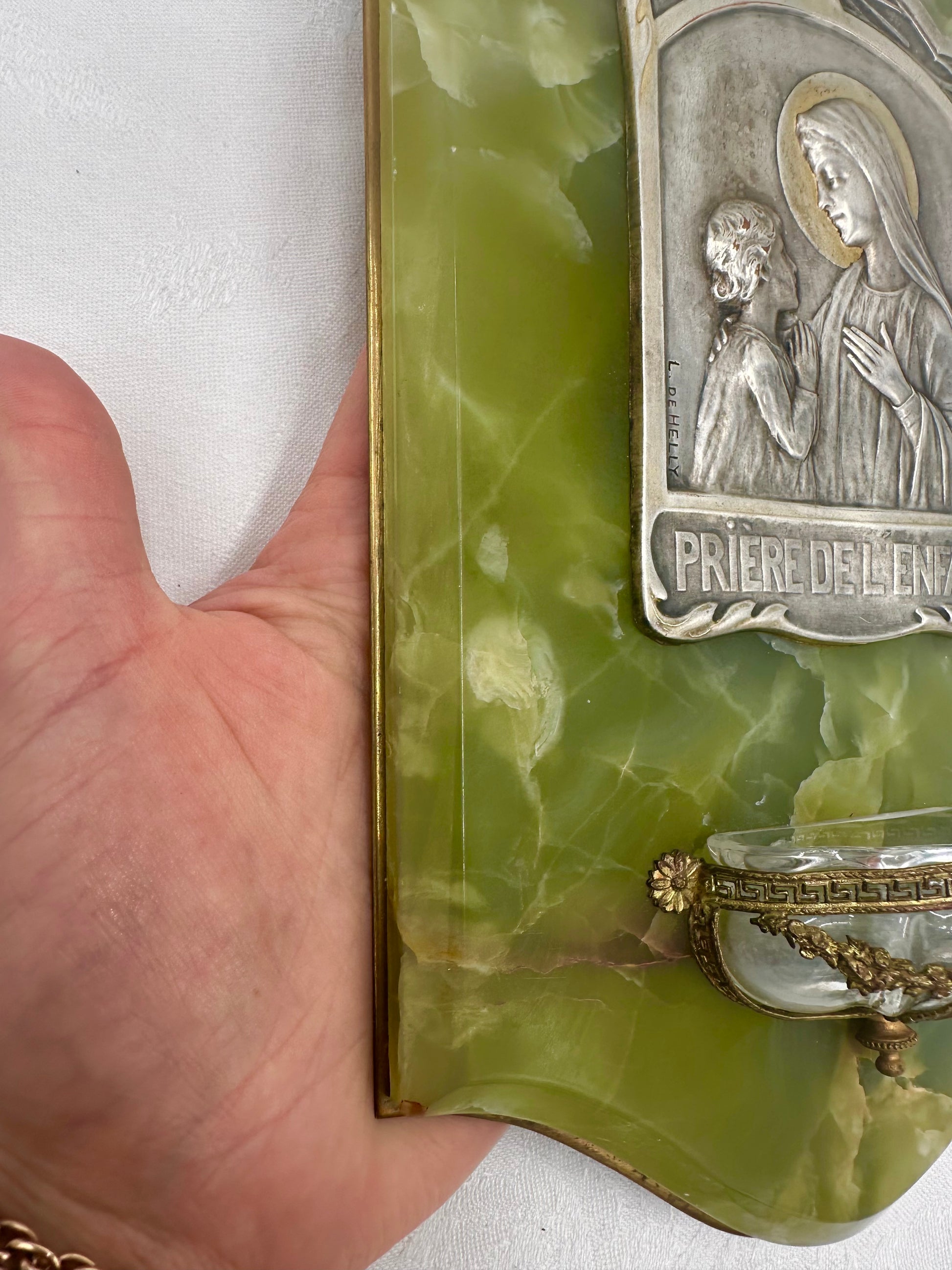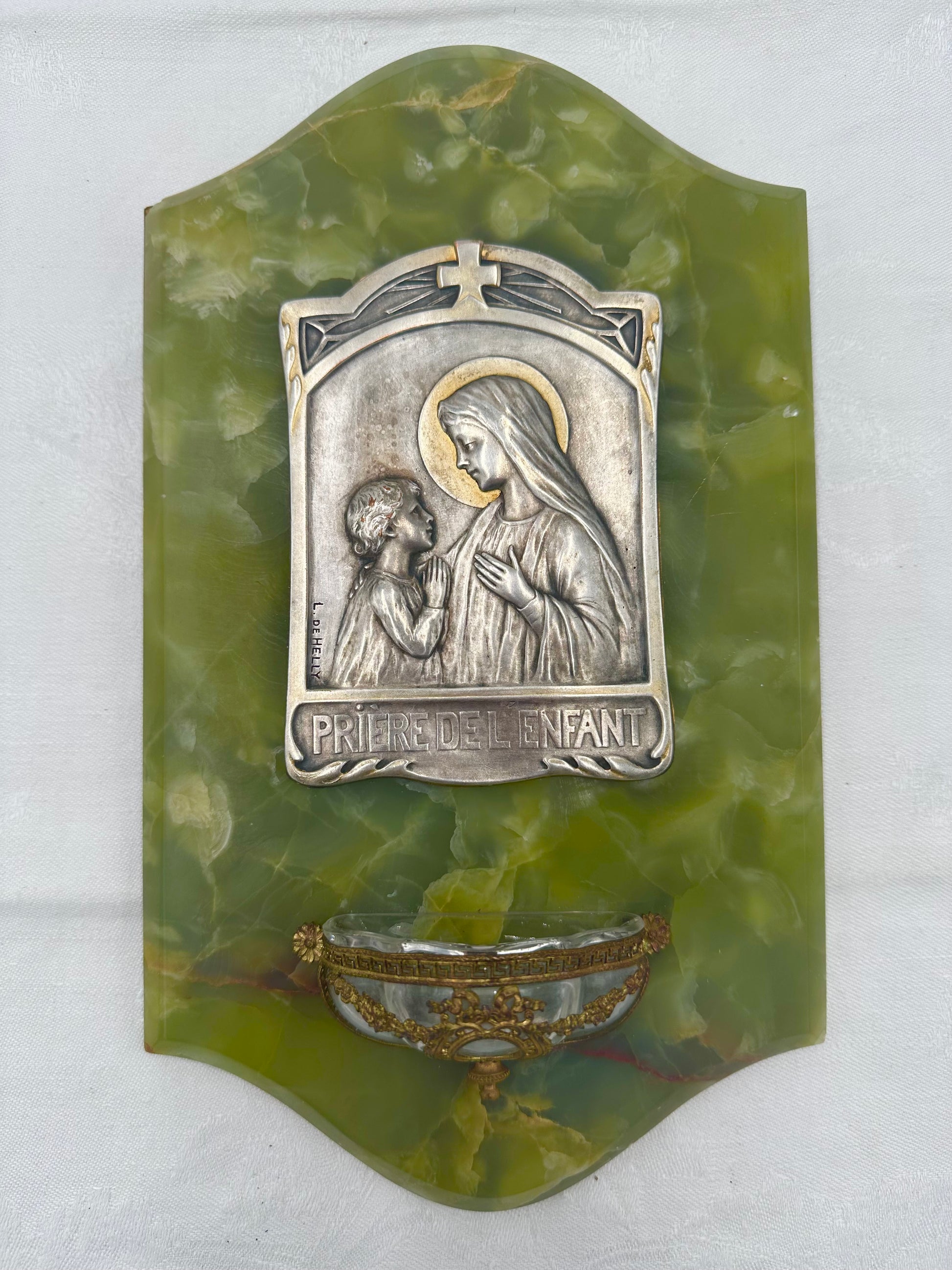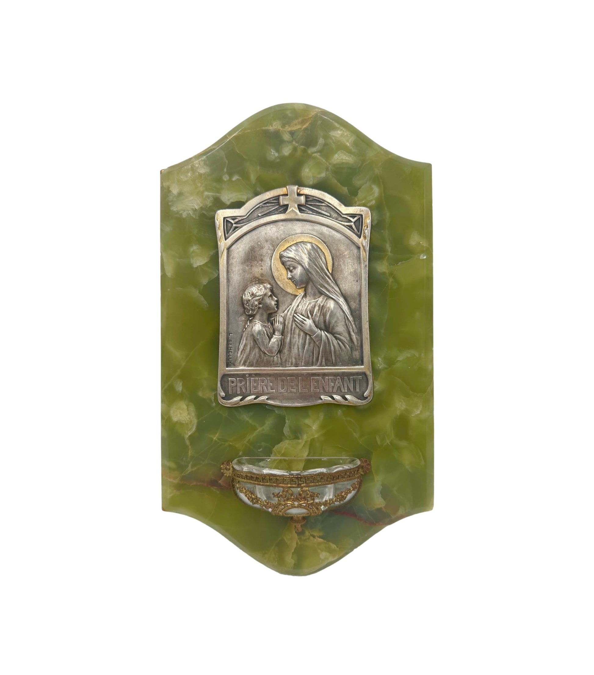 A fabulous antique wall holy water font dating to the early 20th century. The silver-plated brass plaque features a praying child in front of of Our lady Virgin Mary, the "Child's Prayer". It has been signed by the French artist L.de.Helly and is based on a gorgeous green onyx plaque. The glass water font is held by a brass mount, decorated with Louis XVI style motifs. The back is protected by a brass plaque. High quality piece with exceptional materials, handmade in France.