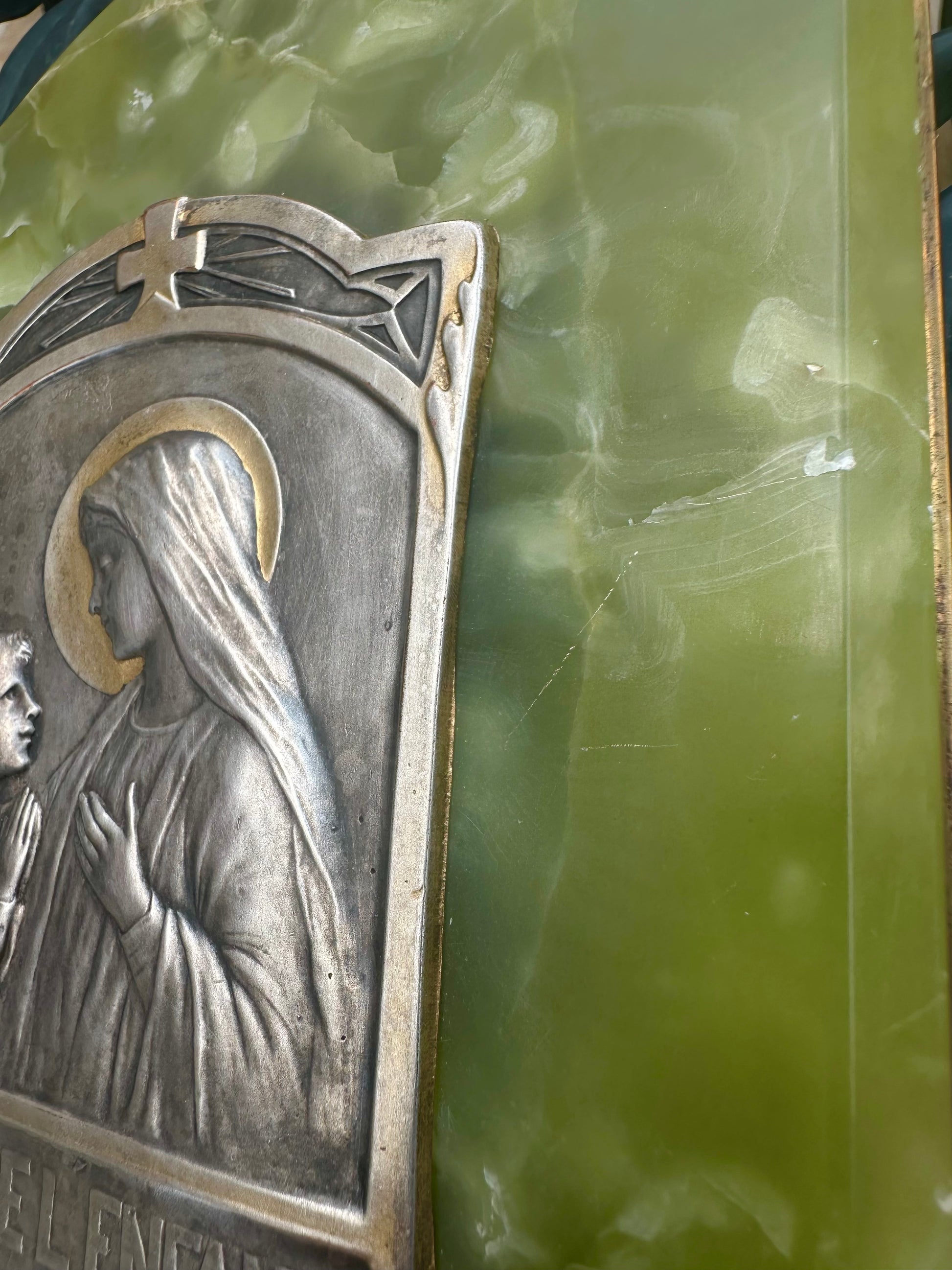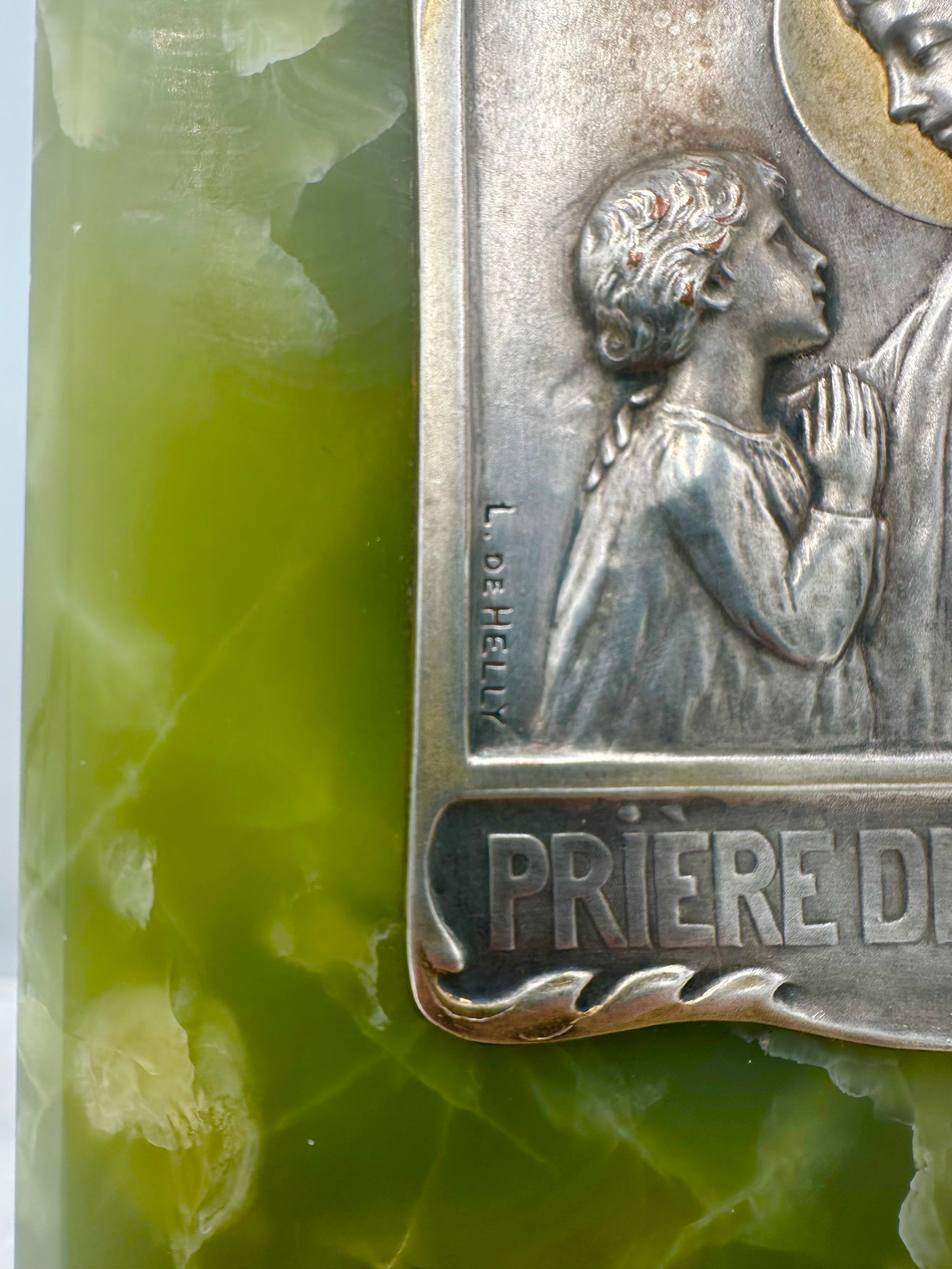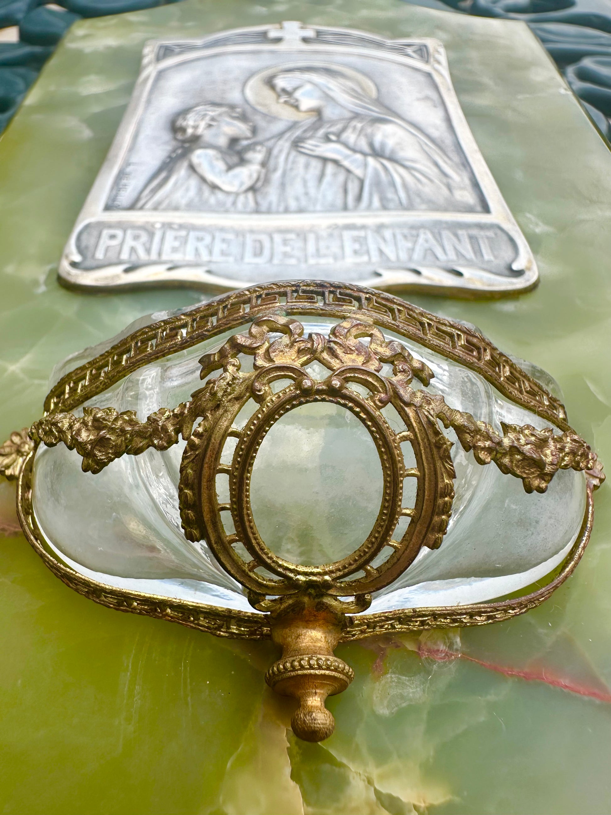 A fabulous antique wall holy water font dating to the early 20th century. The silver-plated brass plaque features a praying child in front of of Our lady Virgin Mary, the "Child's Prayer". It has been signed by the French artist L.de.Helly and is based on a gorgeous green onyx plaque. The glass water font is held by a brass mount, decorated with Louis XVI style motifs. The back is protected by a brass plaque. High quality piece with exceptional materials, handmade in France.