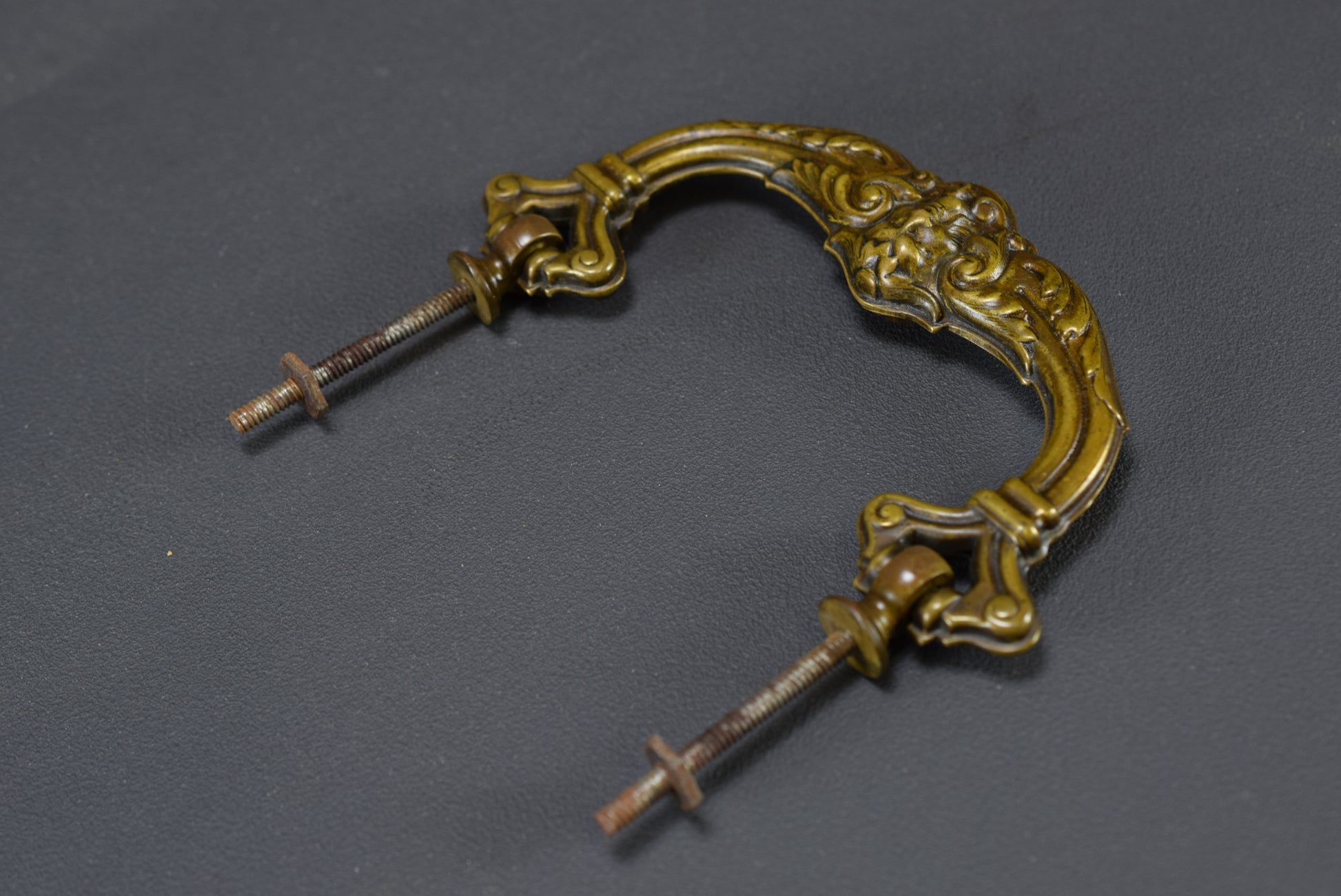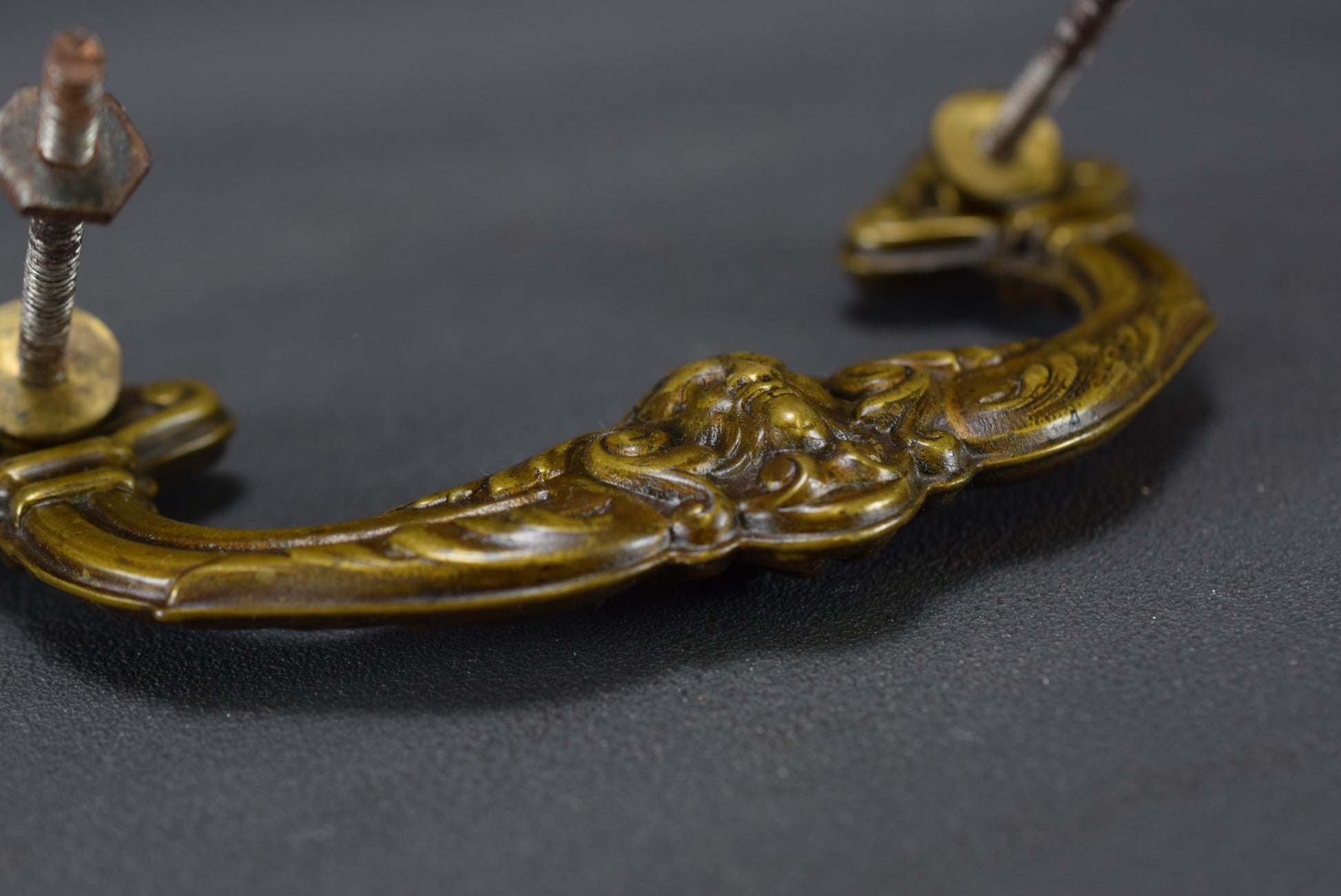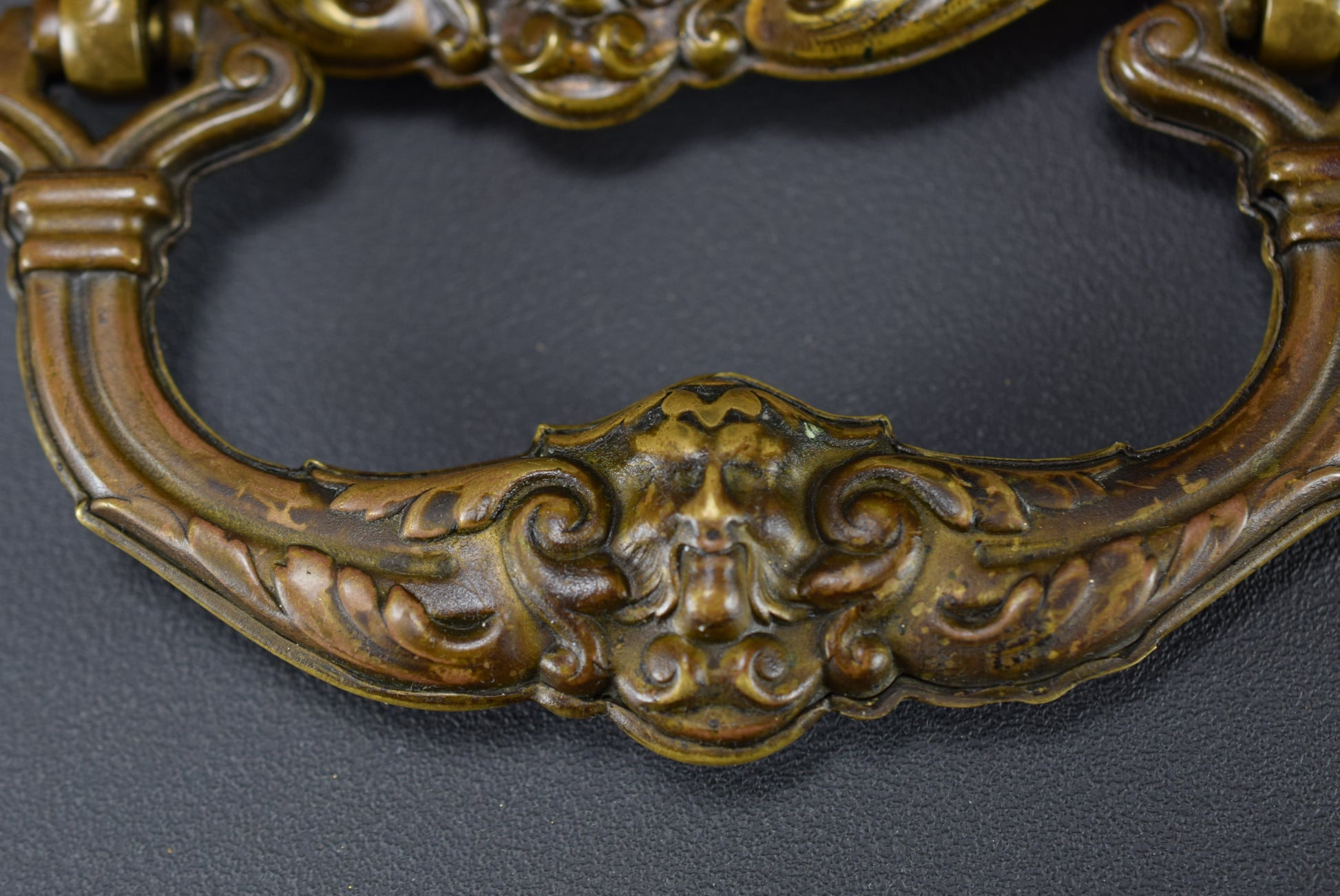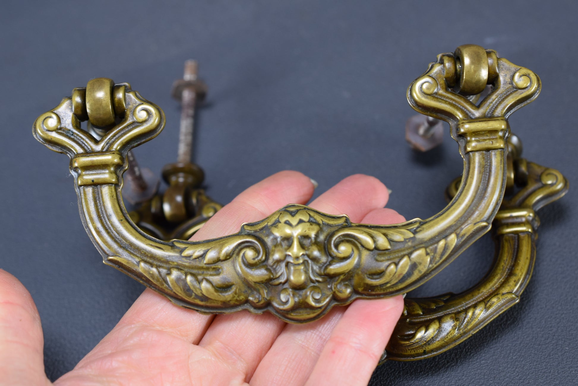 An antique pair of French salvaged pull handles made of light hollow metal. They feature Green Man faces and date from the early 20th century. Repurpose hardware, supplies.