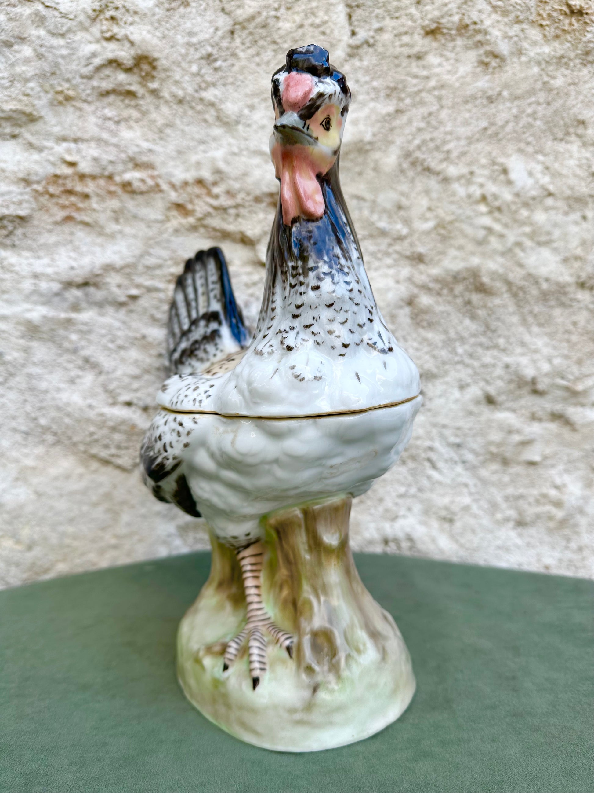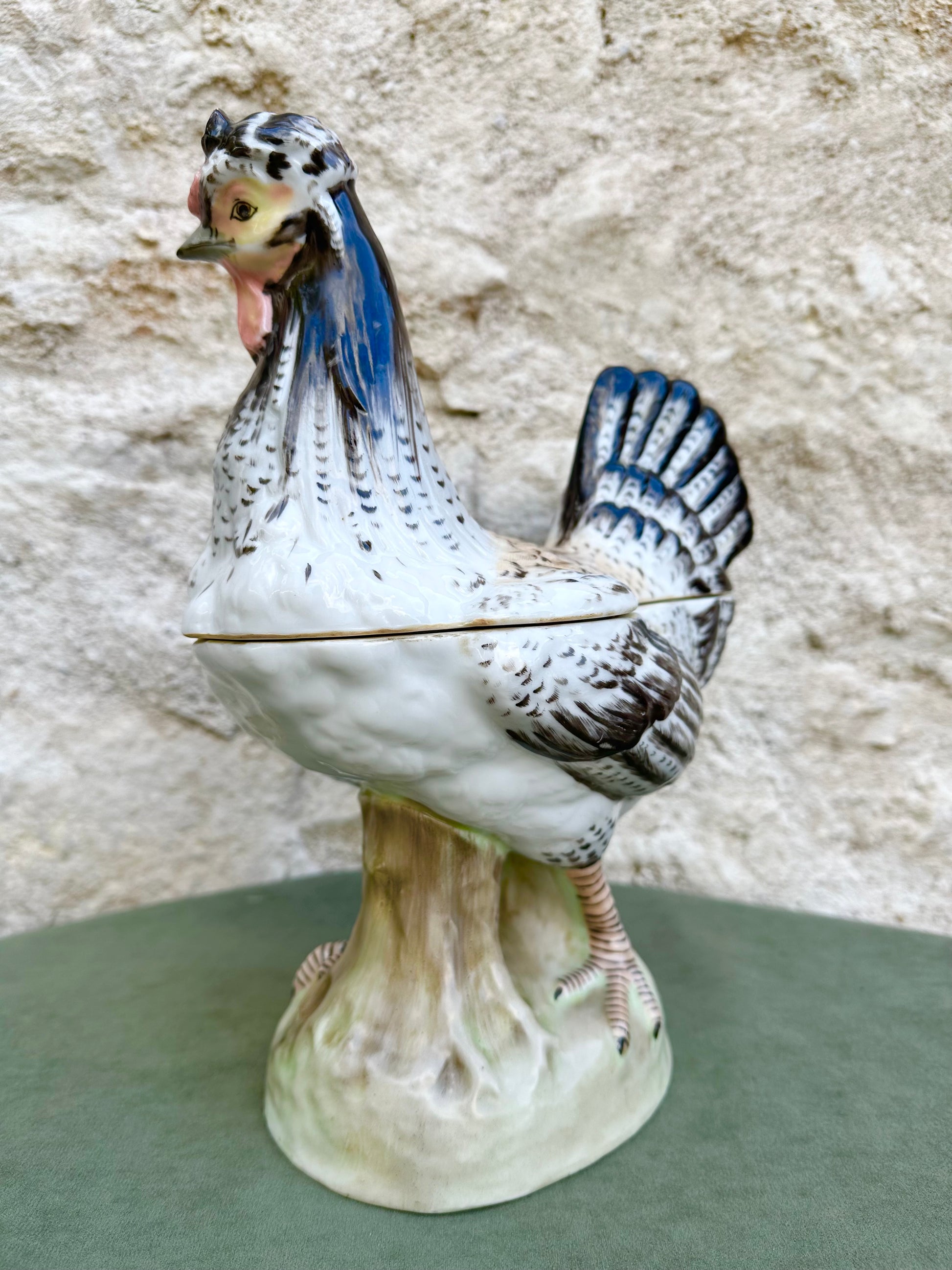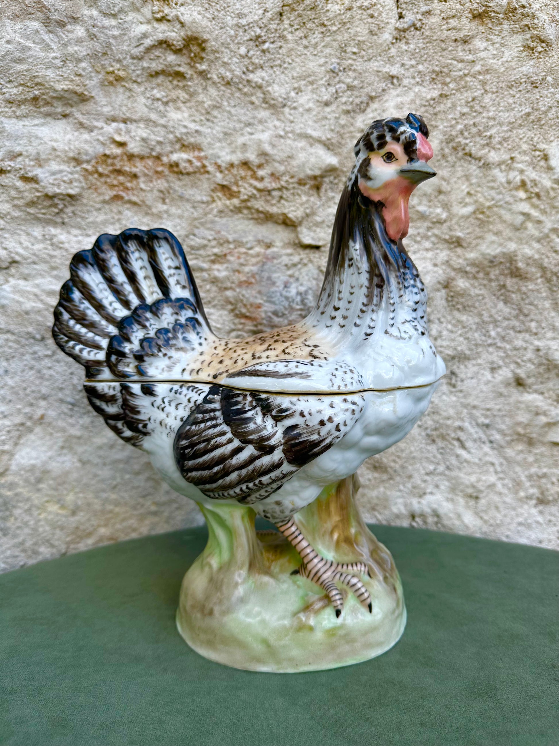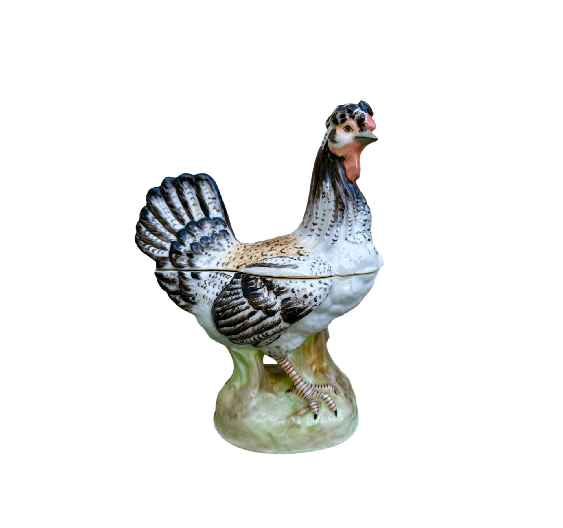 This rare German antique porcelain covered box, crafted by Passau, Dressel, Kister & Co. in the early 20th century, is a charming and finely detailed piece, shaped in the form of a hen. The box features a hand-painted design, with vibrant, lifelike coloring on the hen’s feathers, meticulously rendered in soft shades of white, brown, and delicate touches of red on the comb and wattle. The hen’s eyes are expressive, adding character to the piece, while the feathers are sculpted with exquisite detail, showcasing the craftsmanship of the Passau porcelain makers.