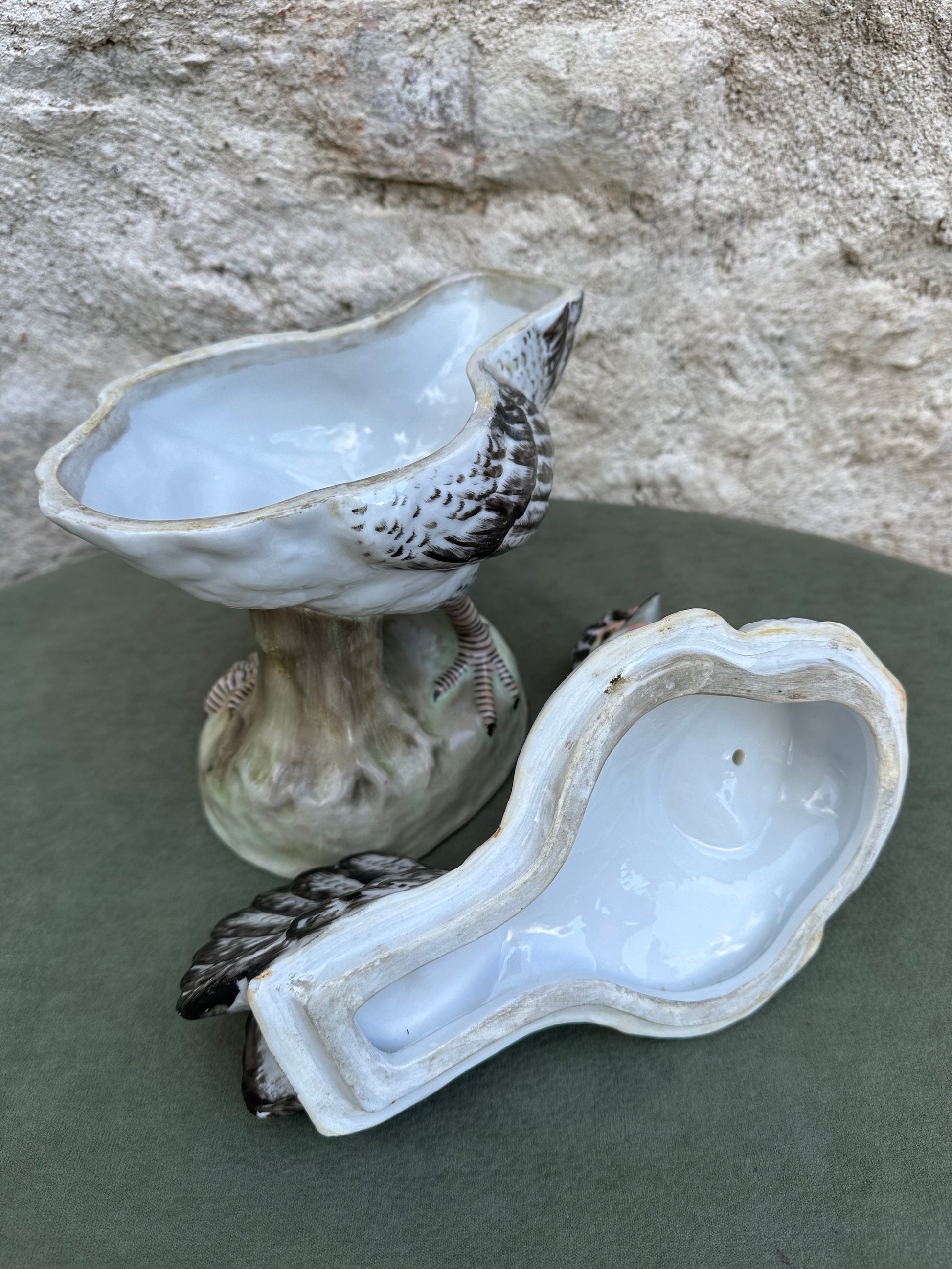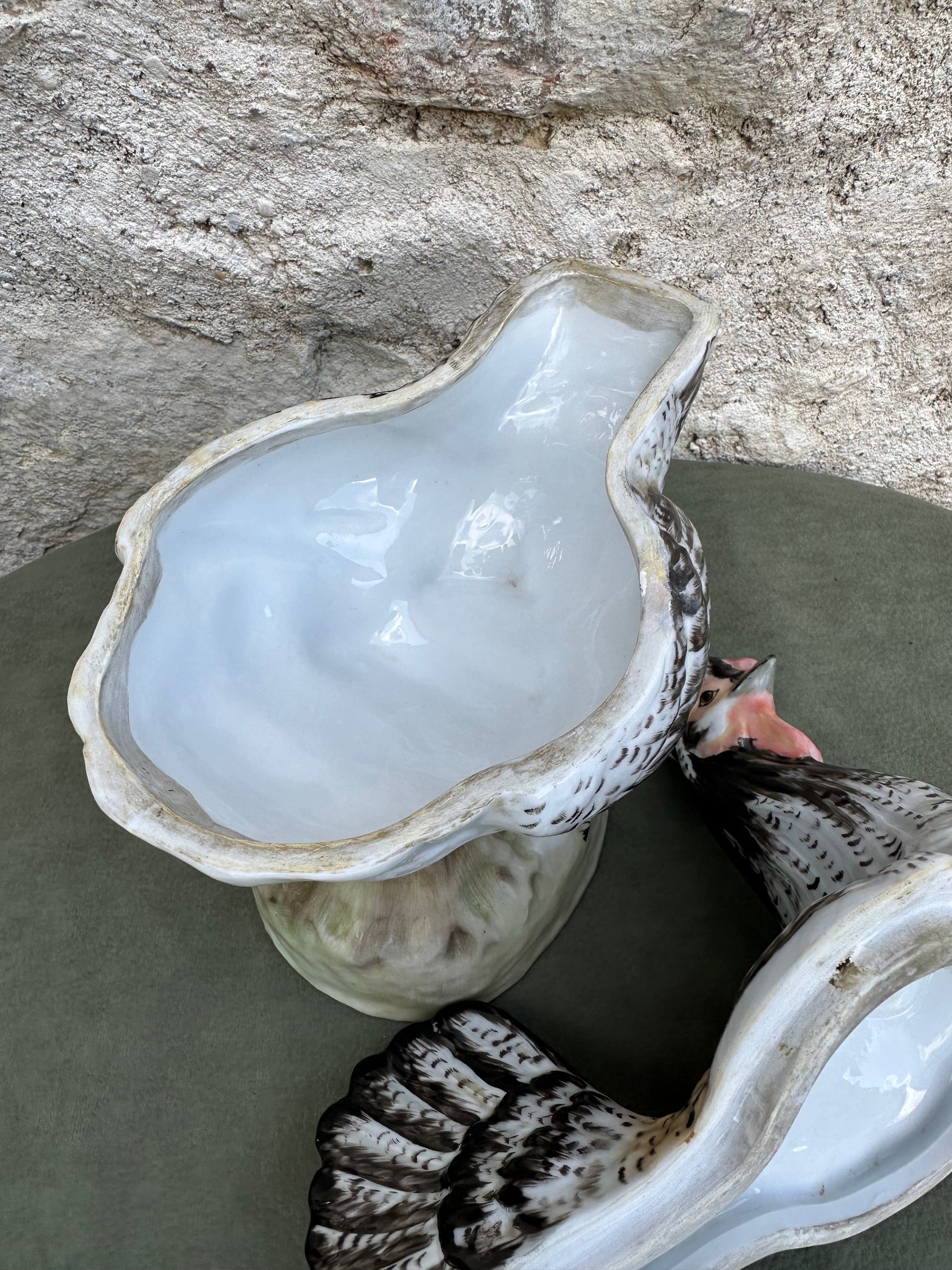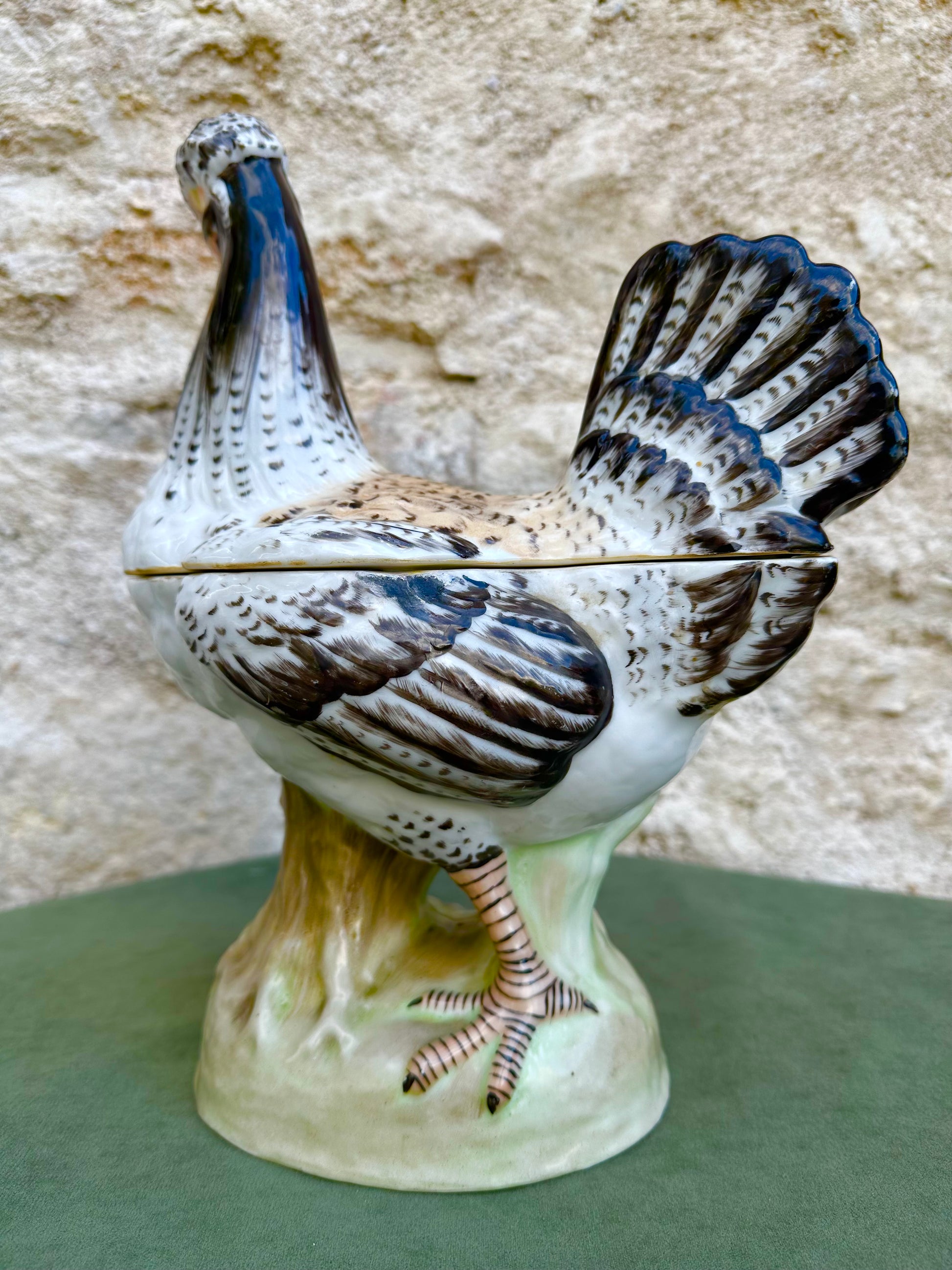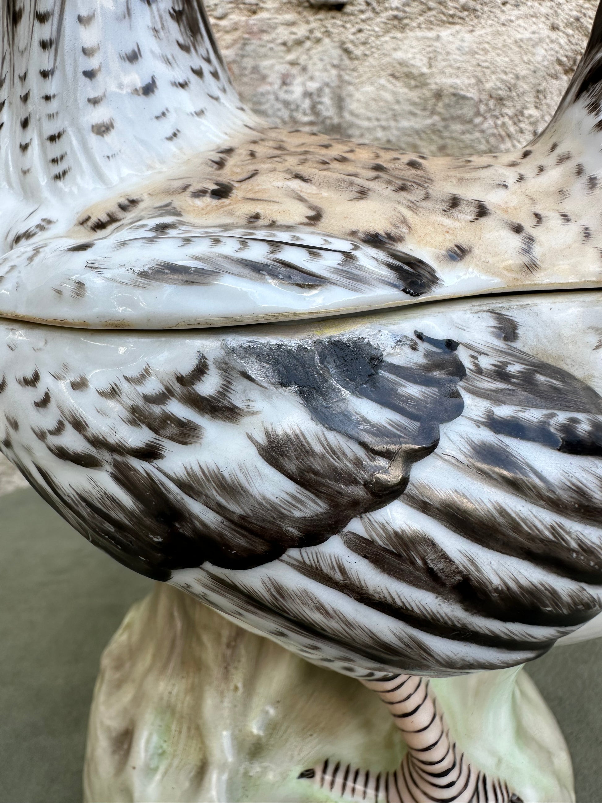 This rare German antique porcelain covered box, crafted by Passau, Dressel, Kister & Co. in the early 20th century, is a charming and finely detailed piece, shaped in the form of a hen. The box features a hand-painted design, with vibrant, lifelike coloring on the hen’s feathers, meticulously rendered in soft shades of white, brown, and delicate touches of red on the comb and wattle. The hen’s eyes are expressive, adding character to the piece, while the feathers are sculpted with exquisite detail, showcasing the craftsmanship of the Passau porcelain makers.