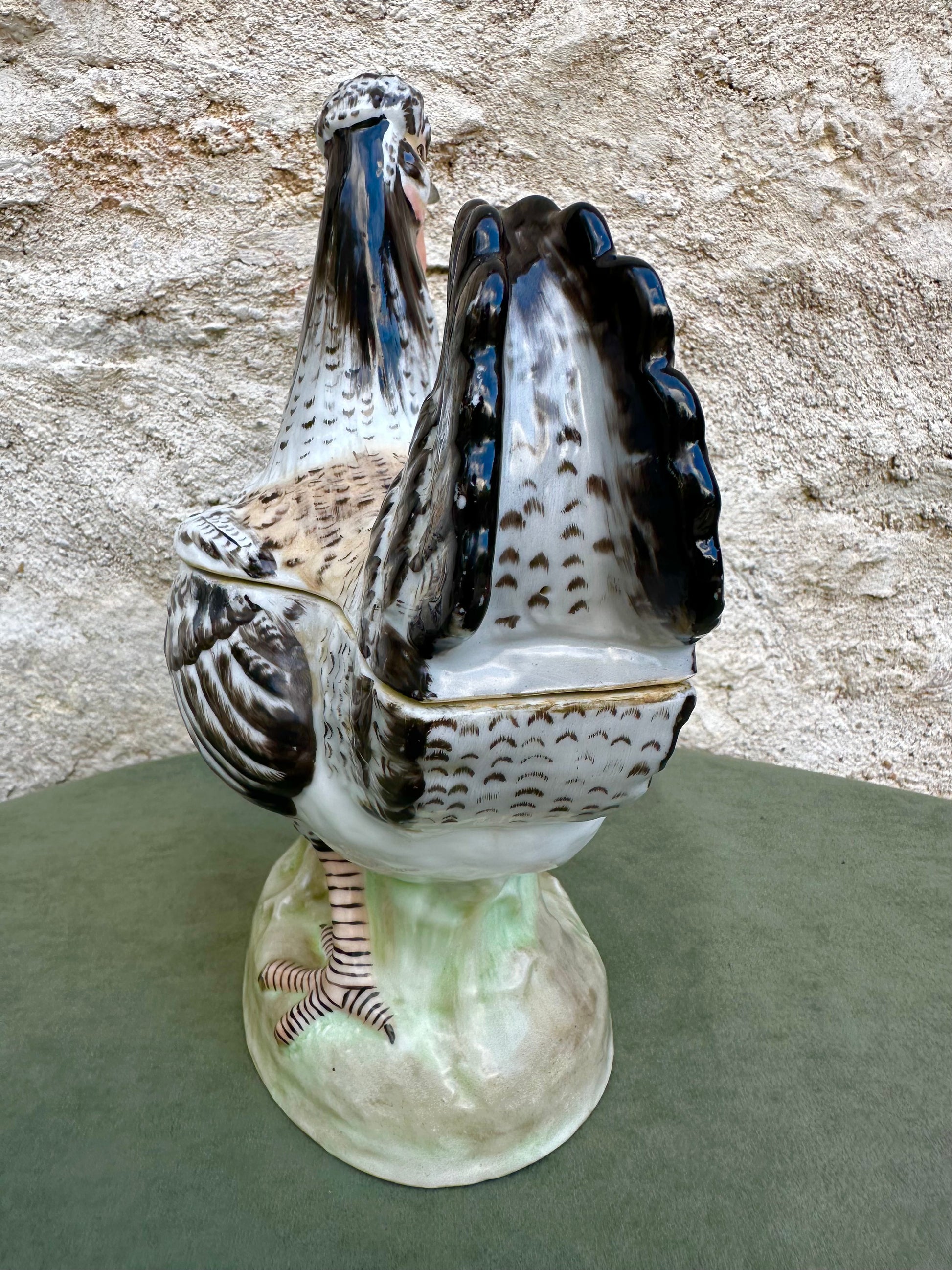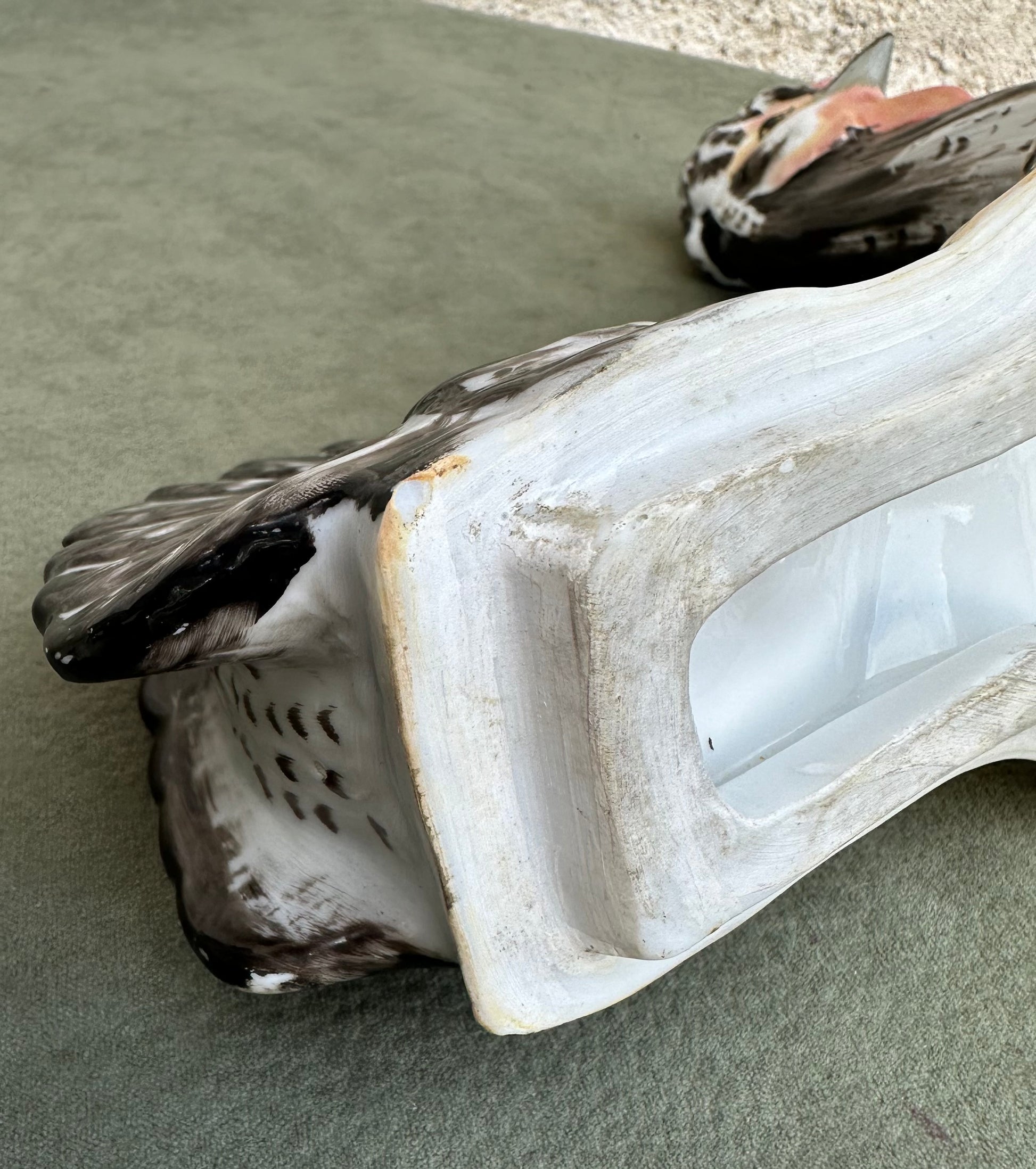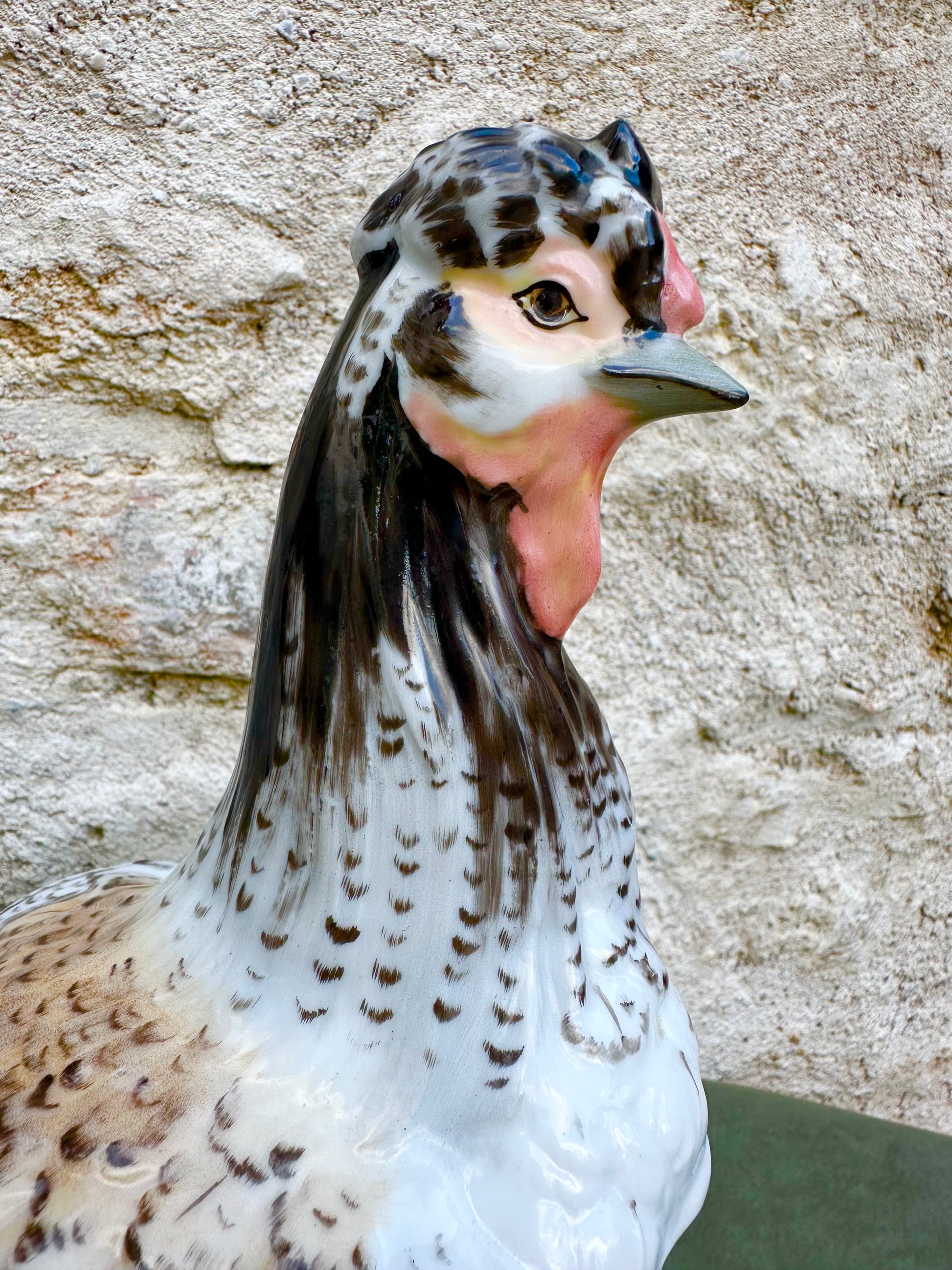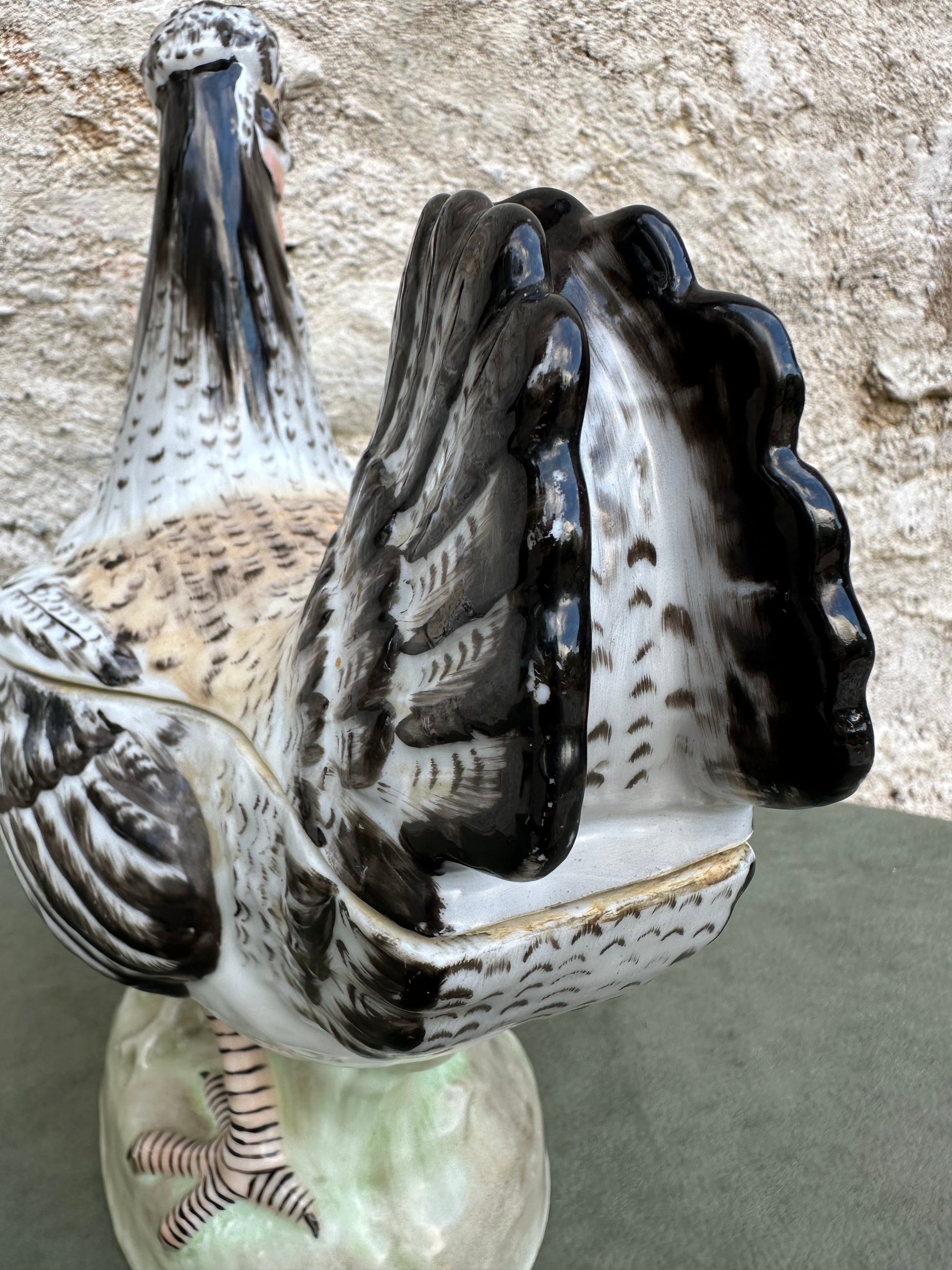 This rare German antique porcelain covered box, crafted by Passau, Dressel, Kister & Co. in the early 20th century, is a charming and finely detailed piece, shaped in the form of a hen. The box features a hand-painted design, with vibrant, lifelike coloring on the hen’s feathers, meticulously rendered in soft shades of white, brown, and delicate touches of red on the comb and wattle. The hen’s eyes are expressive, adding character to the piece, while the feathers are sculpted with exquisite detail, showcasing the craftsmanship of the Passau porcelain makers.