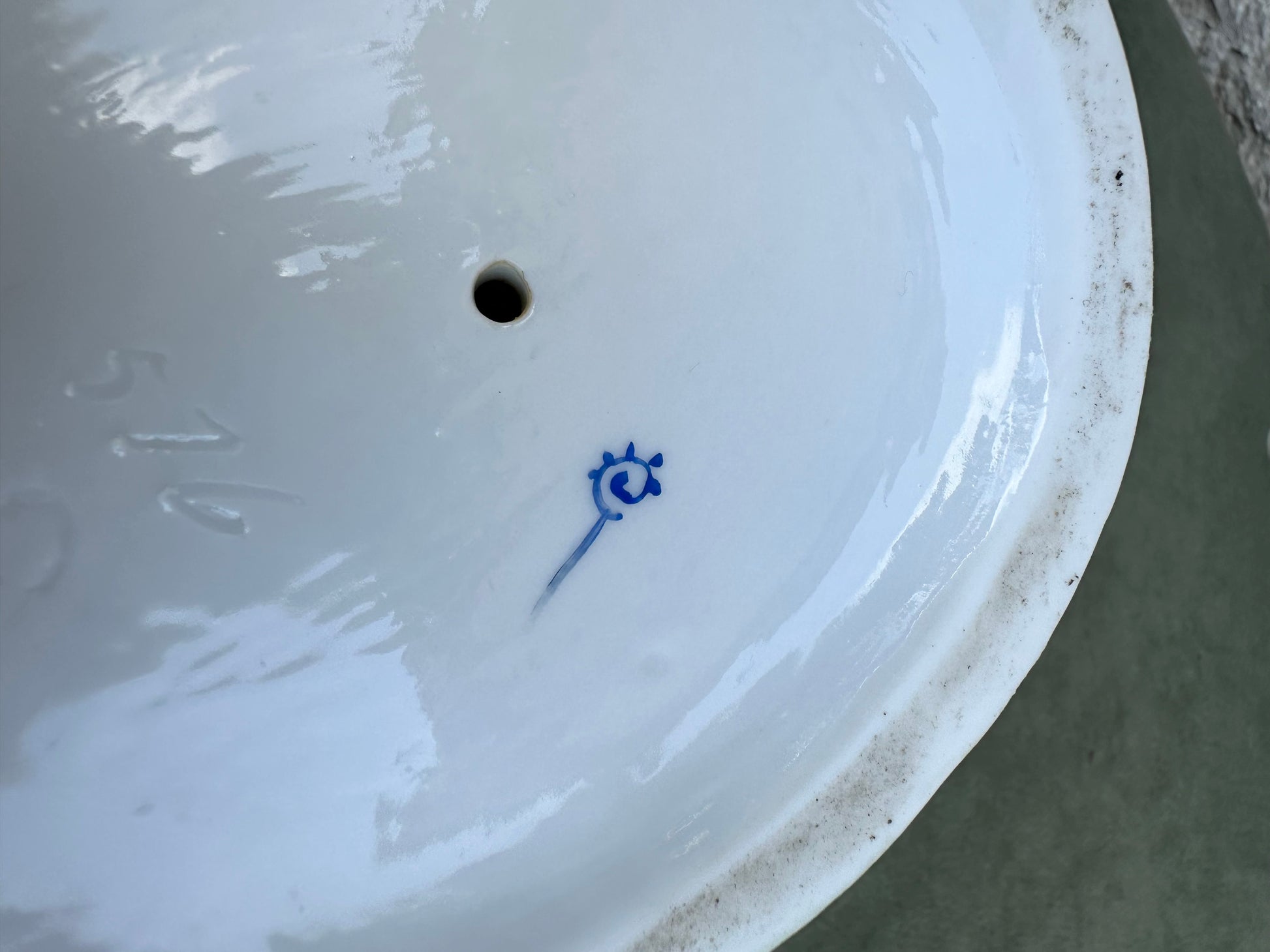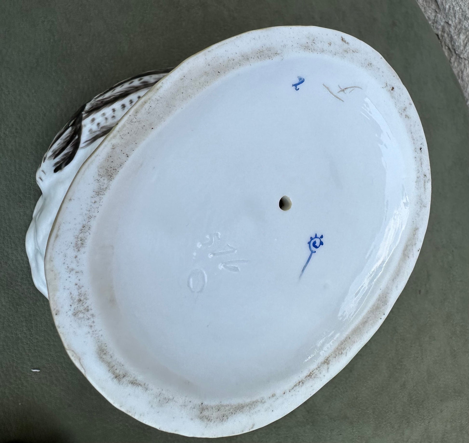 The box opens at the center, revealing a compartment, and was likely used for storing small treasures or trinkets. It may have been used a terrine, a paté dish. The glaze has a soft sheen, characteristic of fine porcelain, with the base marked by the company’s signature stamp. This collectible porcelain box represents the high-quality artistry of Dressel, Kister & Co., known for their sophisticated porcelain works, and remains an exceptional example of early 20th-century German decorative arts.