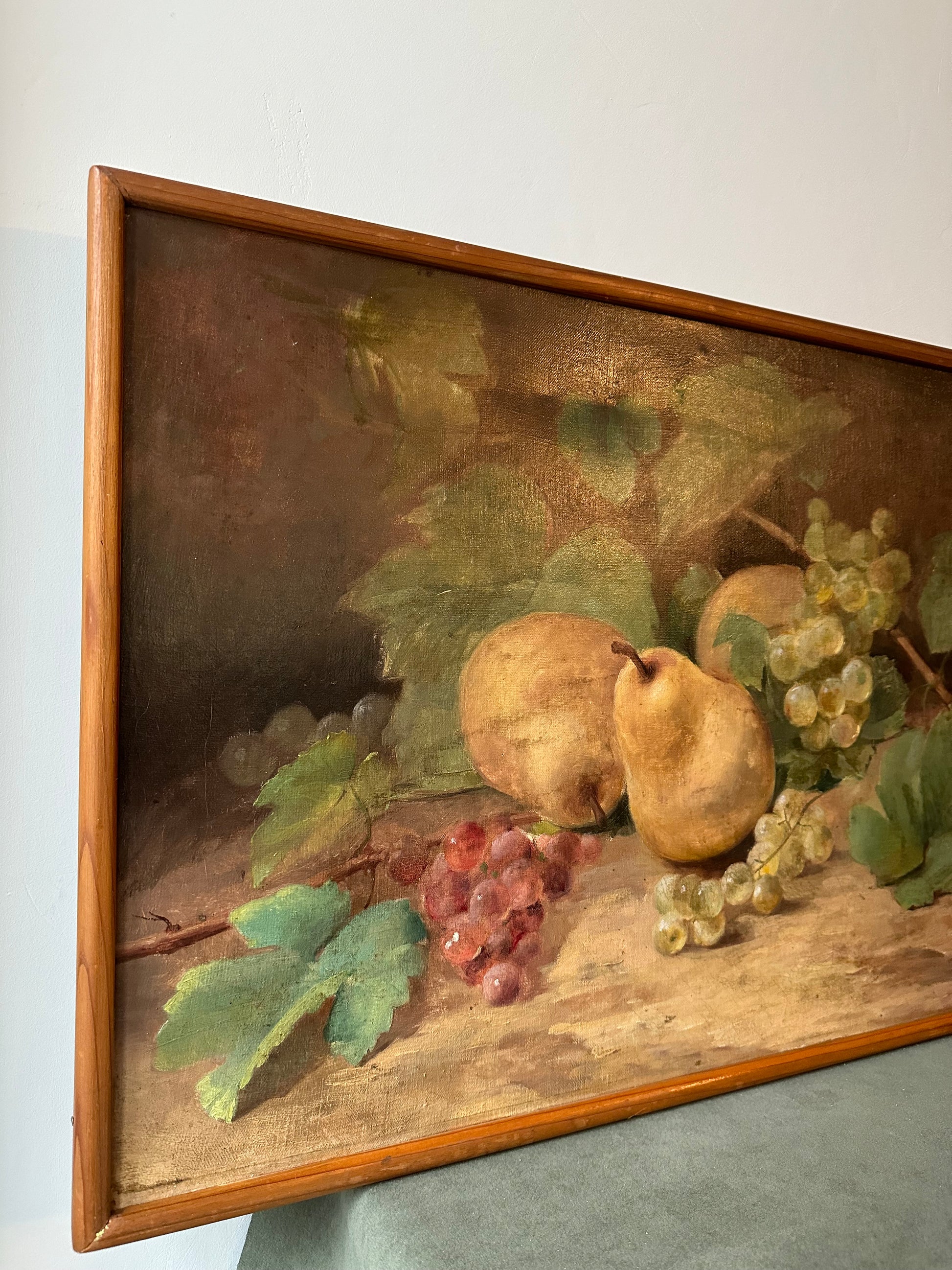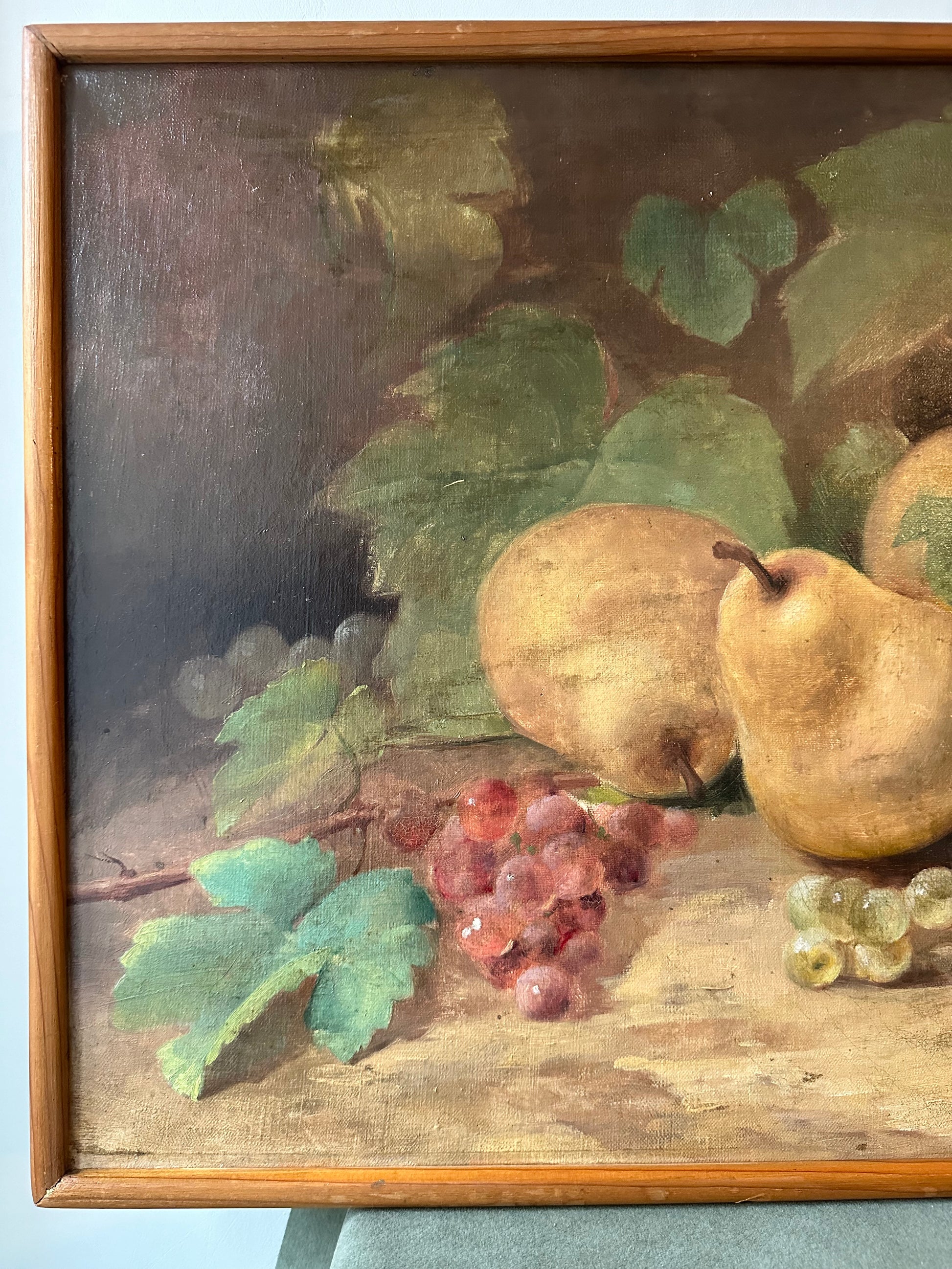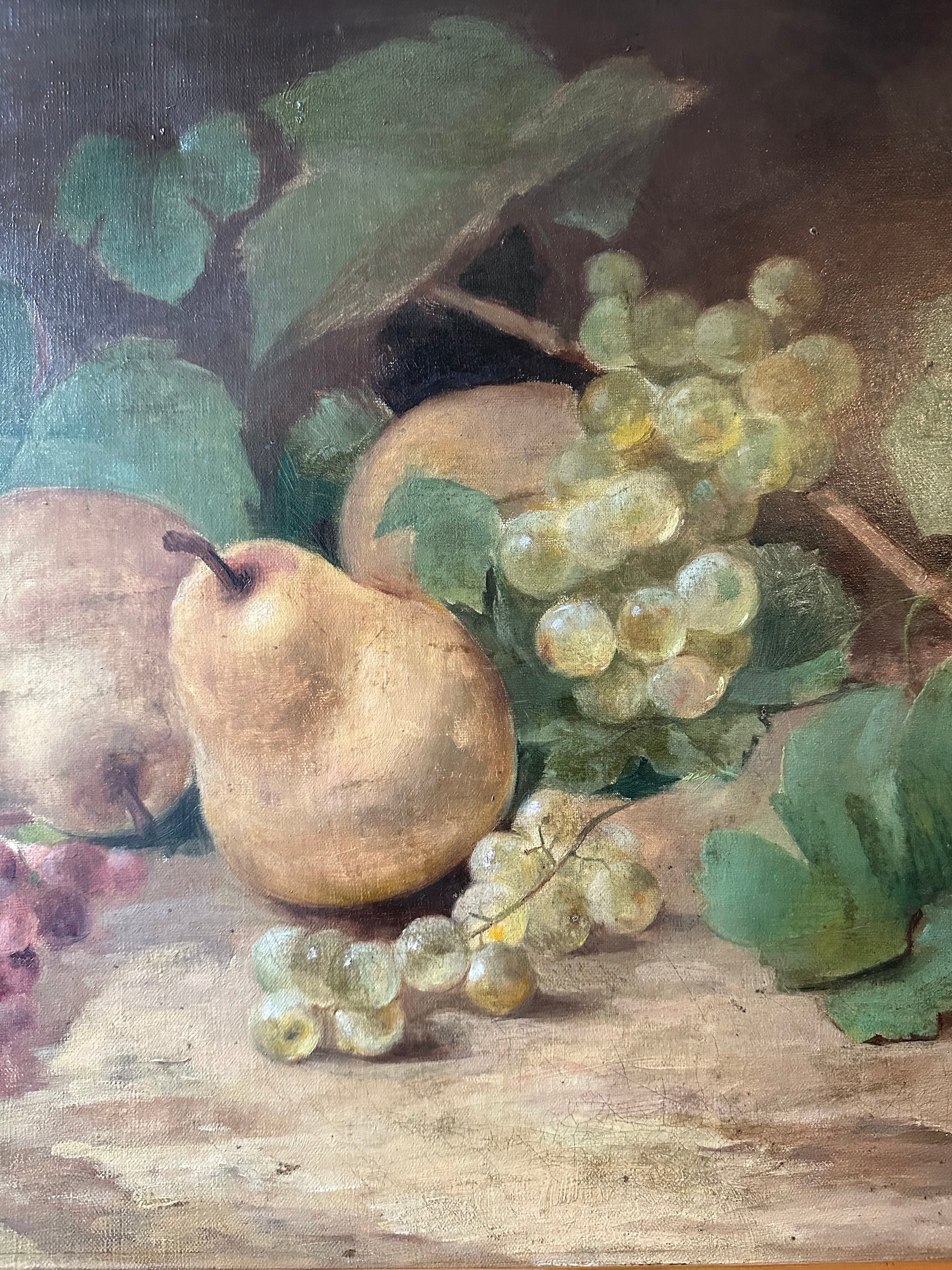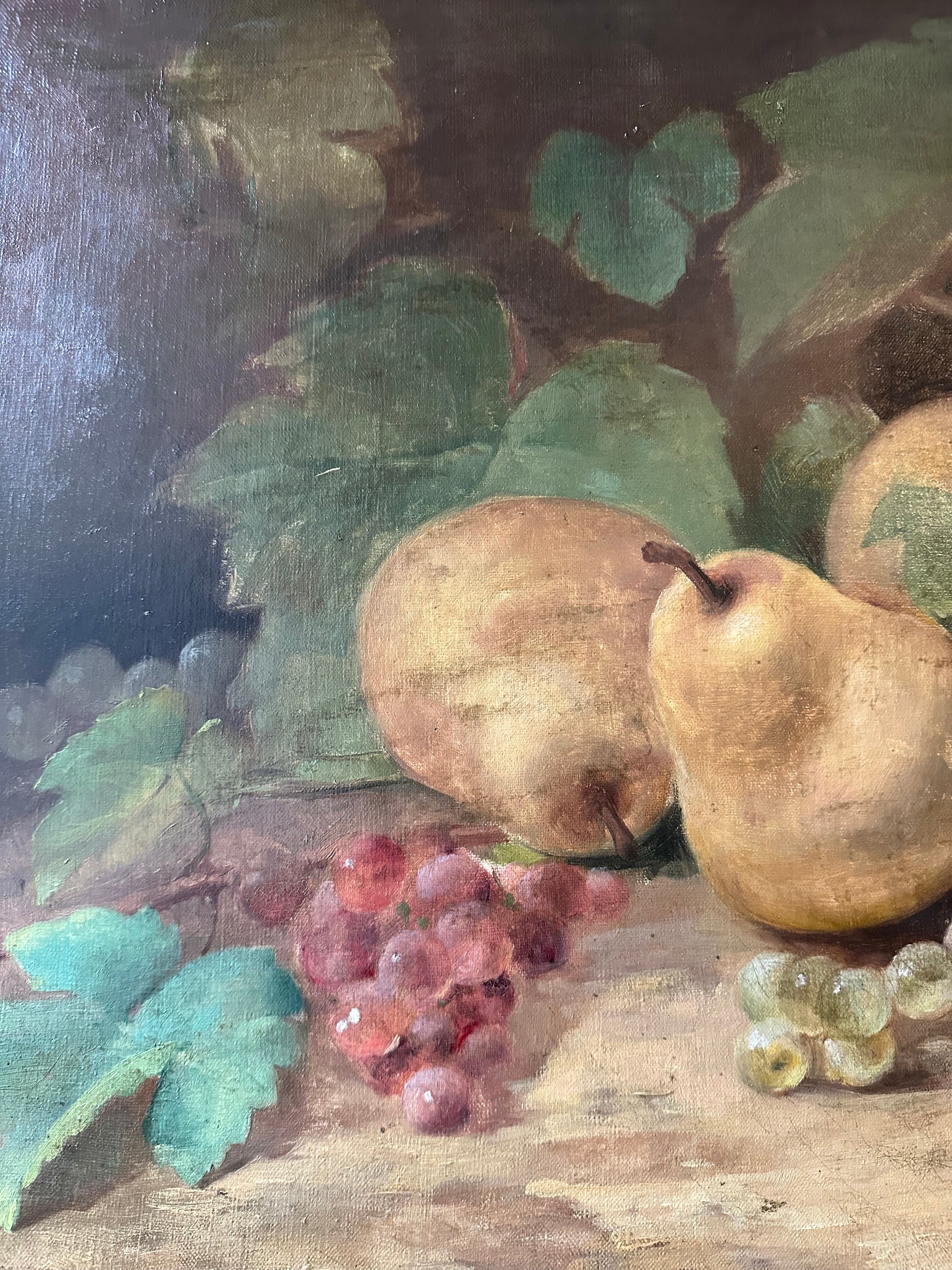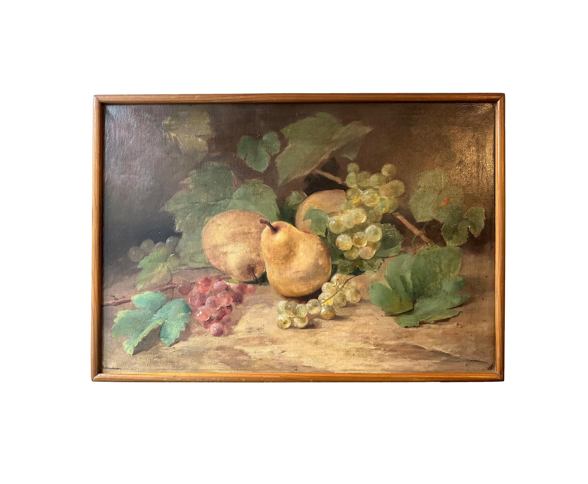 This beautiful French antique oil painting on canvas, measuring 15 1/2 inches by 22 1/4 inches, exudes the charm of the late 19th century. The composition features a lush still-life arrangement, showcasing ripe pears, vibrant clusters of grapes in golden and ruby tones, and delicate grapevine leaves, all rendered with exceptional detail and a naturalistic palette.