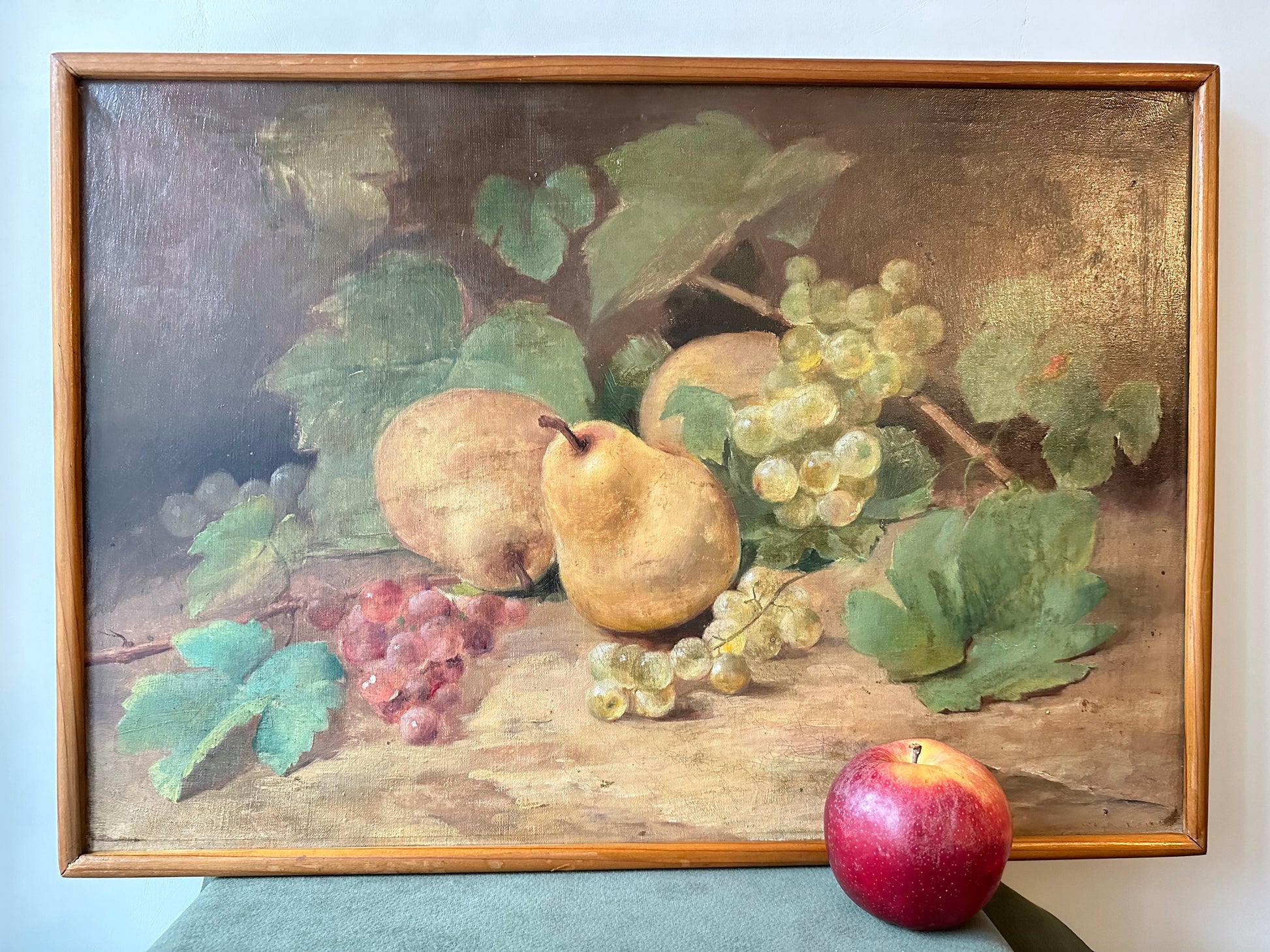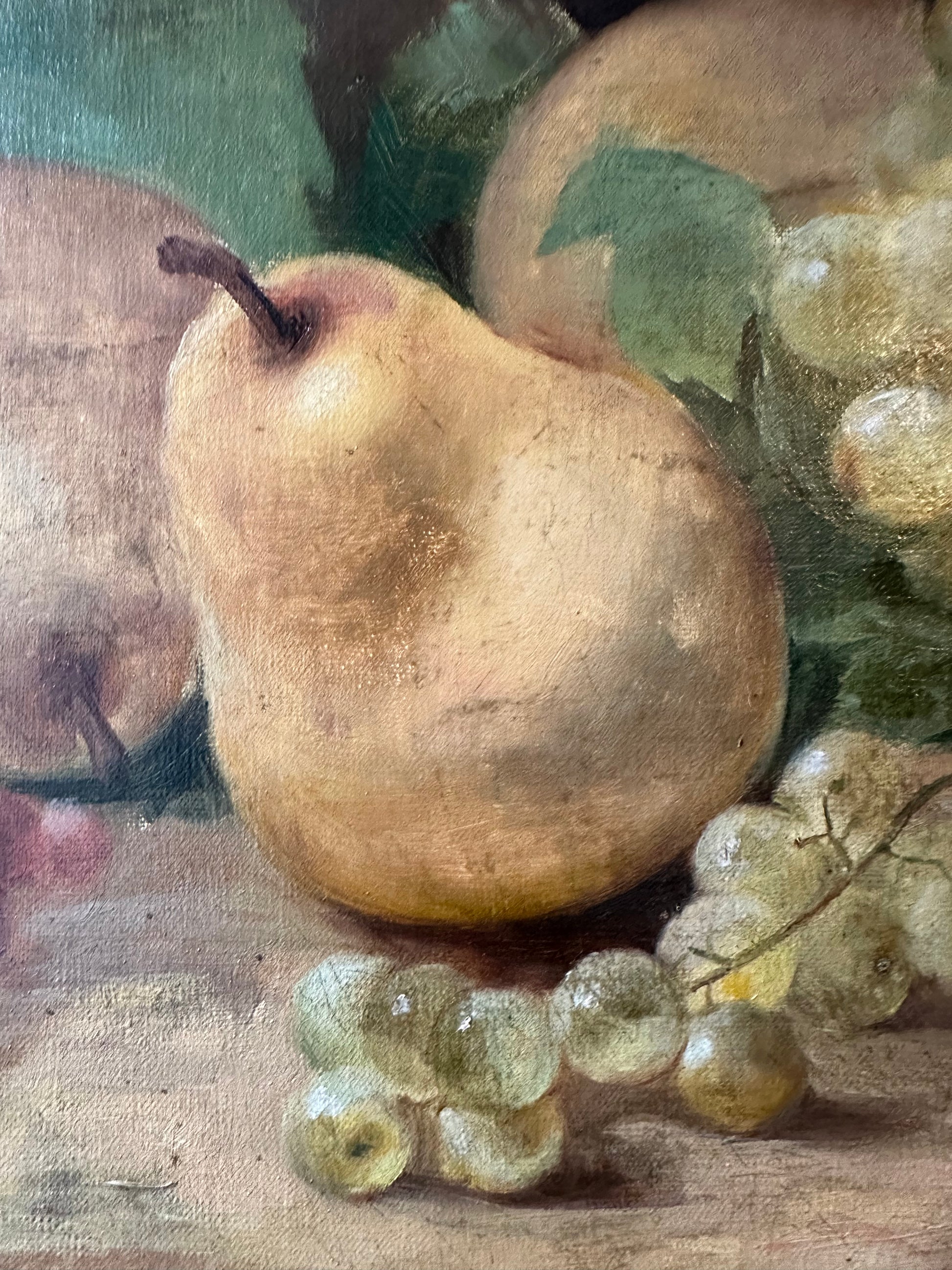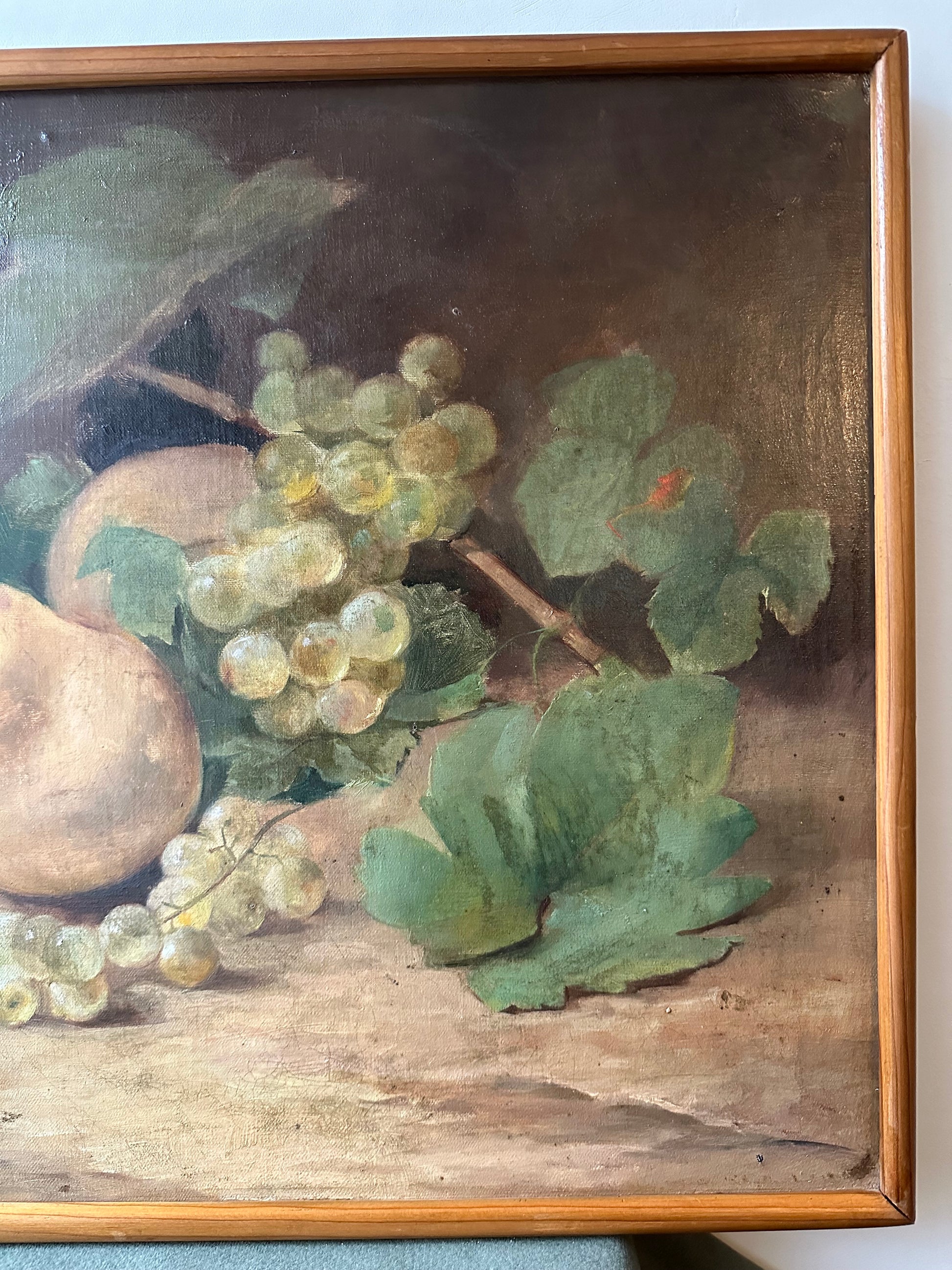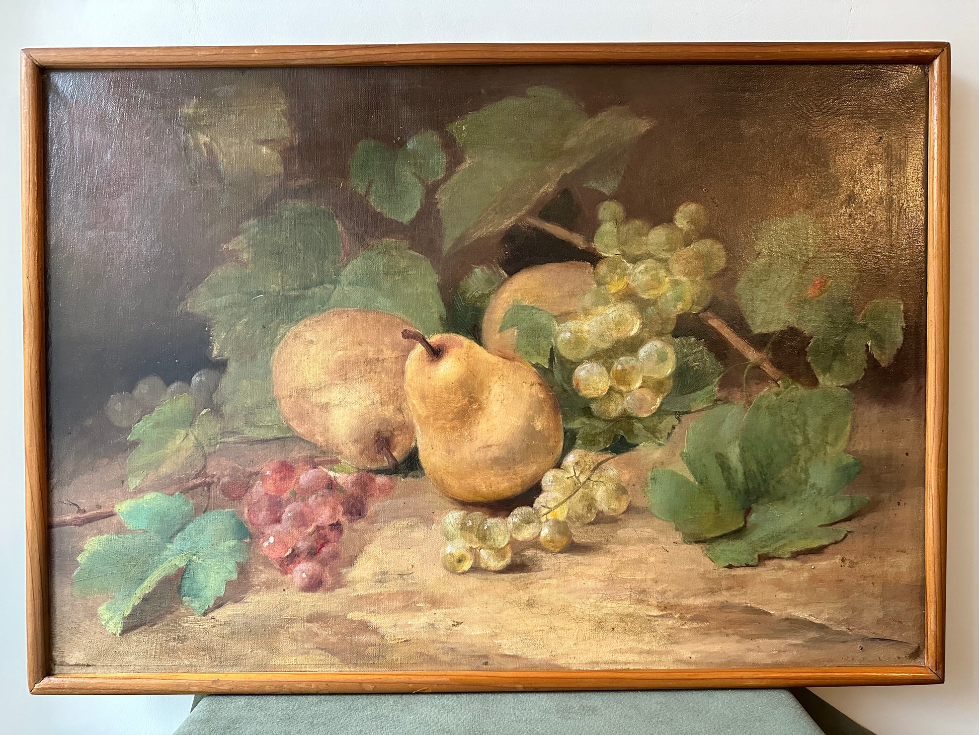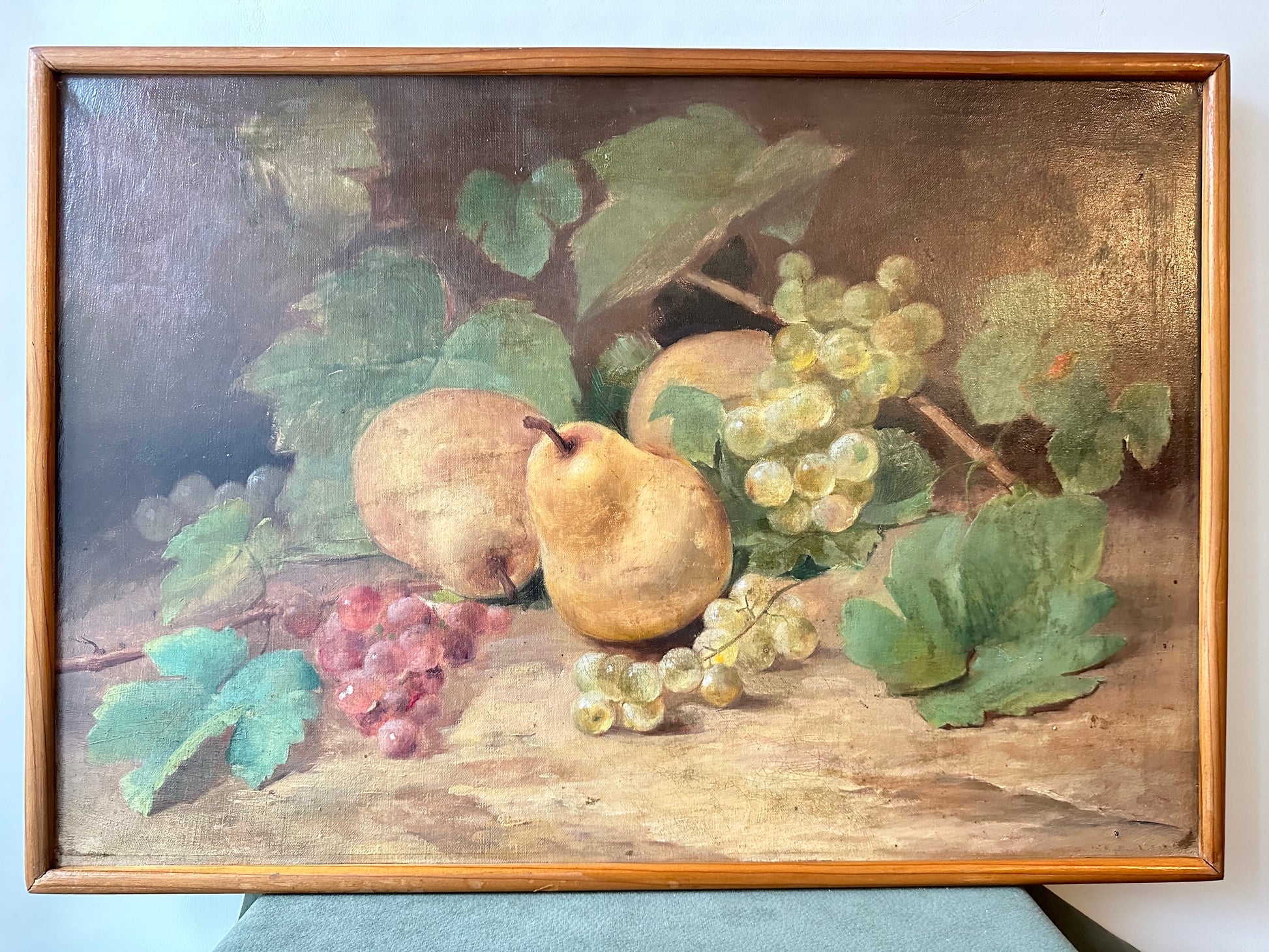 This beautiful French antique oil painting on canvas, measuring 15 1/2 inches by 22 1/4 inches, exudes the charm of the late 19th century. The composition features a lush still-life arrangement, showcasing ripe pears, vibrant clusters of grapes in golden and ruby tones, and delicate grapevine leaves, all rendered with exceptional detail and a naturalistic palette.
