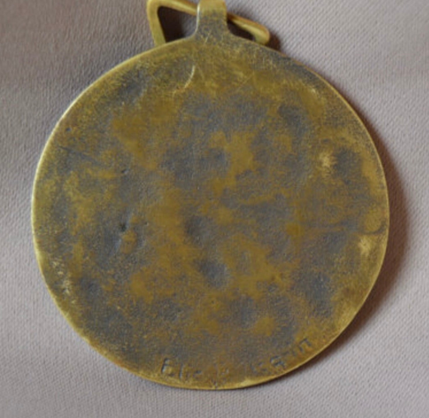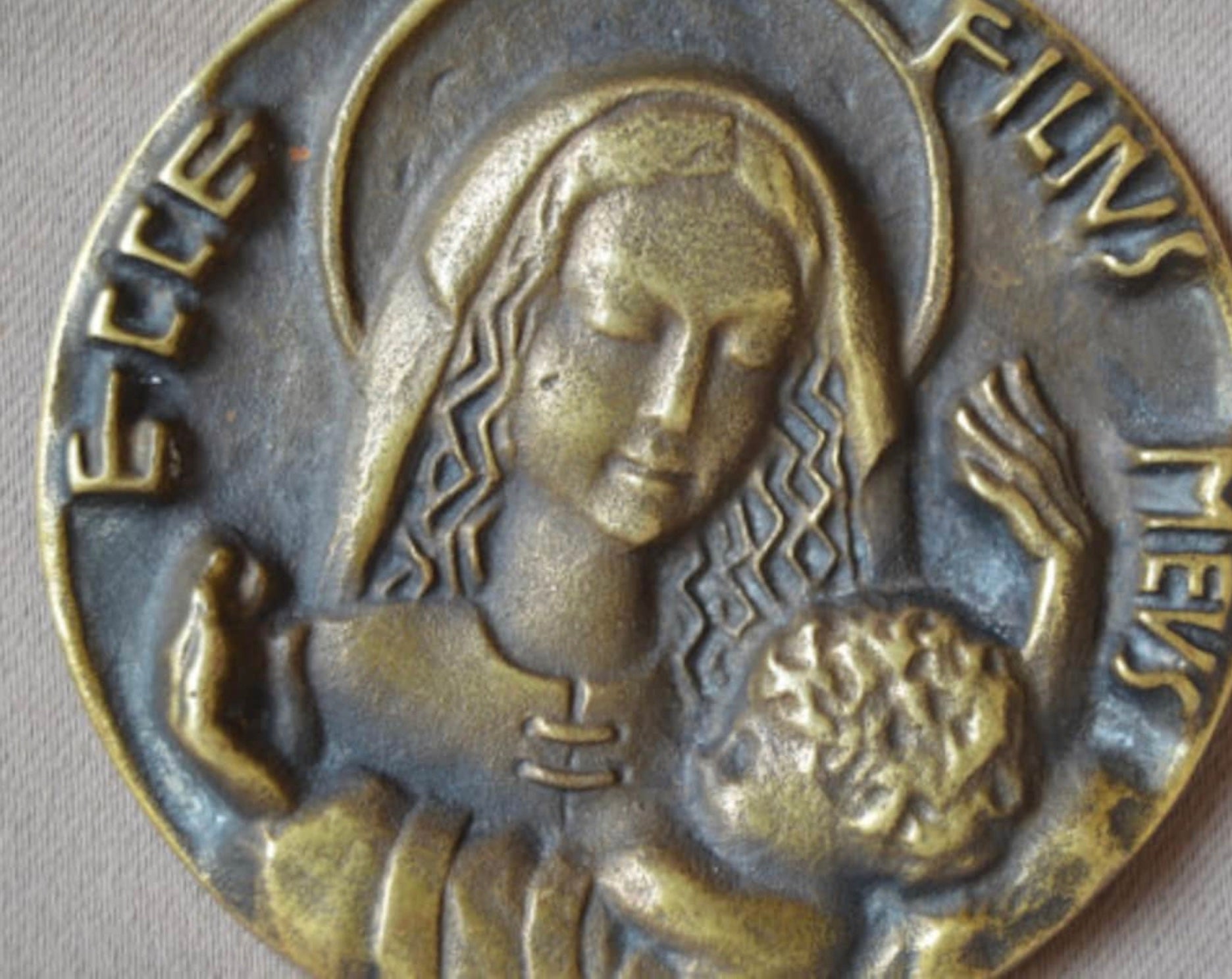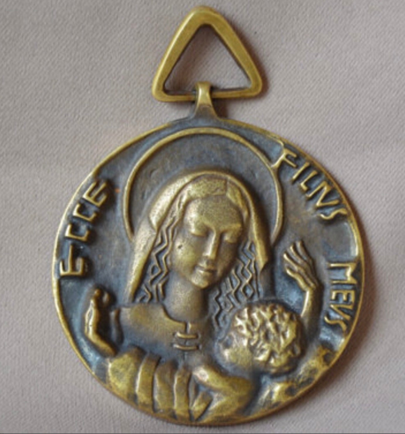 This is a large and stunning bronze cradle medal depicting Our Lady Virgin Mary and Jesus child. It was made by Elie Pellegrin, a French artist. It is signed on the back.