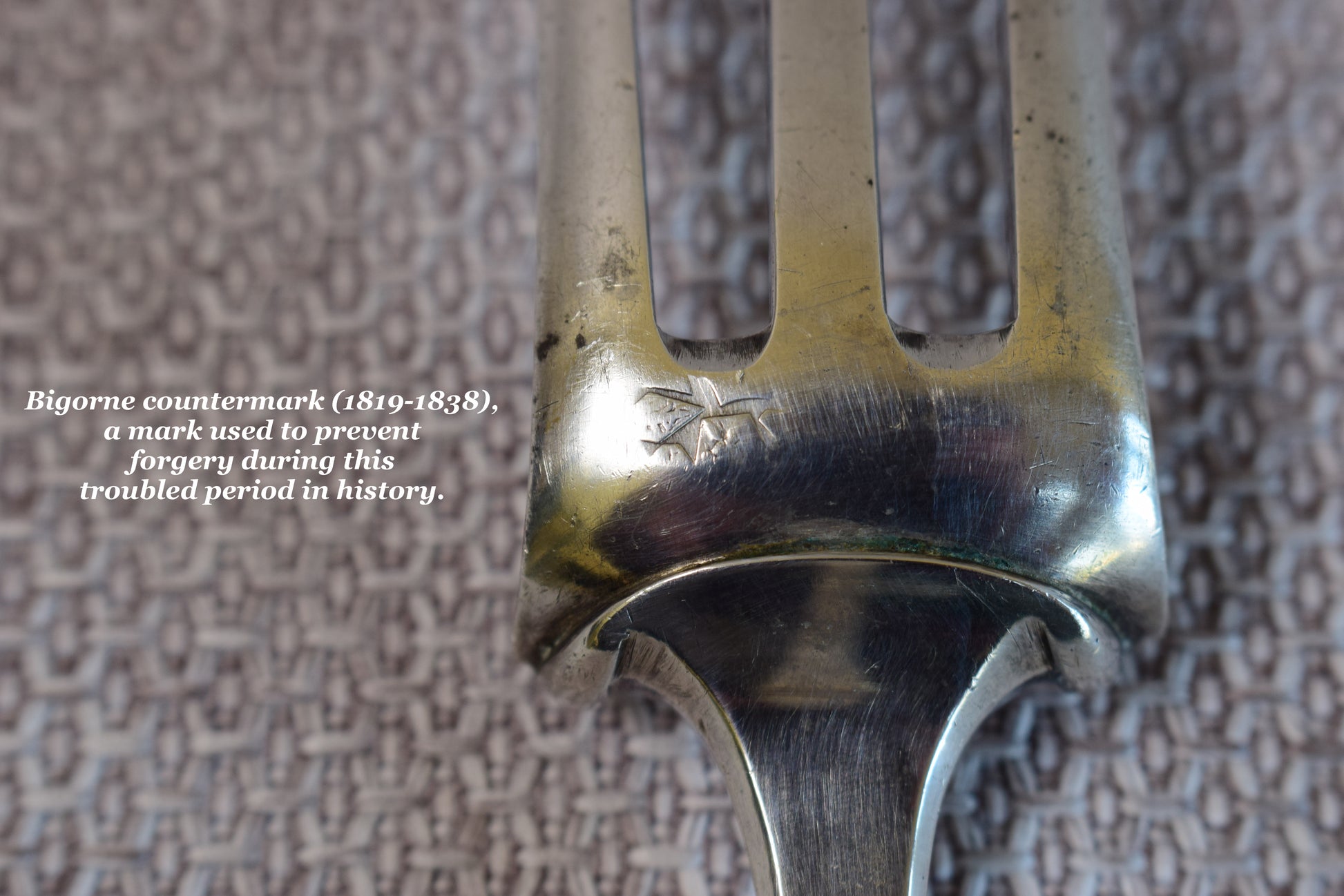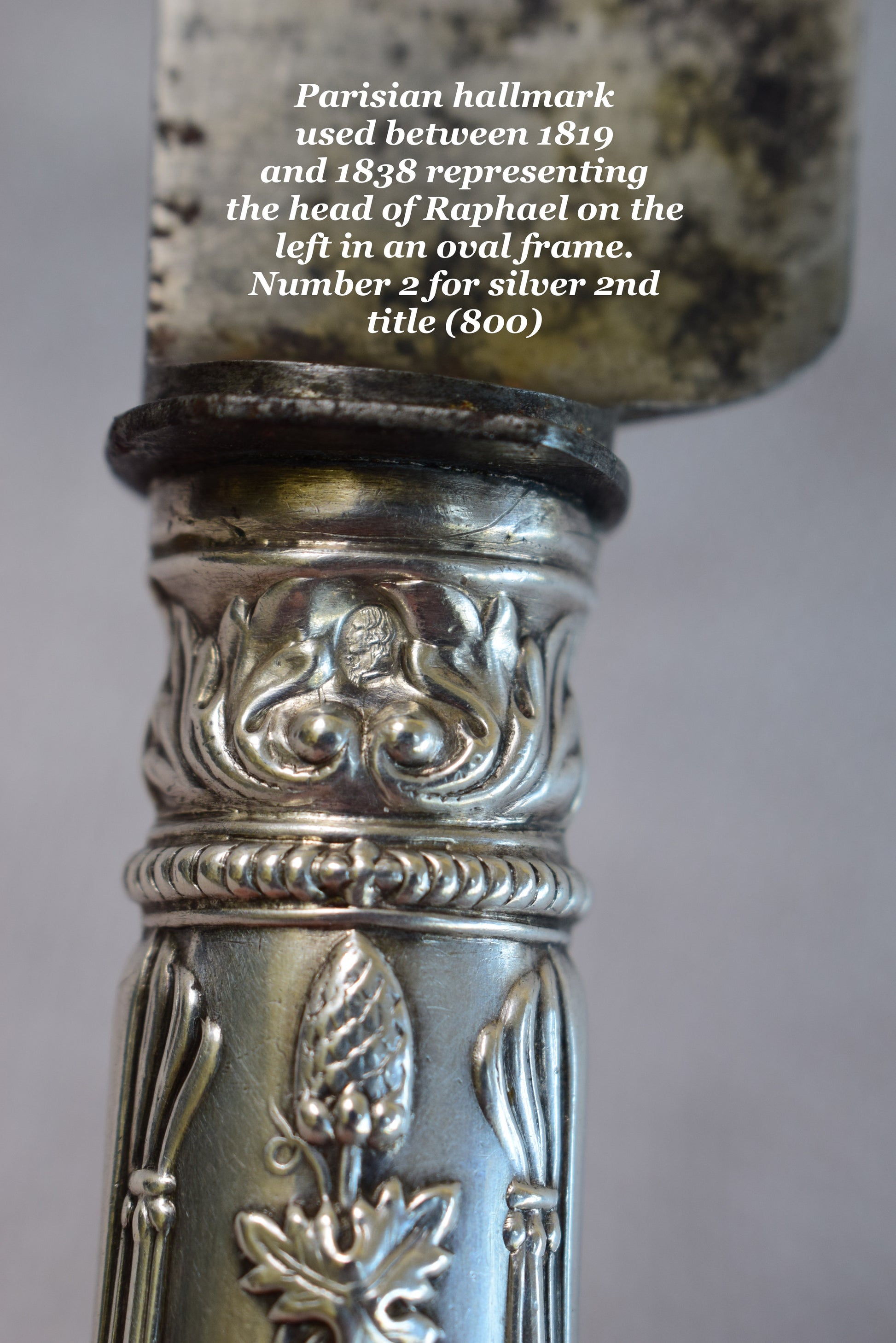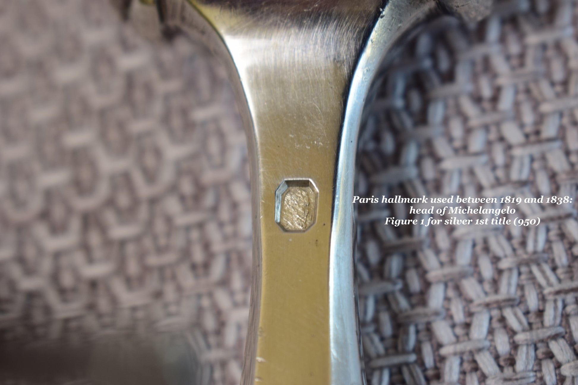 The handles bear the Raphael head hallmark, in use in Paris from 1819 to 1838, identifying the silver as 800 fineness. The upper part of the fork, made of higher-grade silver, carries an impressive array of three hallmarks: