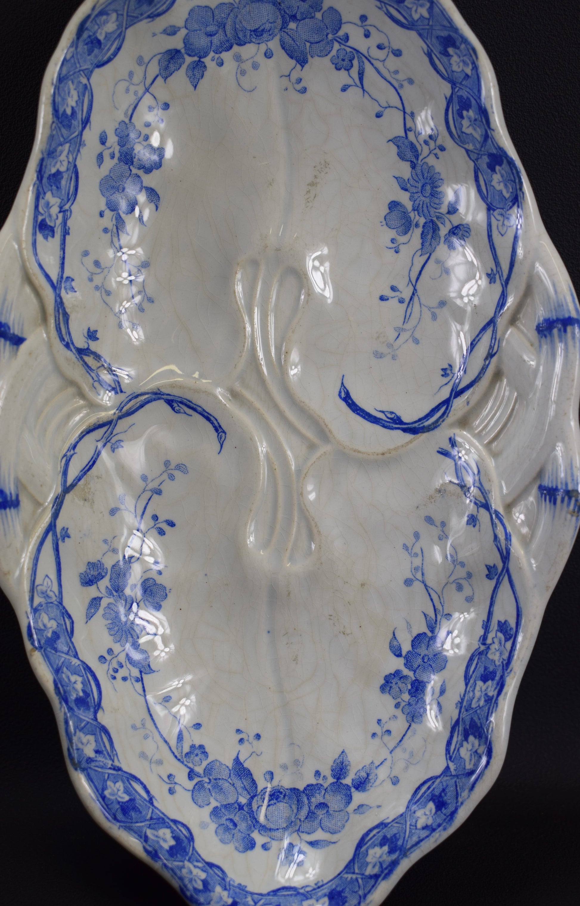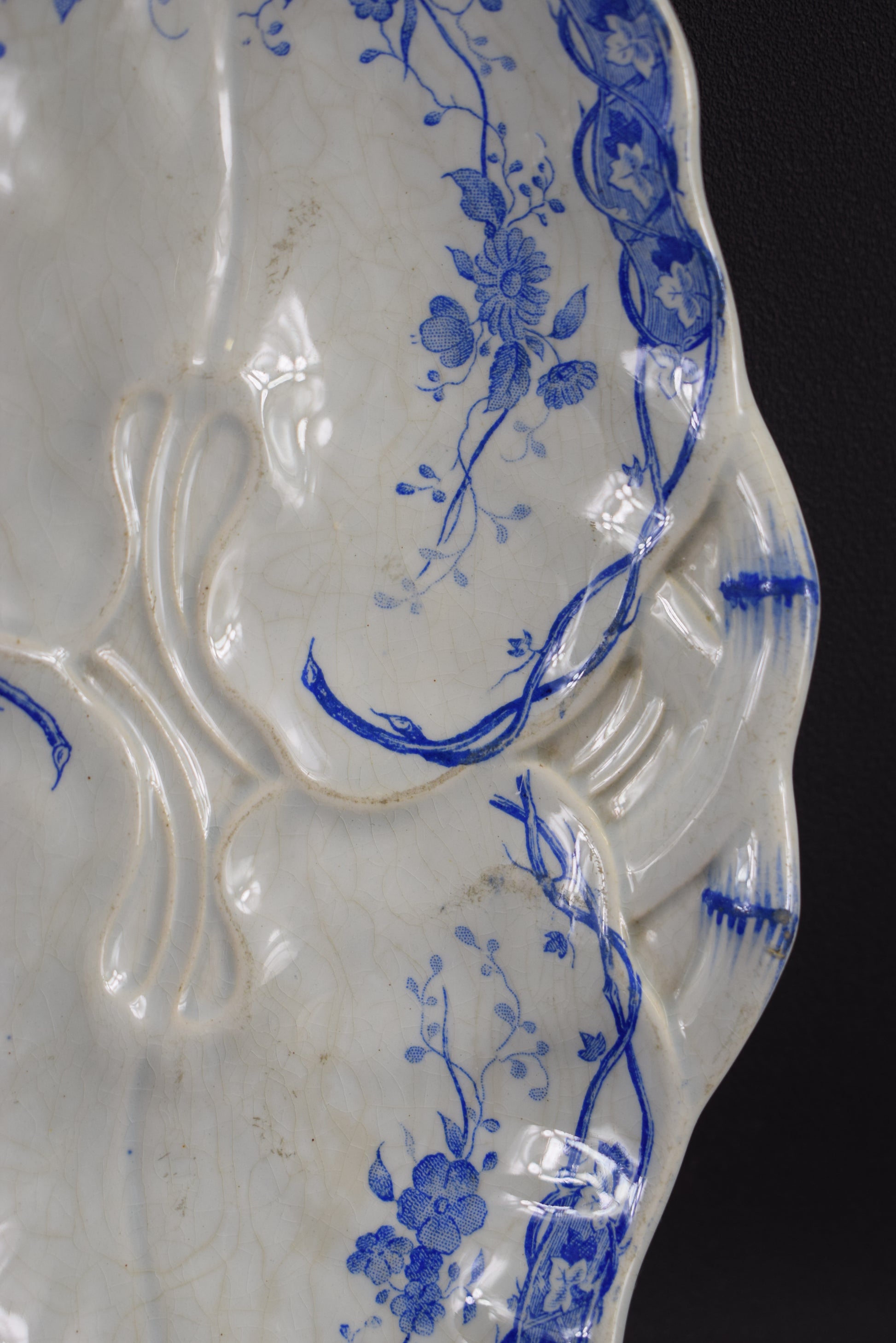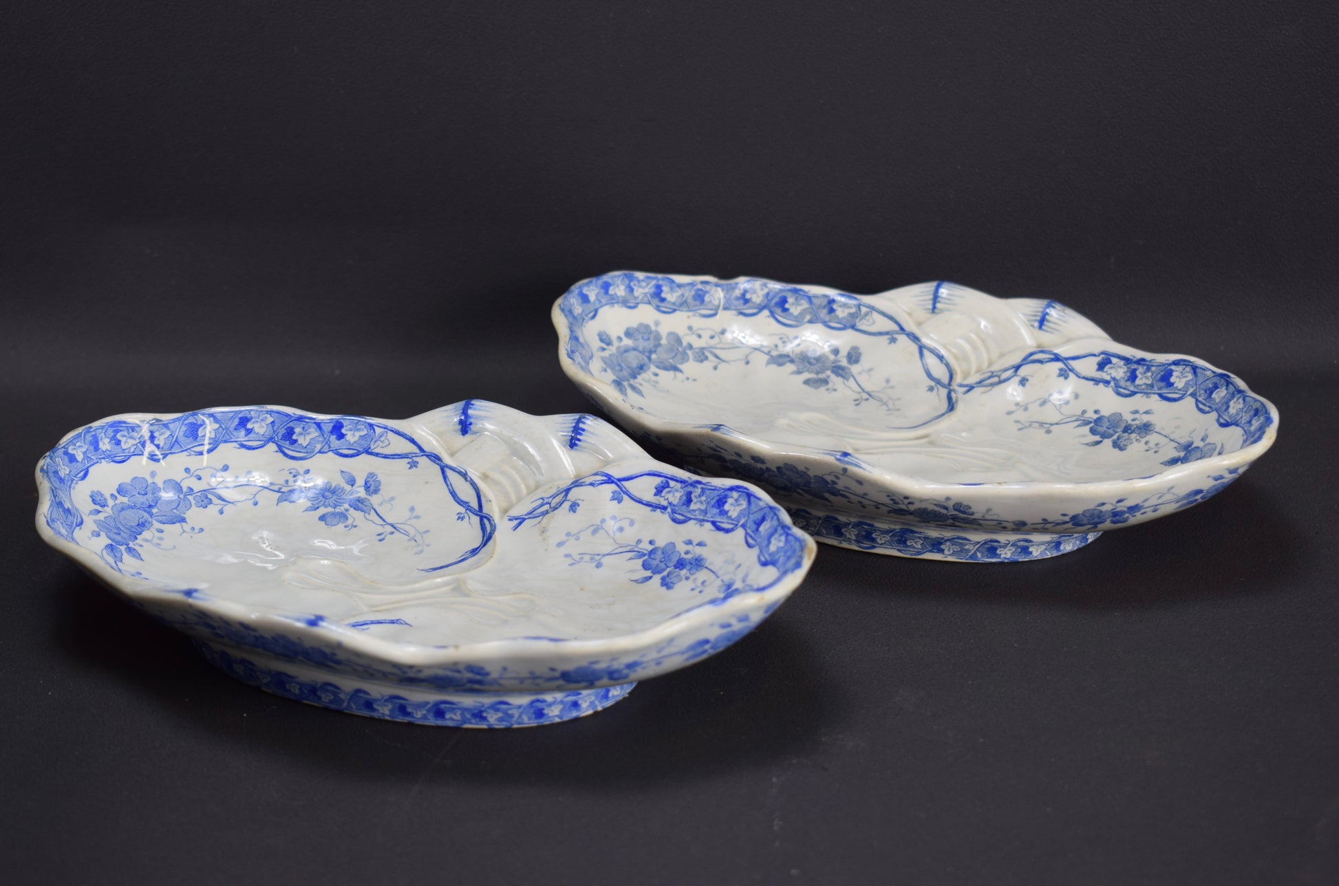 Creil & Montereau has produced these beautiful serving dishes. The charming blue decor features printed underglaze flowers, fruits and vine leaves. This pattern is called "Vigne". This pair of serving dishes is perfect to serve hors d'oeuvre.