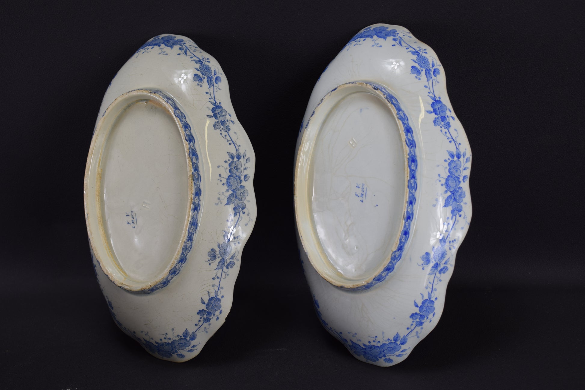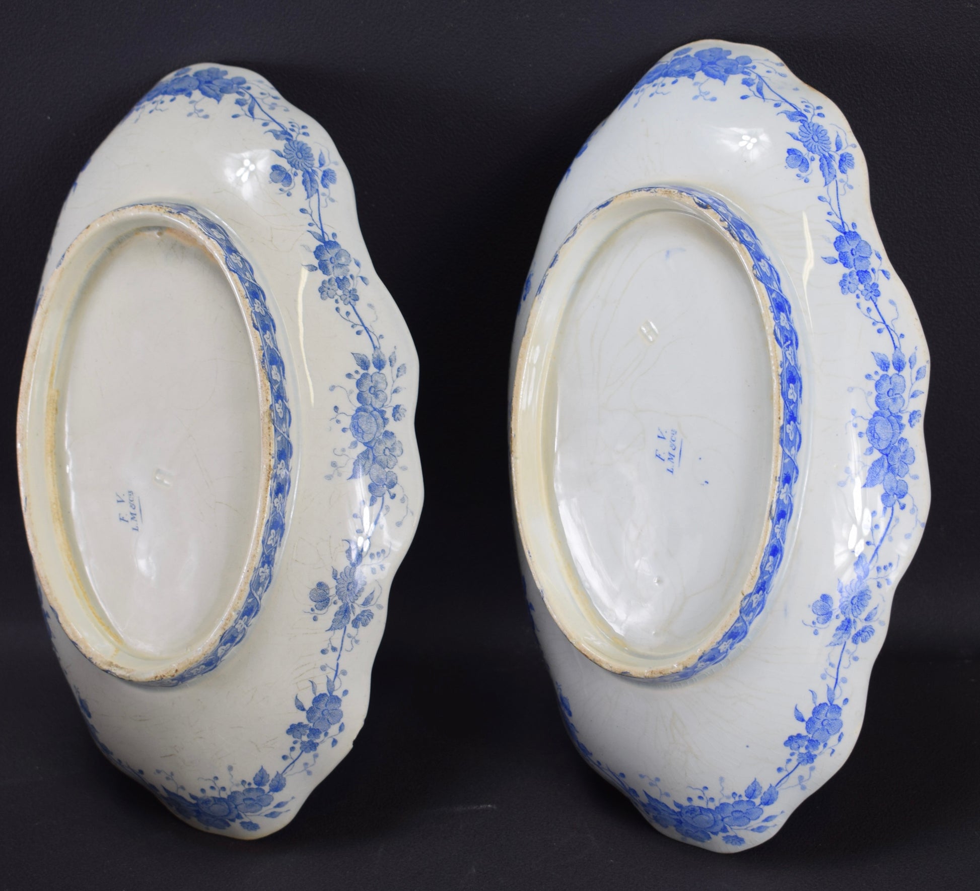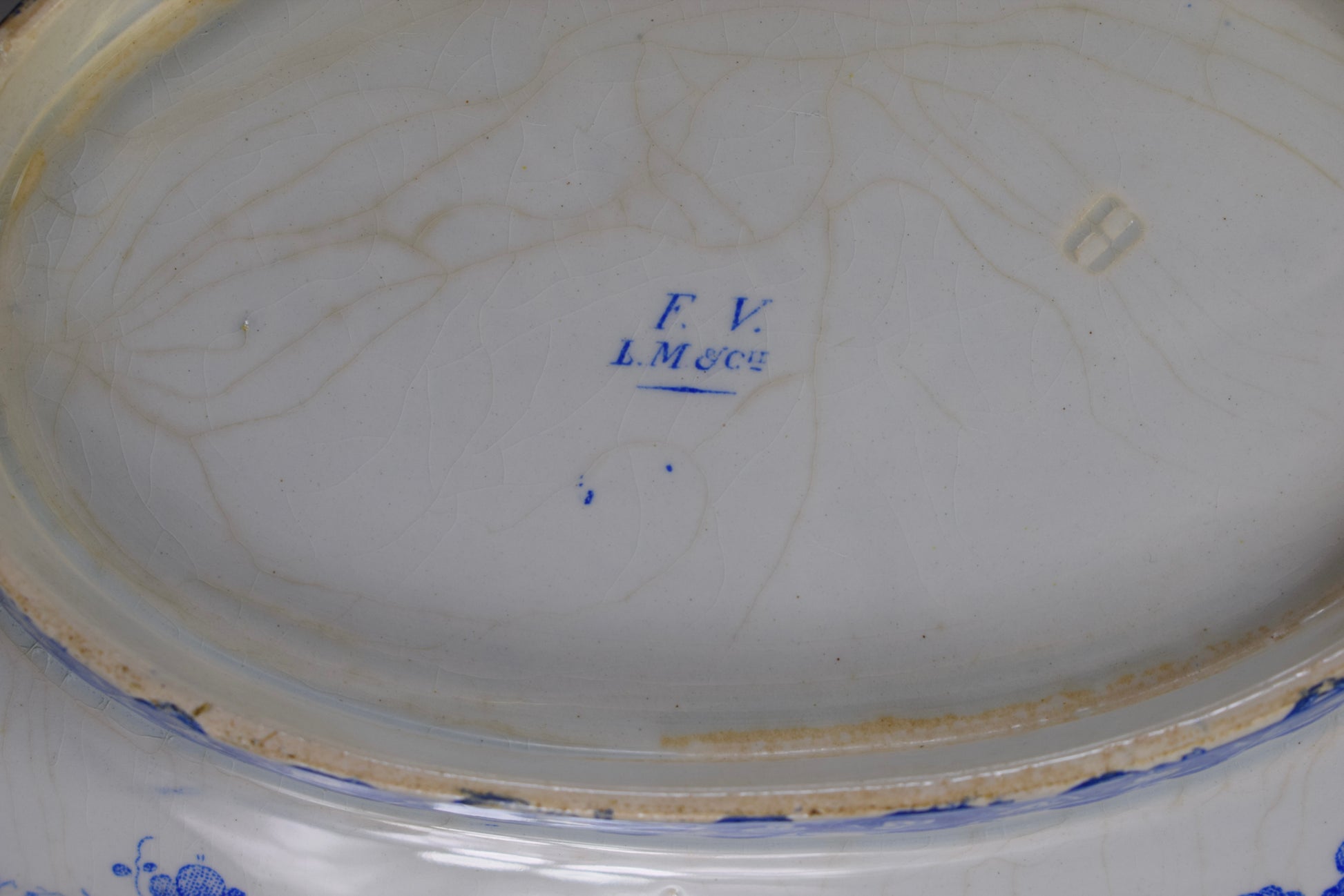 The mark on back was used between 1840 and 1876: lavender underglaze maker mark noting "FV, LM & Cie", as maker, LM & Cie for Leboeuf Millet.