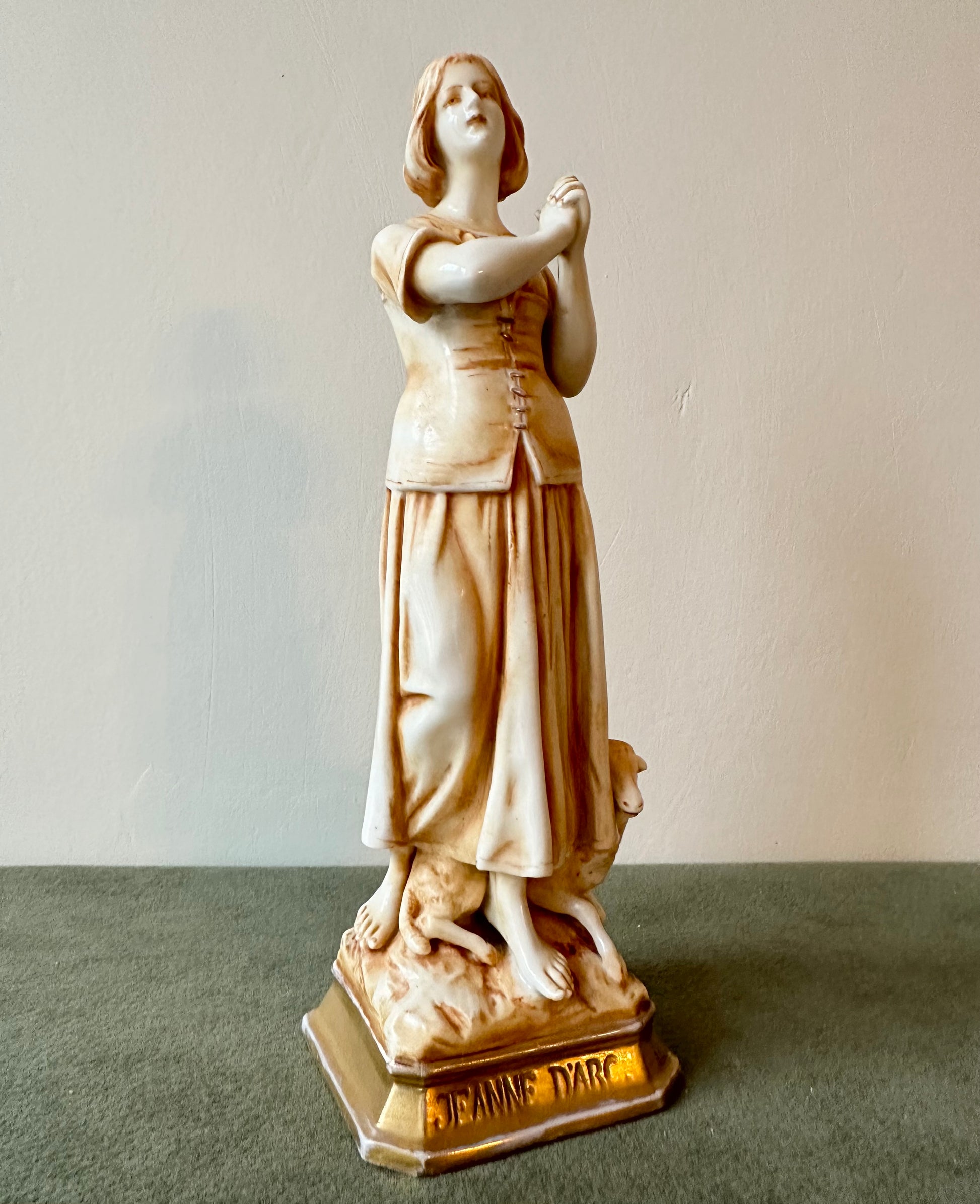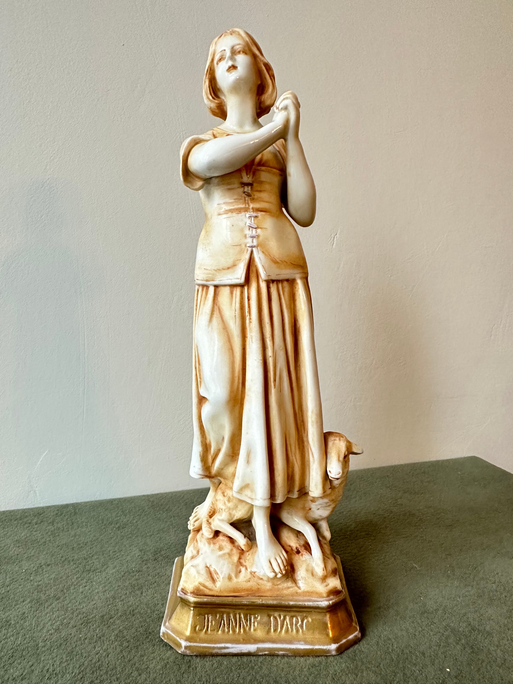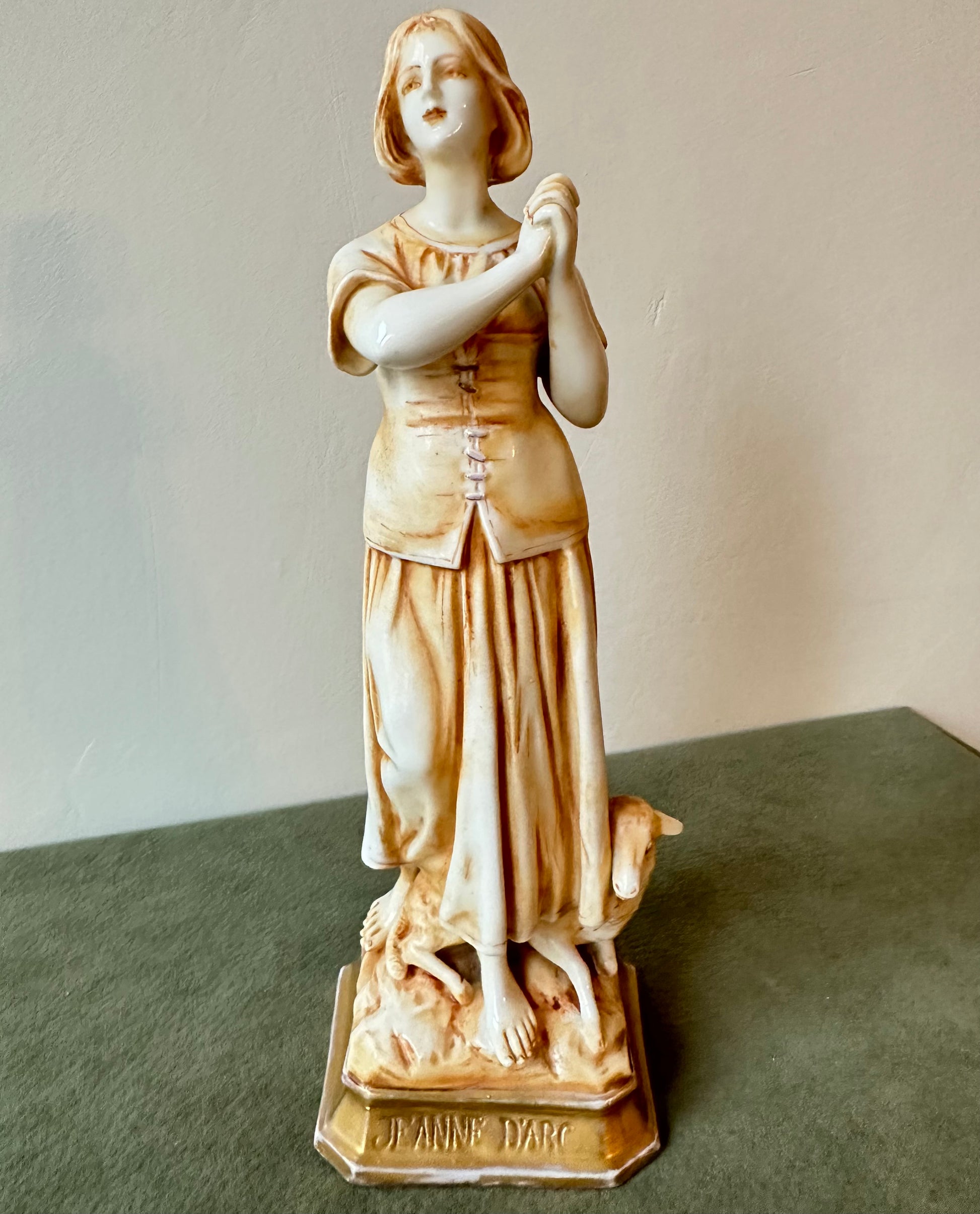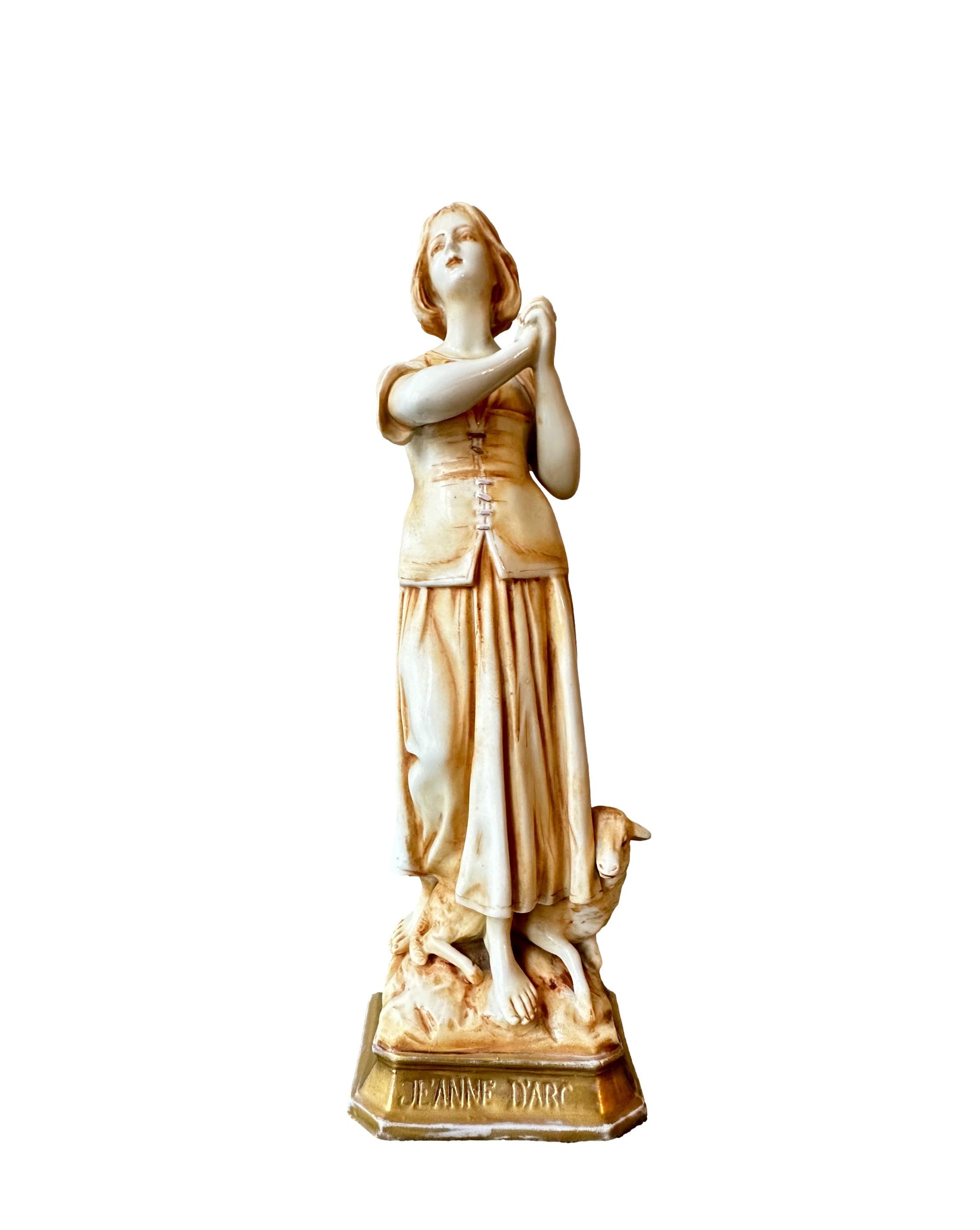 This exquisite porcelain statue captures the serene beauty and spiritual essence of Joan of Arc (Jeanne d'Arc) in a moment of divine inspiration. Standing at 8 1/2 inches high, the figurine showcases meticulous craftsmanship, blending delicate porcelain with a warm golden patina that lends an antique elegance. Saint Joan of Arc is depicted barefoot, her hands clasped in prayer as she gazes heavenward, symbolizing her divine visions and unwavering faith. The flowing folds of her peasant attire are beautifully detailed, evoking her humble beginnings as a shepherdess. At her feet, a sheep rest calmly, reinforcing her pastoral origins and her connection to purity and peace.