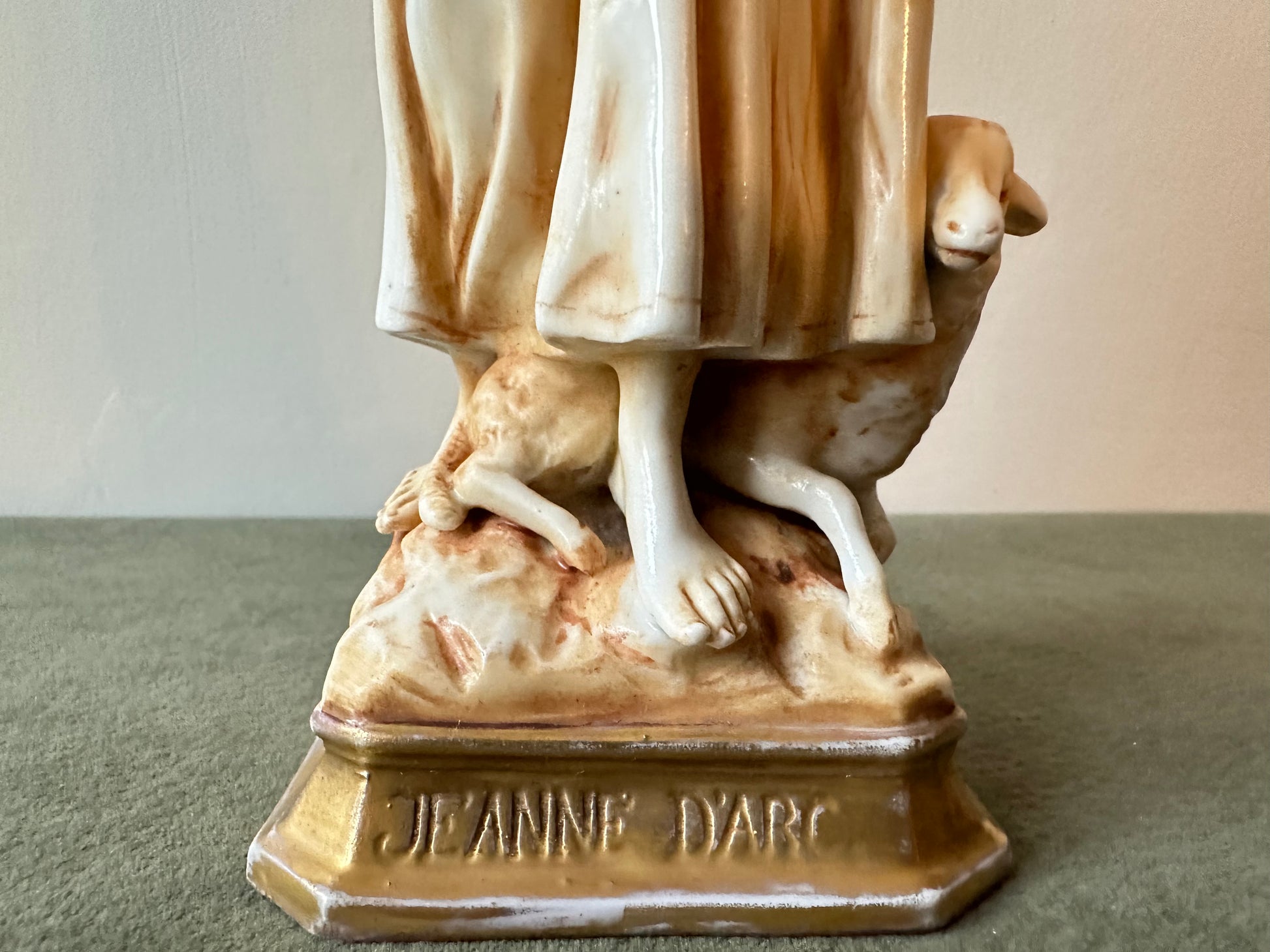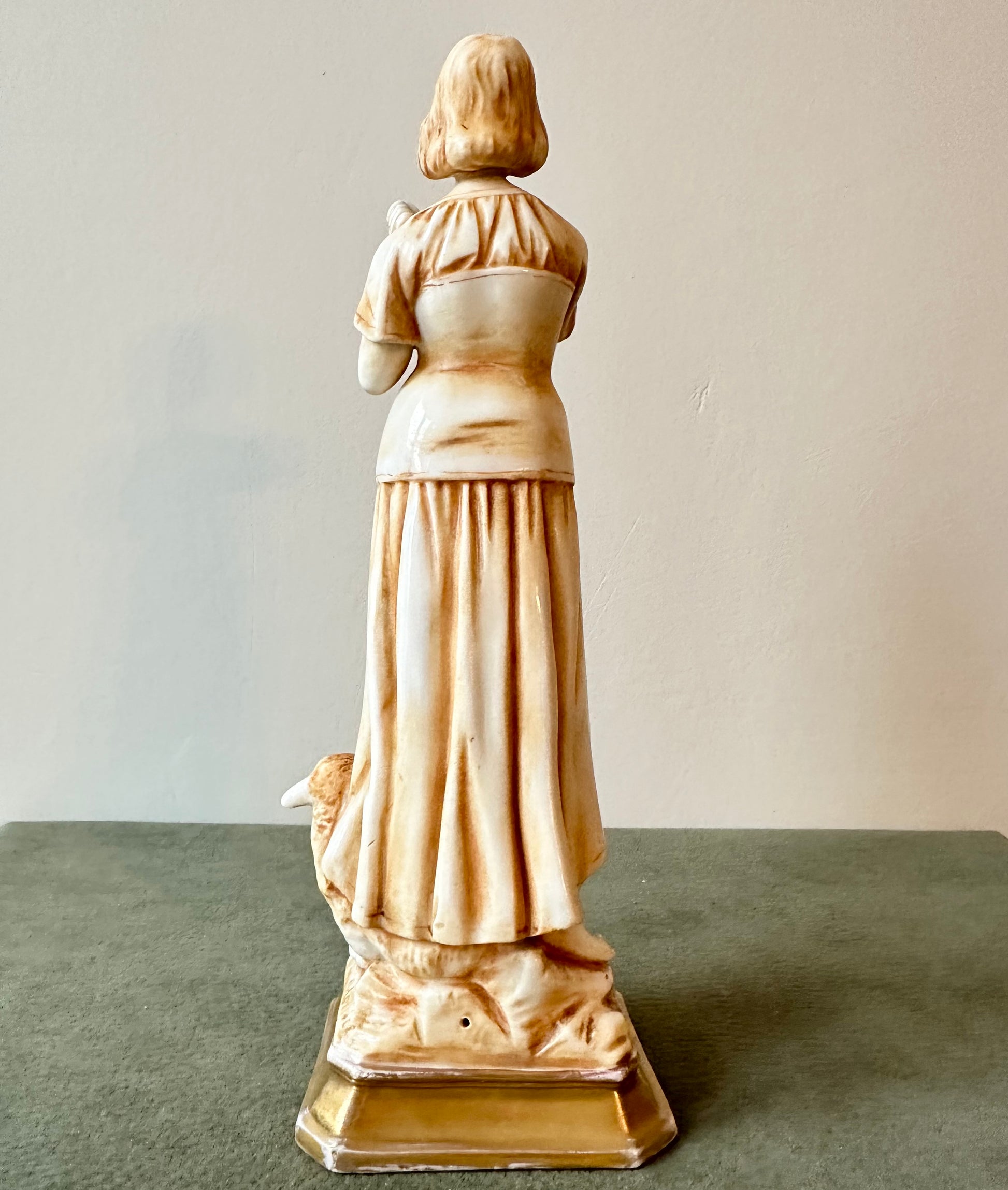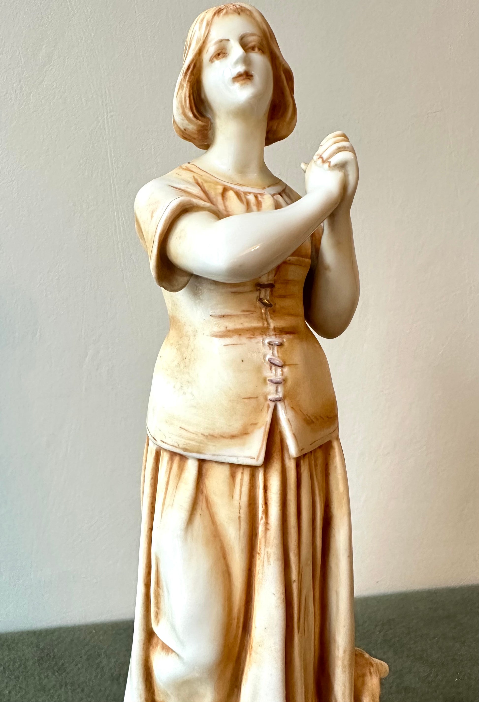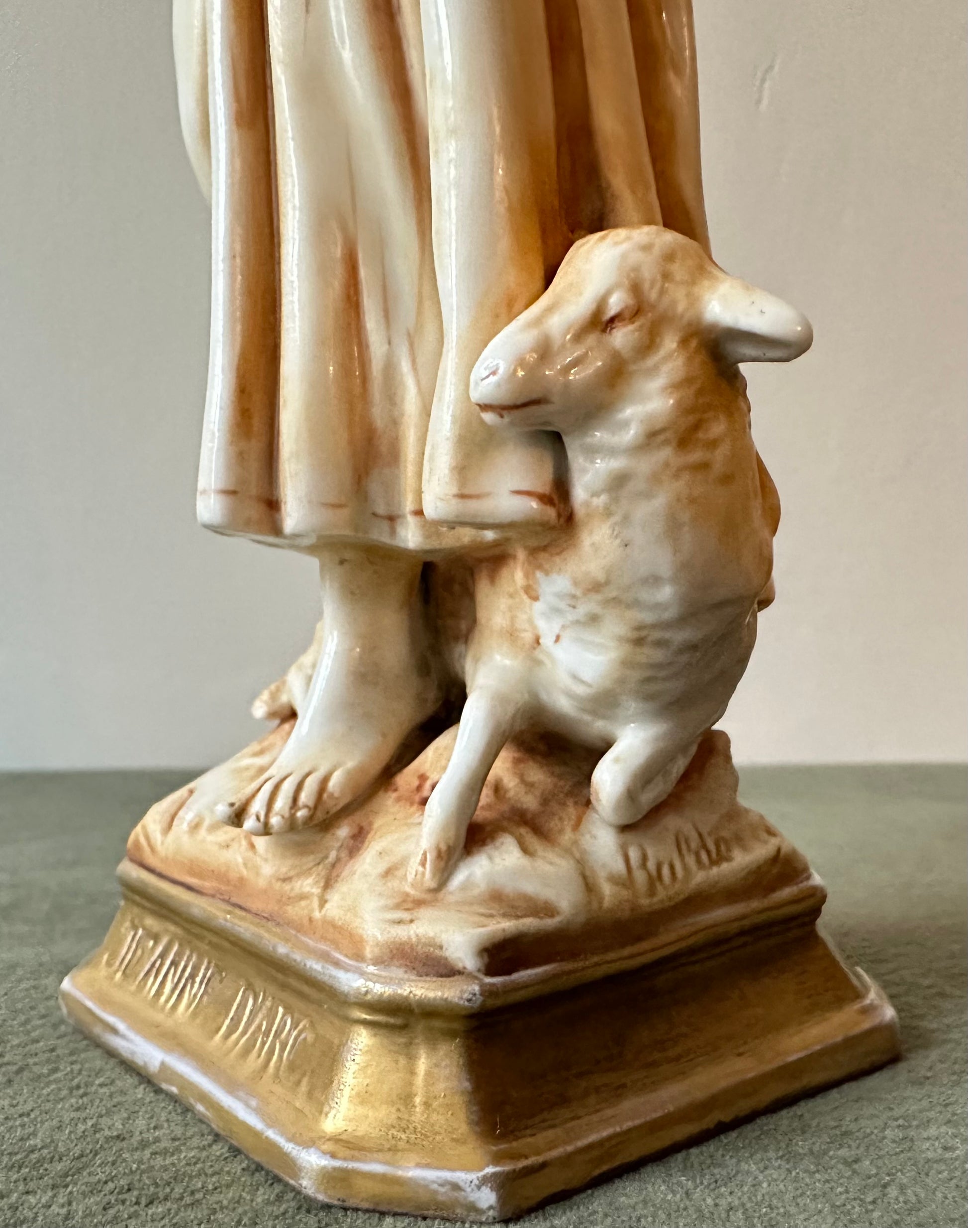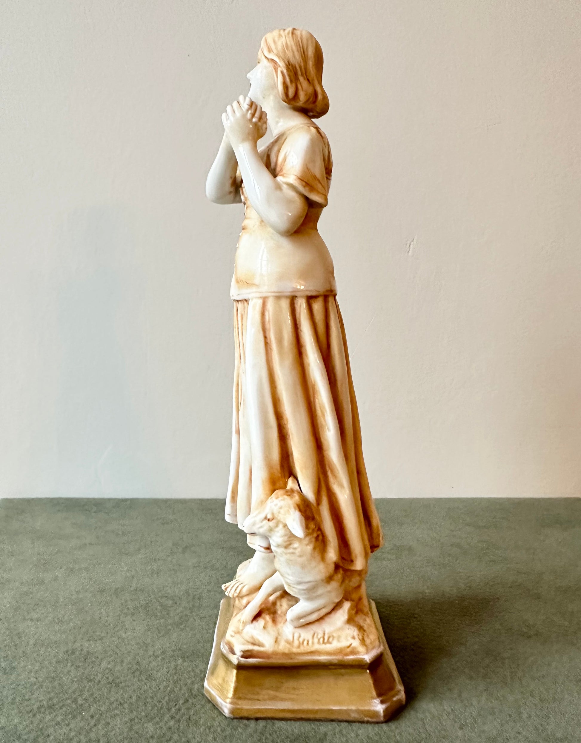 This exquisite porcelain statue captures the serene beauty and spiritual essence of Joan of Arc (Jeanne d'Arc) in a moment of divine inspiration. Standing at 8 1/2 inches high, the figurine showcases meticulous craftsmanship, blending delicate porcelain with a warm golden patina that lends an antique elegance. Saint Joan of Arc is depicted barefoot, her hands clasped in prayer as she gazes heavenward, symbolizing her divine visions and unwavering faith. The flowing folds of her peasant attire are beautifully detailed, evoking her humble beginnings as a shepherdess. At her feet, a sheep rest calmly, reinforcing her pastoral origins and her connection to purity and peace.
