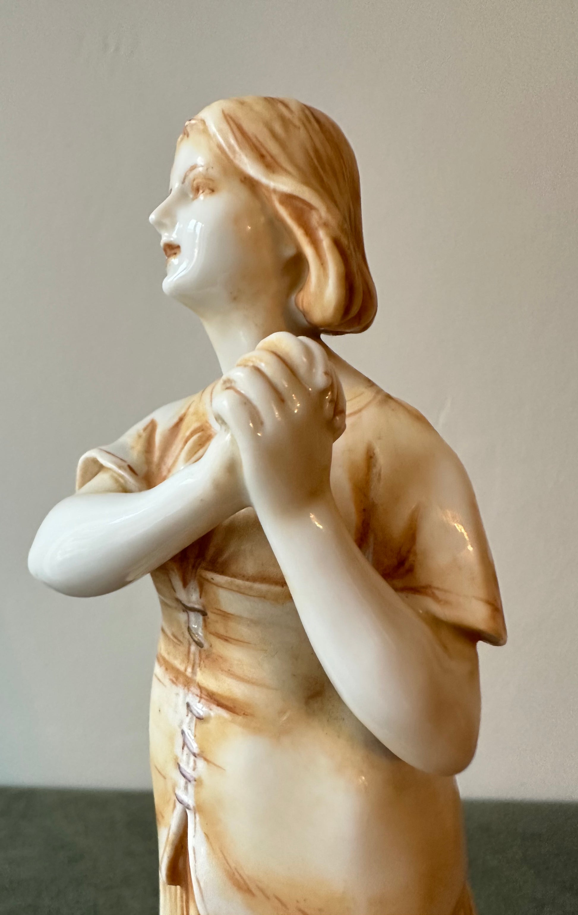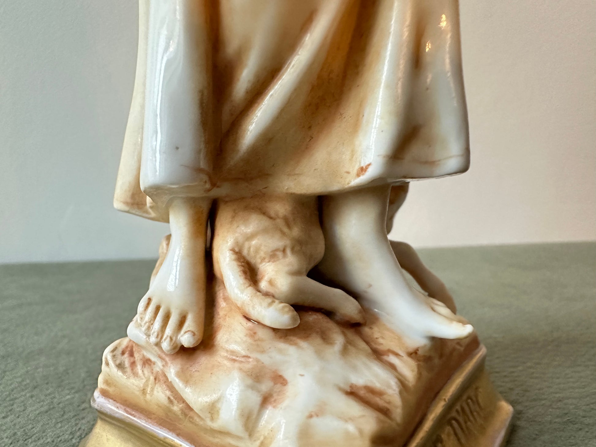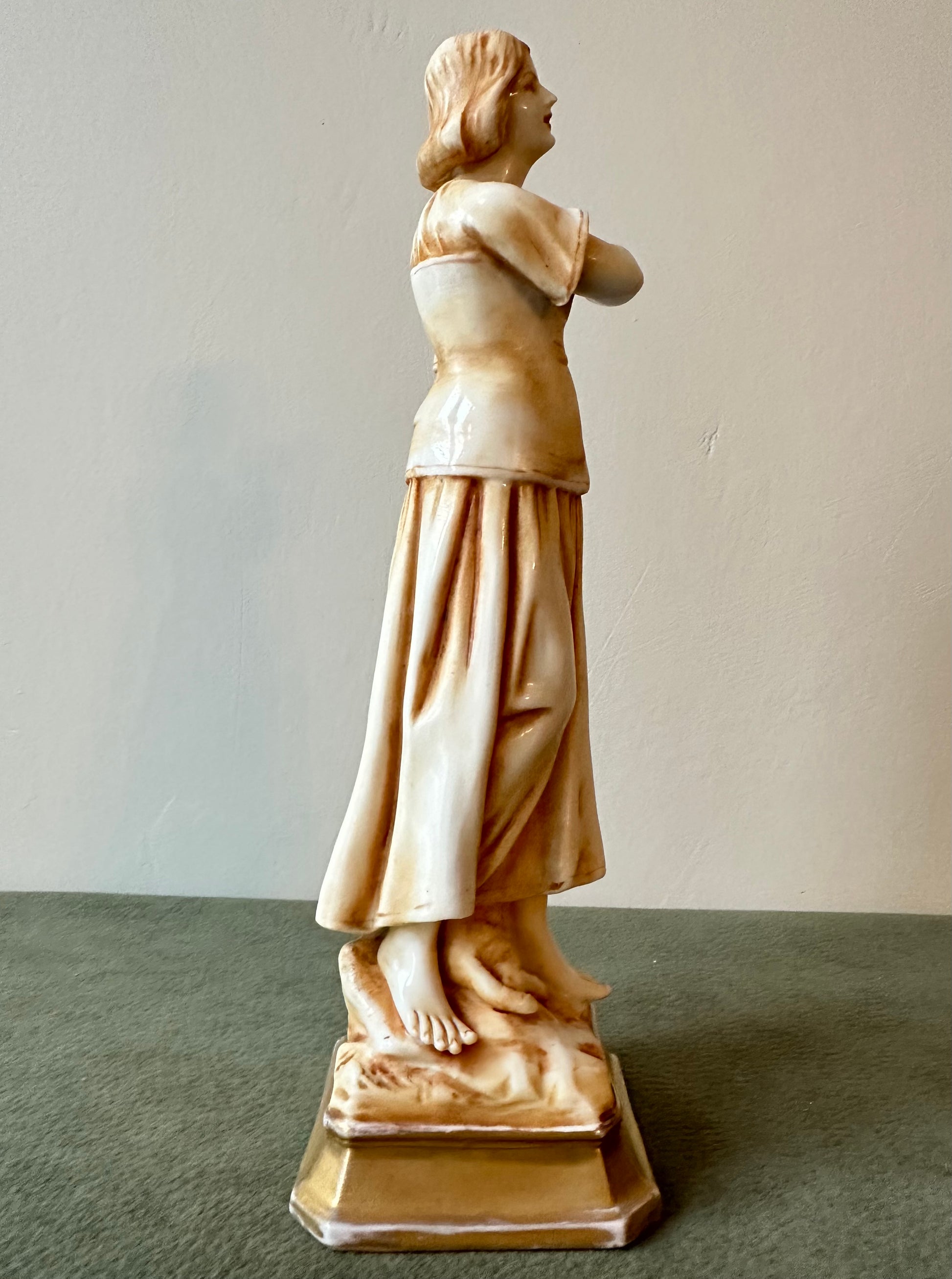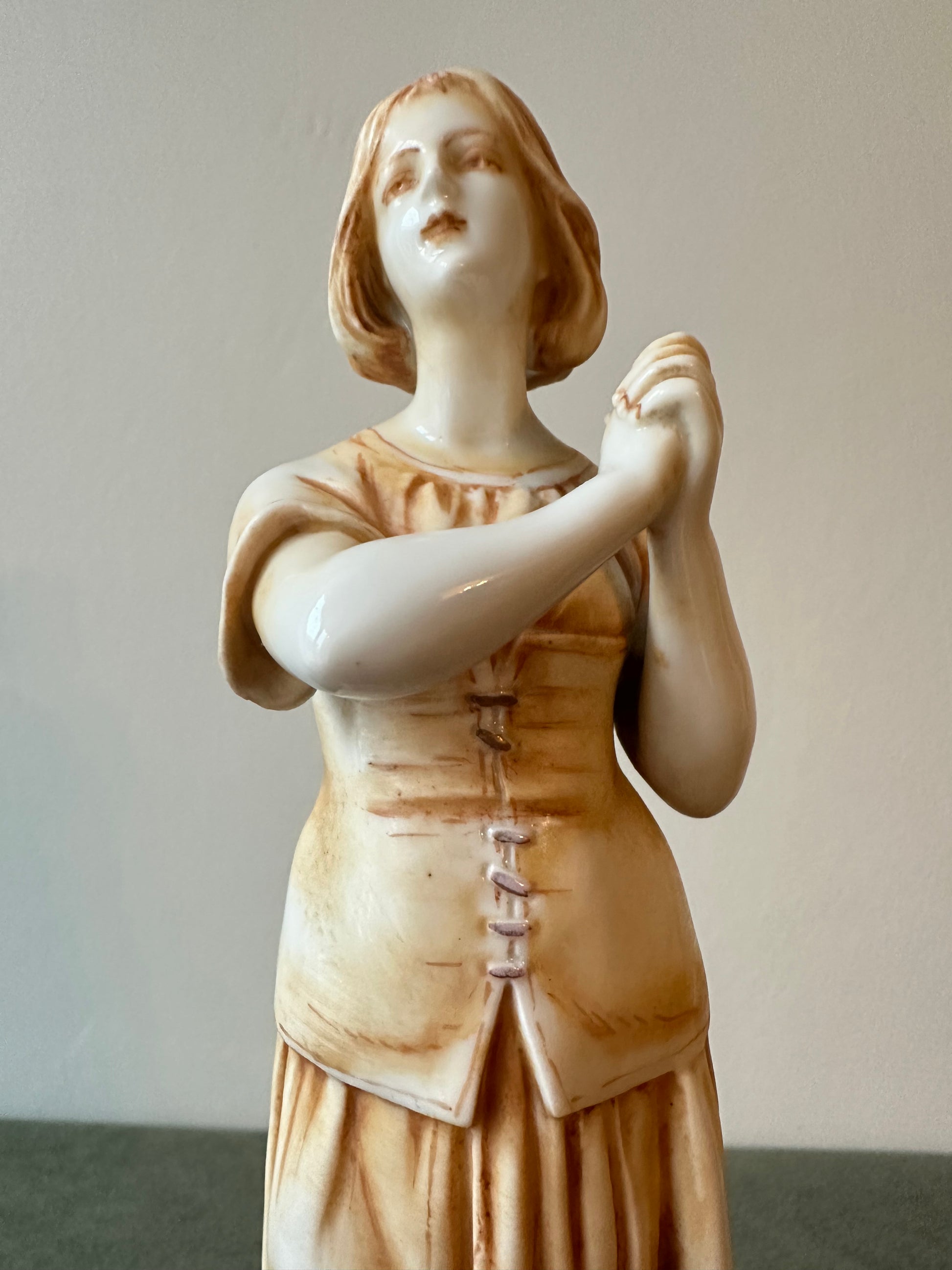 This exquisite porcelain statue captures the serene beauty and spiritual essence of Joan of Arc (Jeanne d'Arc) in a moment of divine inspiration. Standing at 8 1/2 inches high, the figurine showcases meticulous craftsmanship, blending delicate porcelain with a warm golden patina that lends an antique elegance. Saint Joan of Arc is depicted barefoot, her hands clasped in prayer as she gazes heavenward, symbolizing her divine visions and unwavering faith. The flowing folds of her peasant attire are beautifully detailed, evoking her humble beginnings as a shepherdess. At her feet, a sheep rest calmly, reinforcing her pastoral origins and her connection to purity and peace.
