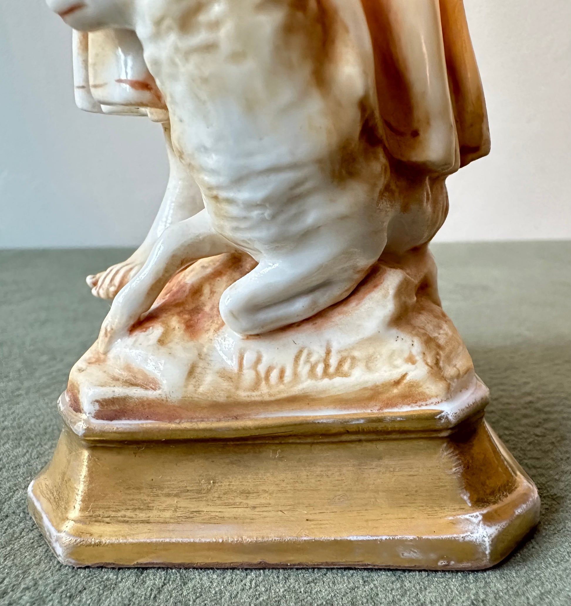 The golden base, inscribed with "JEANNE D'ARC," enhances the statue’s timeless charm, making it a captivating centerpiece for collectors and admirers of historical or religious art. Likely crafted by a renowned German porcelain house in the early 20th century, this piece embodies both artistry and reverence, perfect for honoring one of history's most inspiring figures. It has been made after a design of the artist BALDOCCHI.