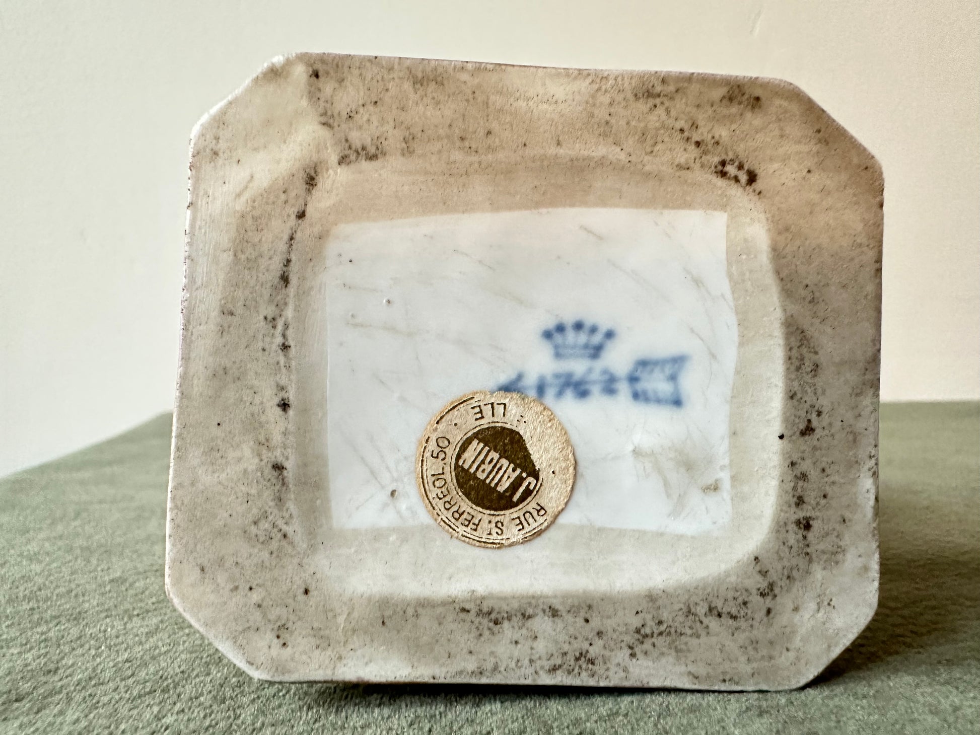 It bears a blue mark: a crown above an arrow and the date 1762. There is also the boutique's label where it was once sold.
