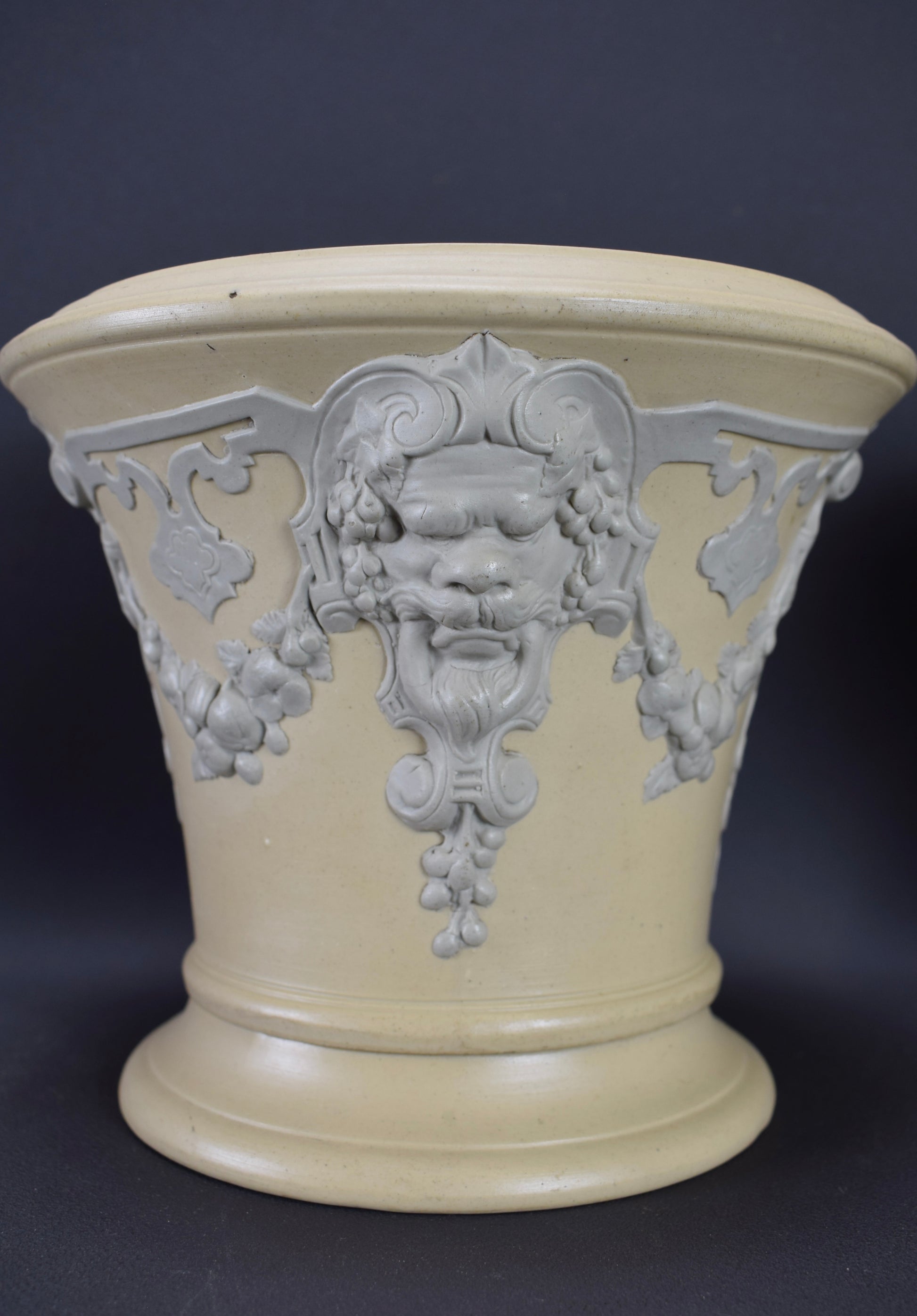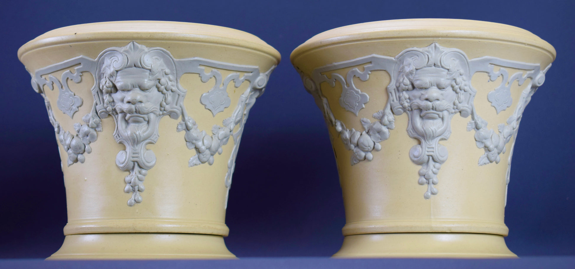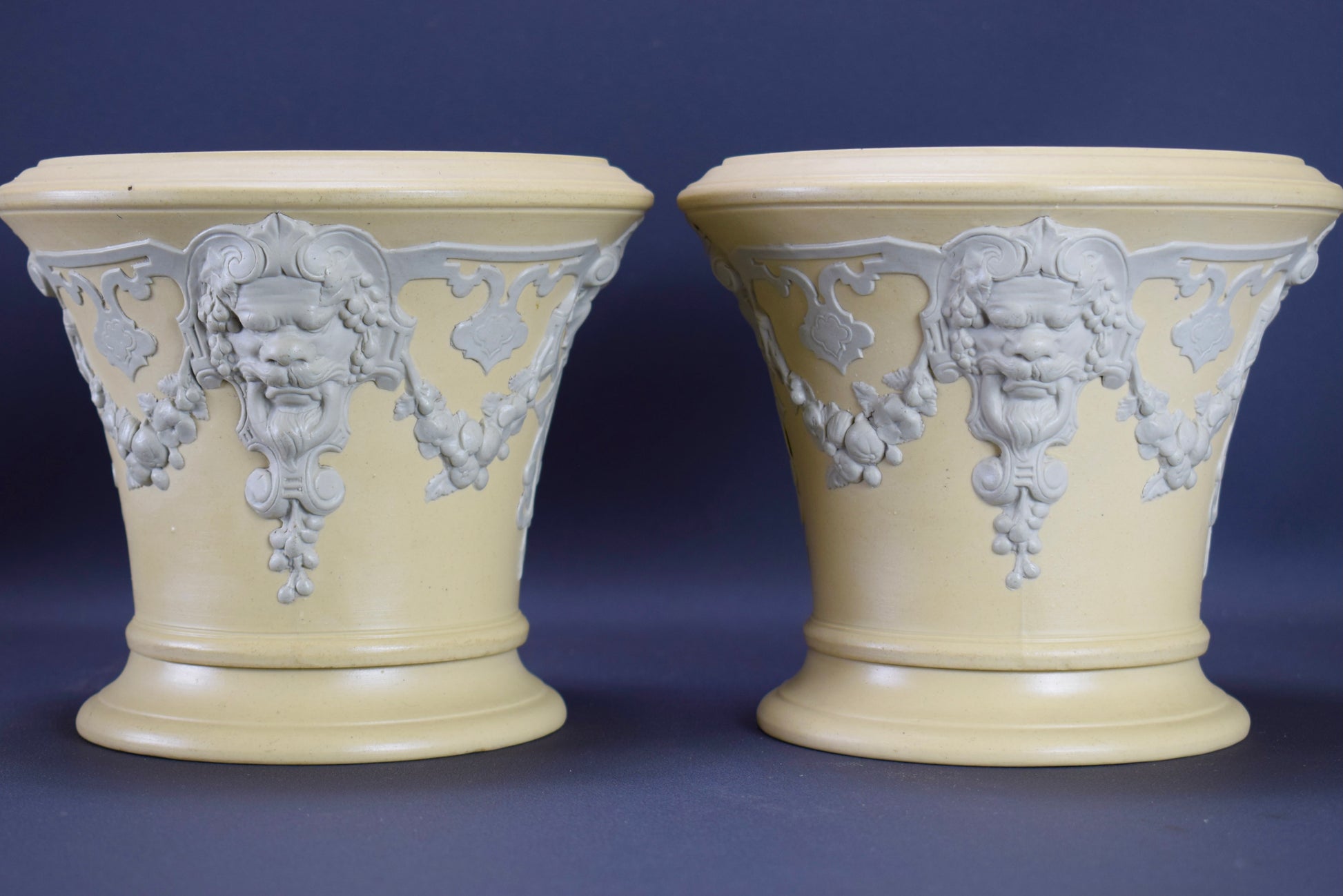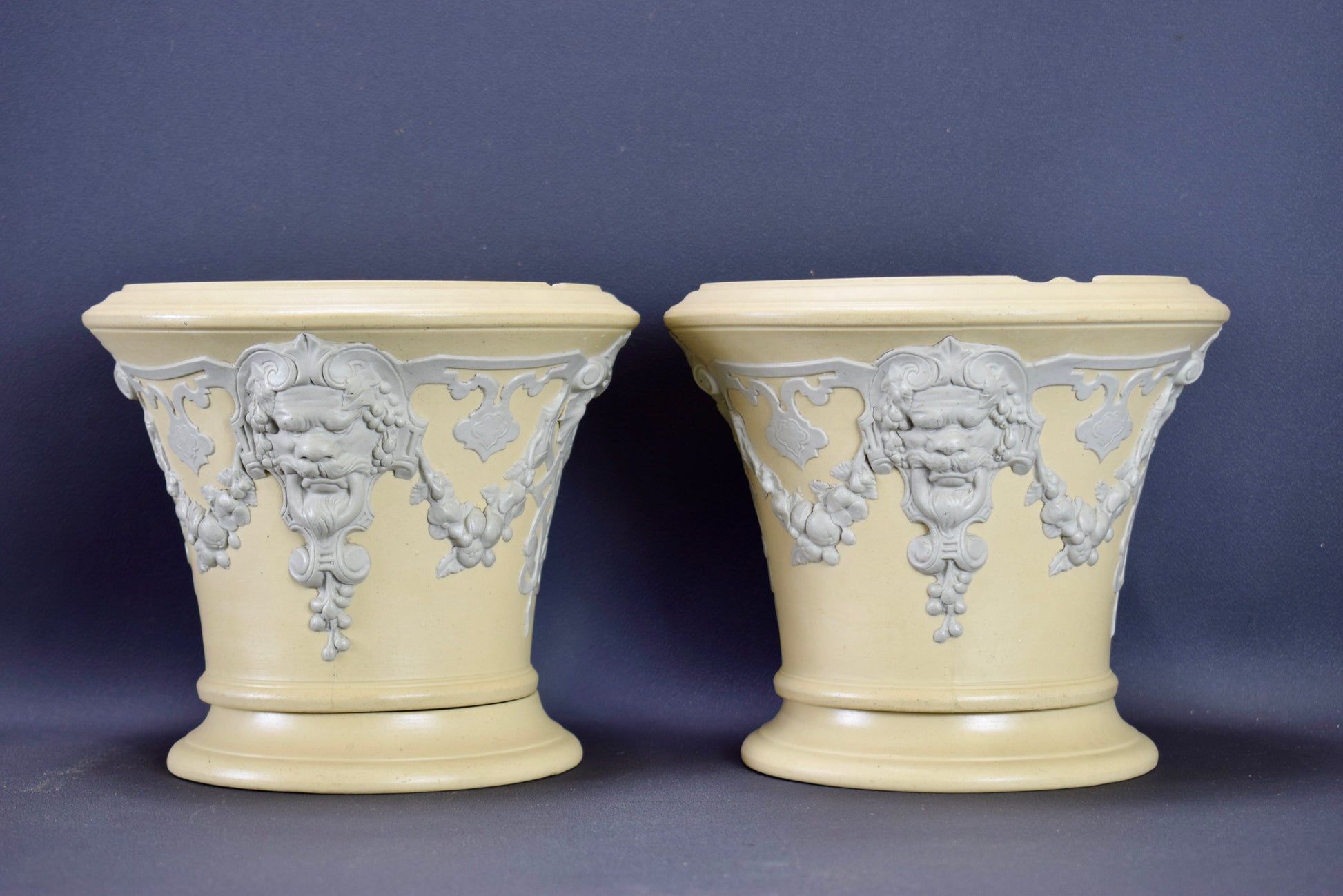 A fabulous pair of French cache pots, dating to the 1830's. The cache pots feature a whimisical decor with Mascarons and garlands. Beautiful elegant colors: a light gray on a yellow beige background. They would perfectly fit a modern interior. They are made of stoneware according to the English technique of the Jasper Ware (Wedgwood style). These rare cache pots were produced by the French ceramic factory Sarreguemines (eagle stamp).