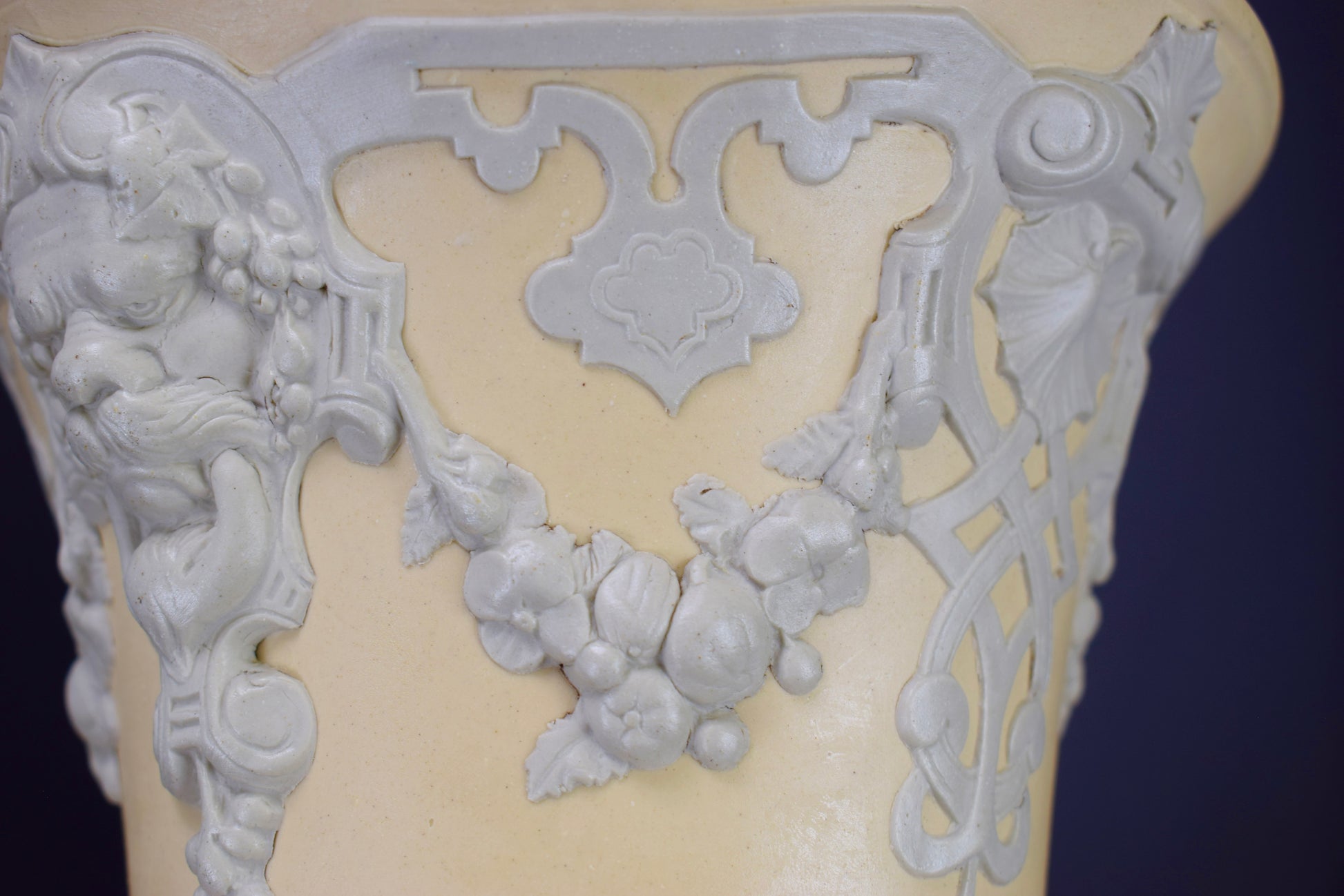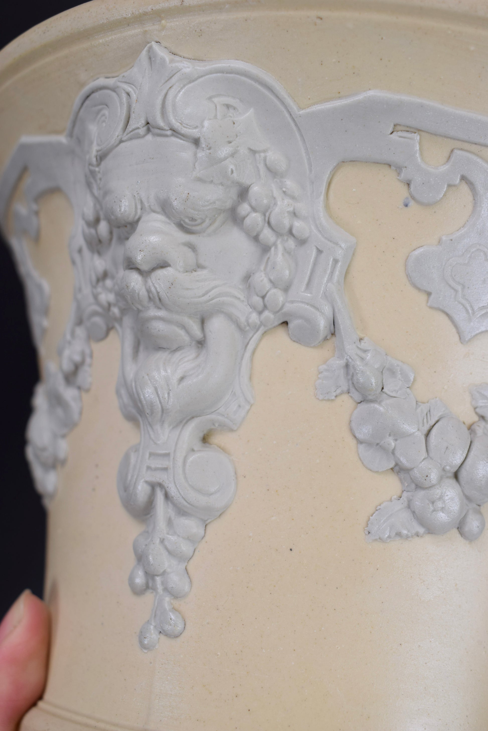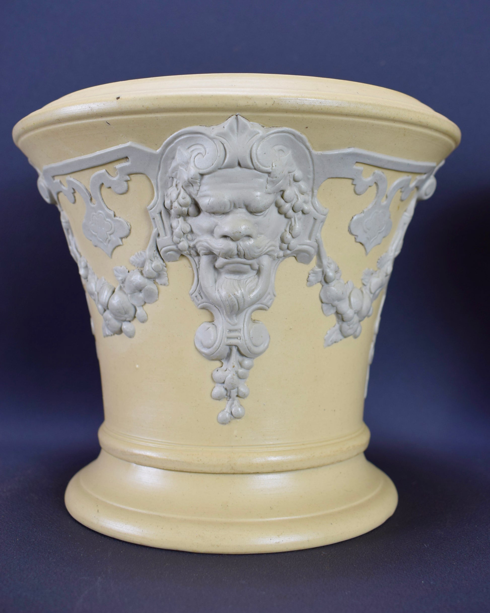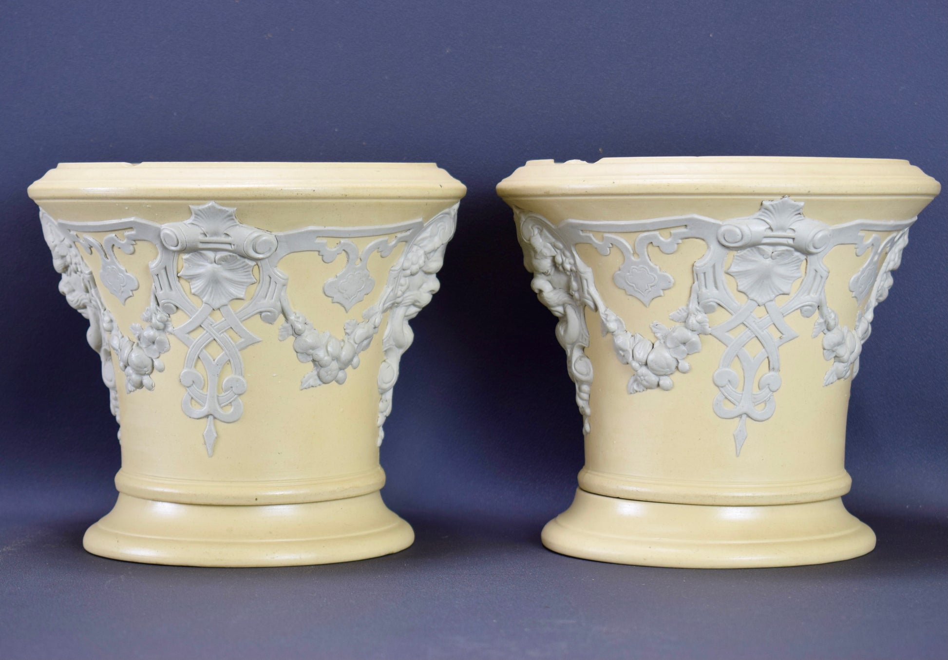 A fabulous pair of French cache pots, dating to the 1830's. The cache pots feature a whimisical decor with Mascarons and garlands. Beautiful elegant colors: a light gray on a yellow beige background. They would perfectly fit a modern interior. They are made of stoneware according to the English technique of the Jasper Ware (Wedgwood style). These rare cache pots were produced by the French ceramic factory Sarreguemines (eagle stamp).