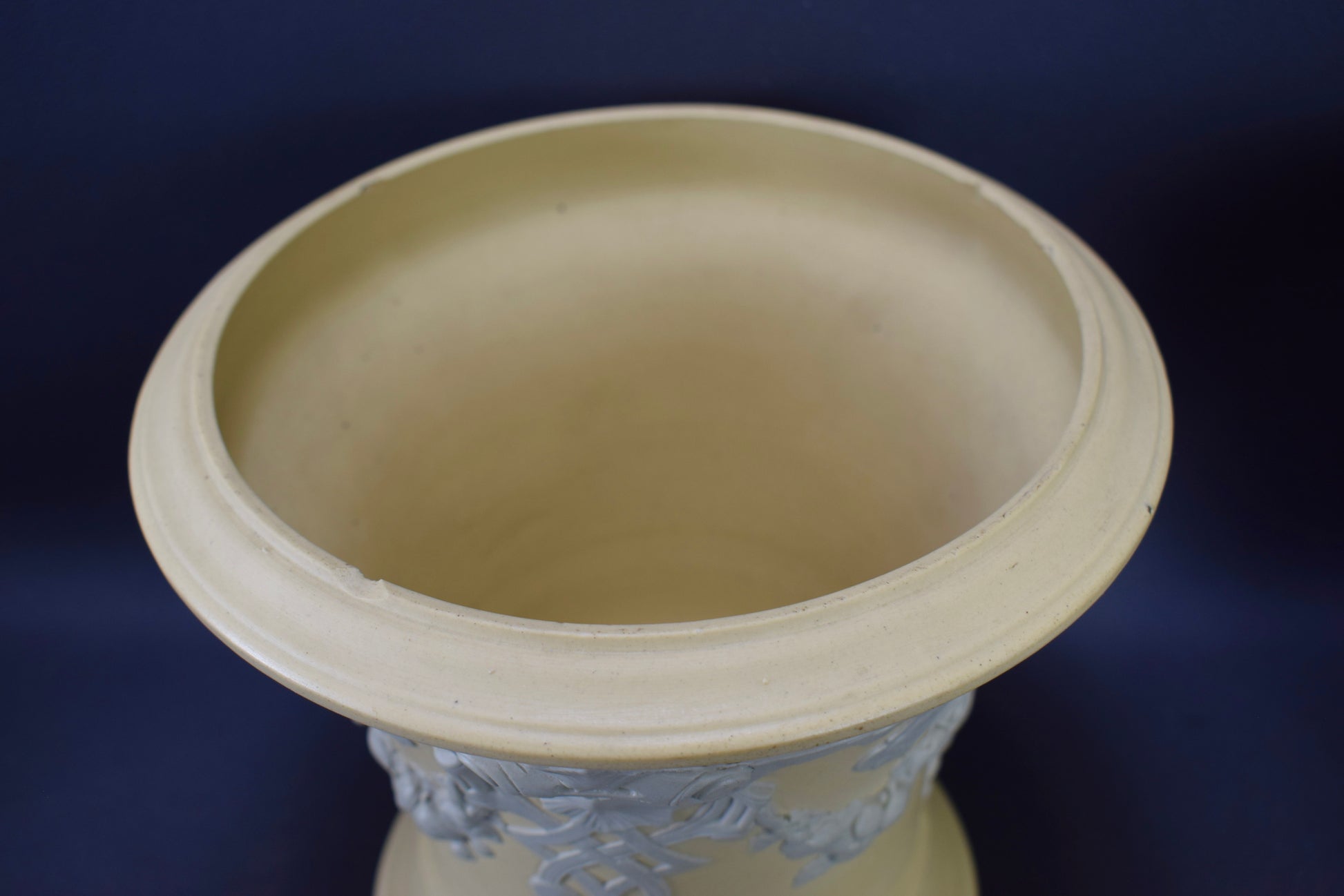 CONDITION: Splinters at the top rim (easily restorable) and a firing crack. Please take a close look at the photos, they are an integral part of the description.