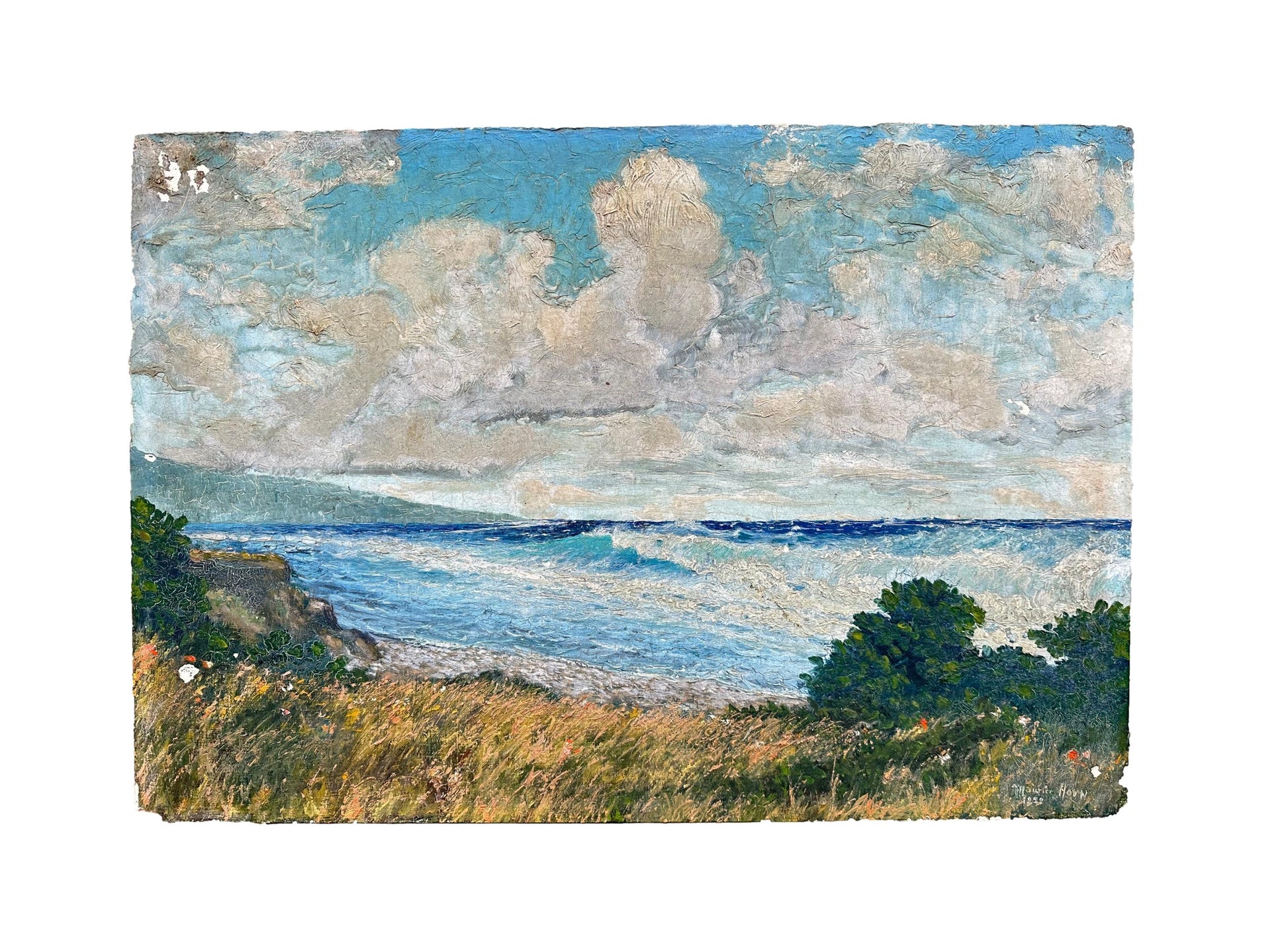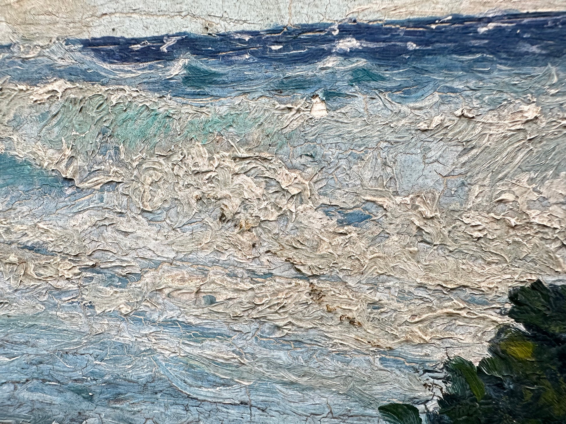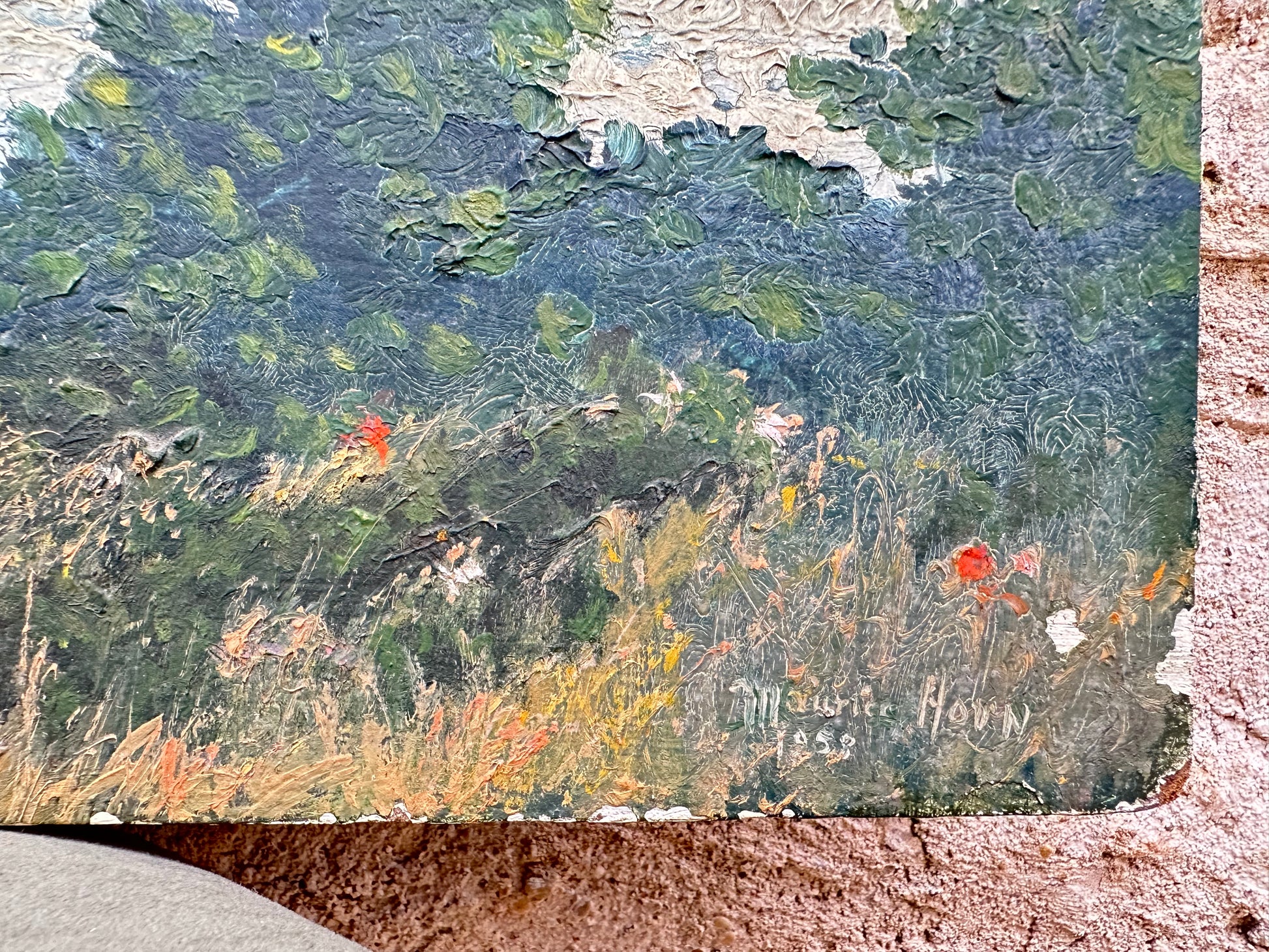 This French antique oil painting on board, dated 1958, vividly captures a dramatic coastal scene with a rough sea and a cloudy sky. The artist, Maurice Houn, has expertly rendered the intensity of nature, using bold, expressive brushstrokes to portray the movement of the waves crashing against the shore.