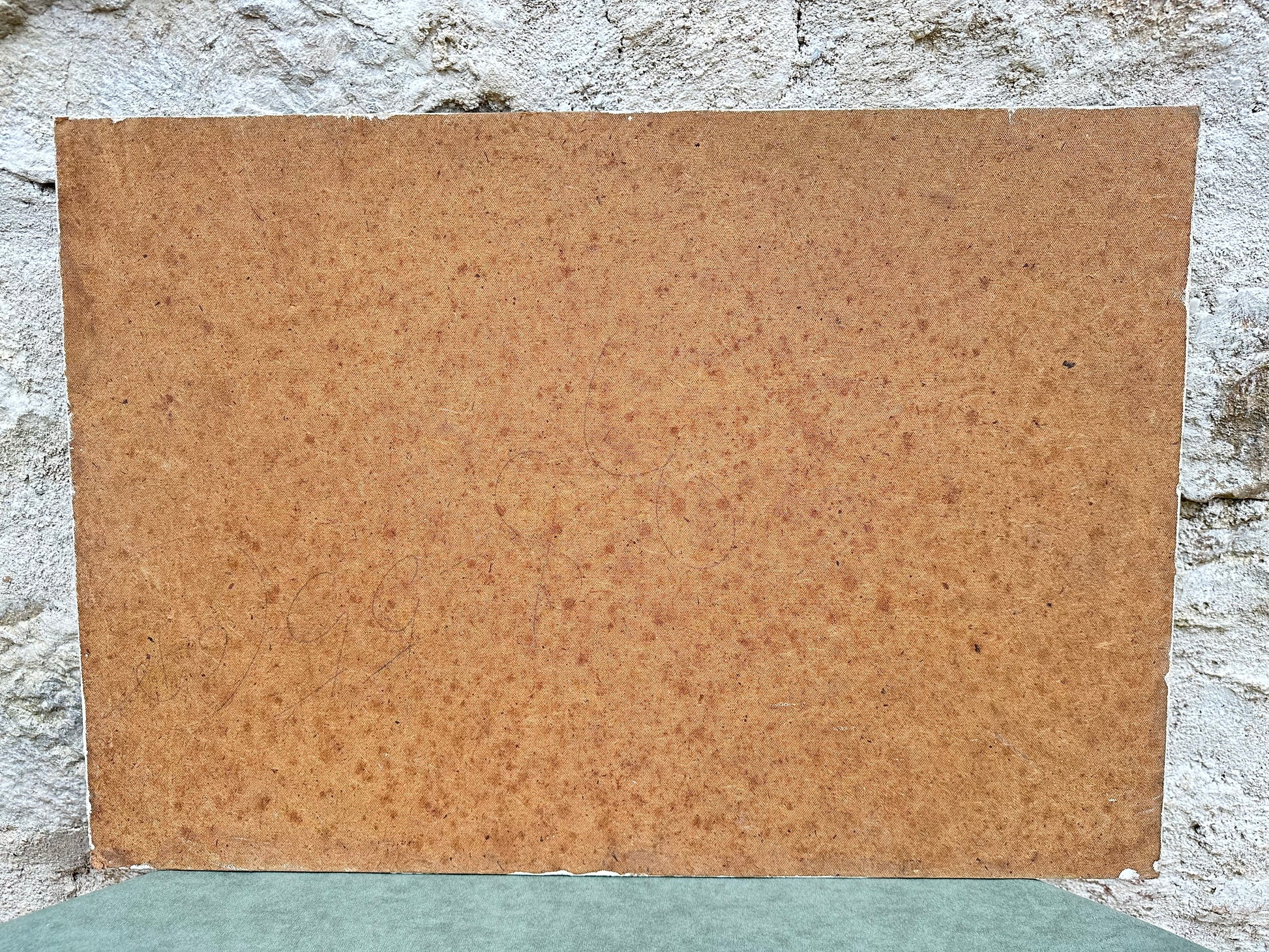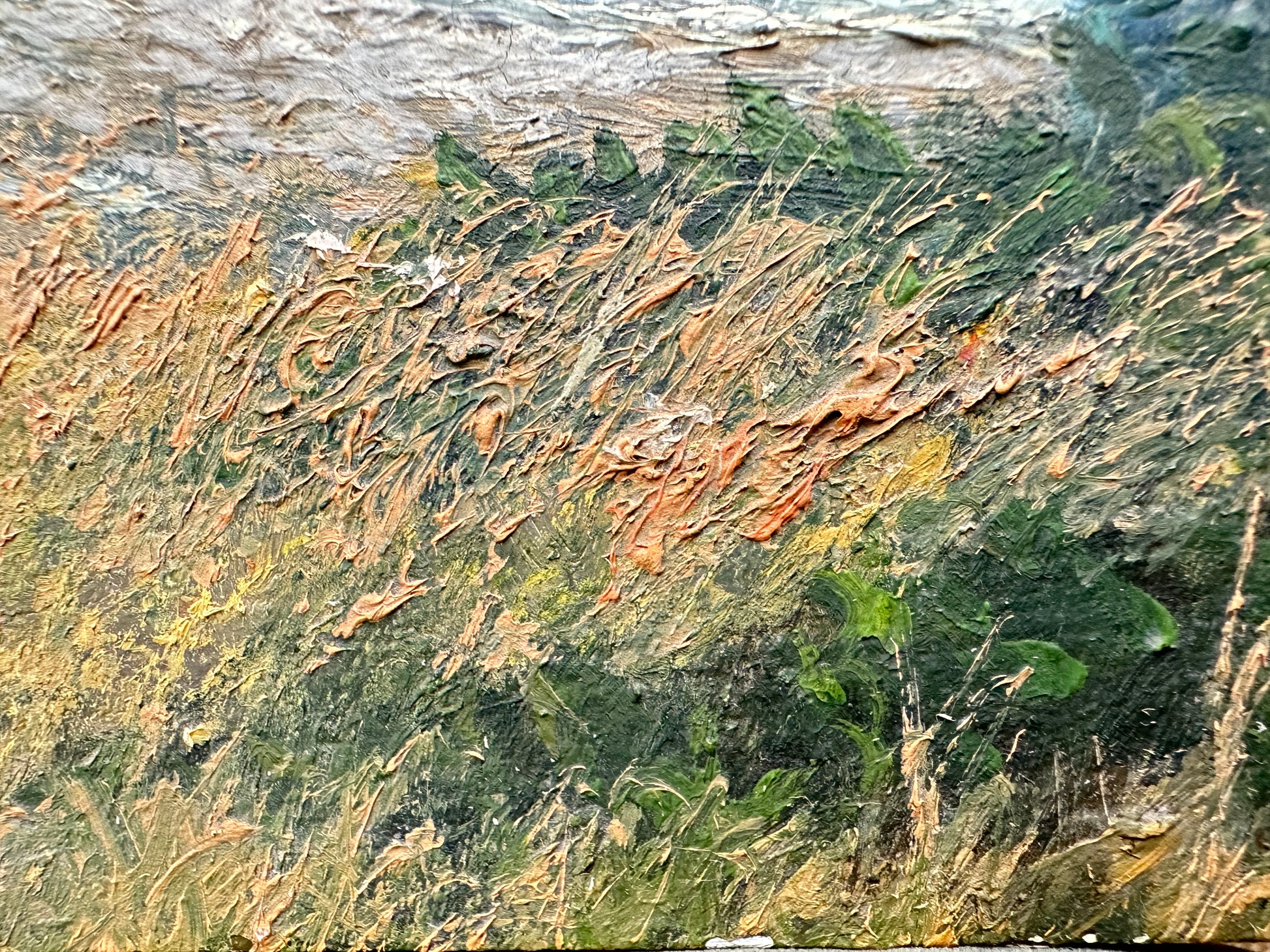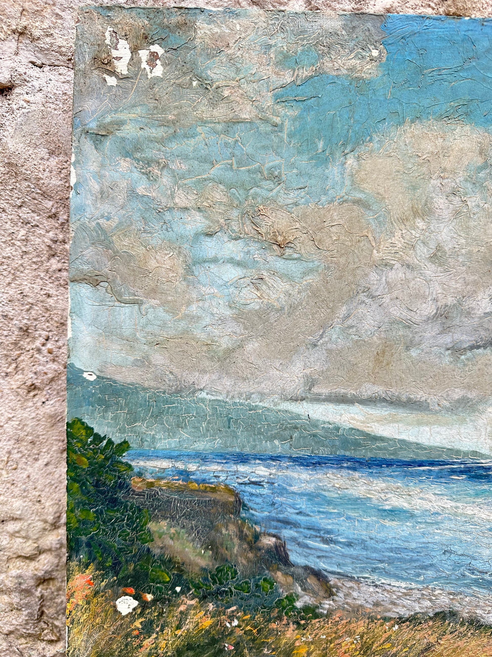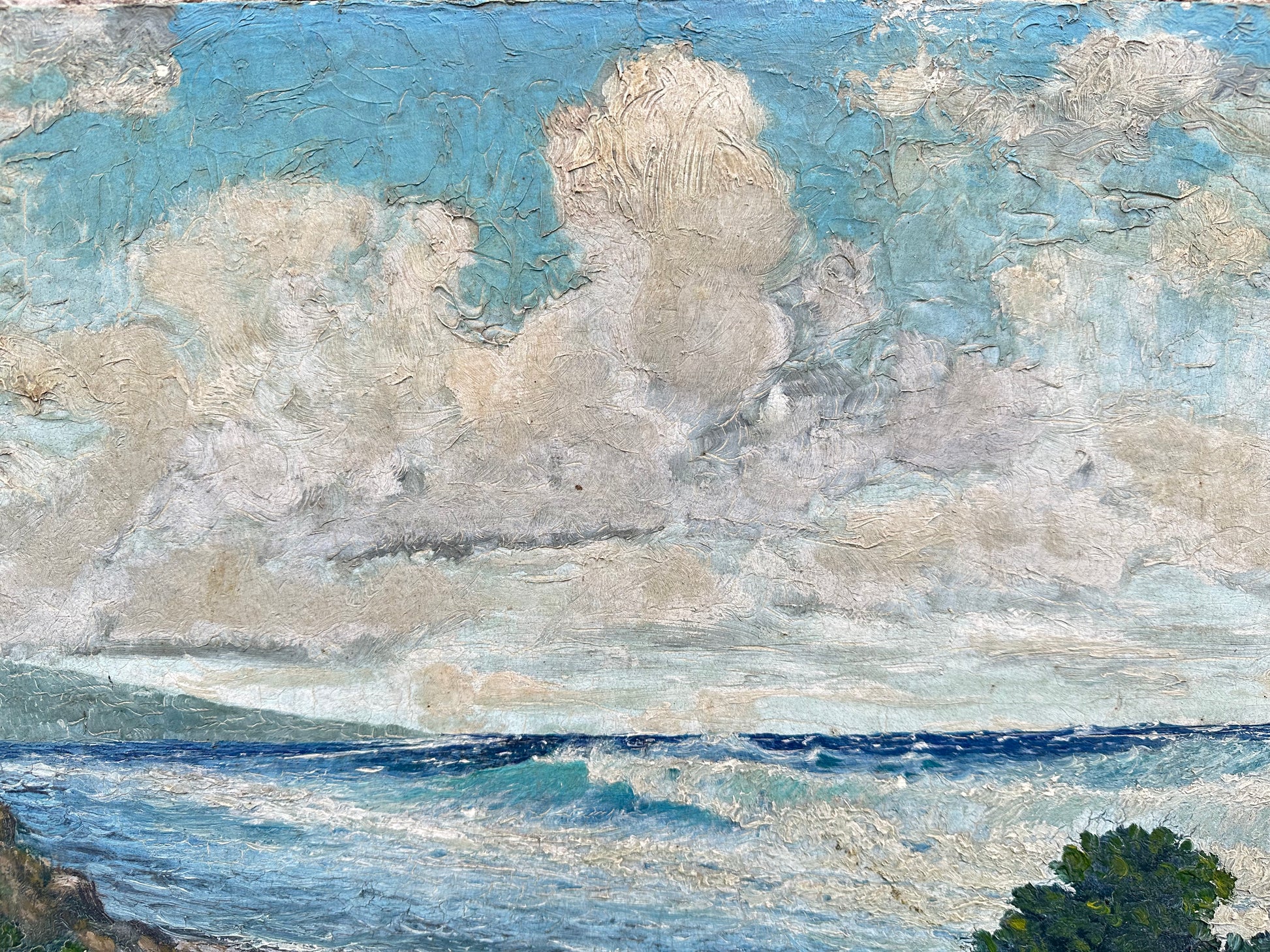 This French antique oil painting on board, dated 1958, vividly captures a dramatic coastal scene with a rough sea and a cloudy sky. The artist, Maurice Houn, has expertly rendered the intensity of nature, using bold, expressive brushstrokes to portray the movement of the waves crashing against the shore.