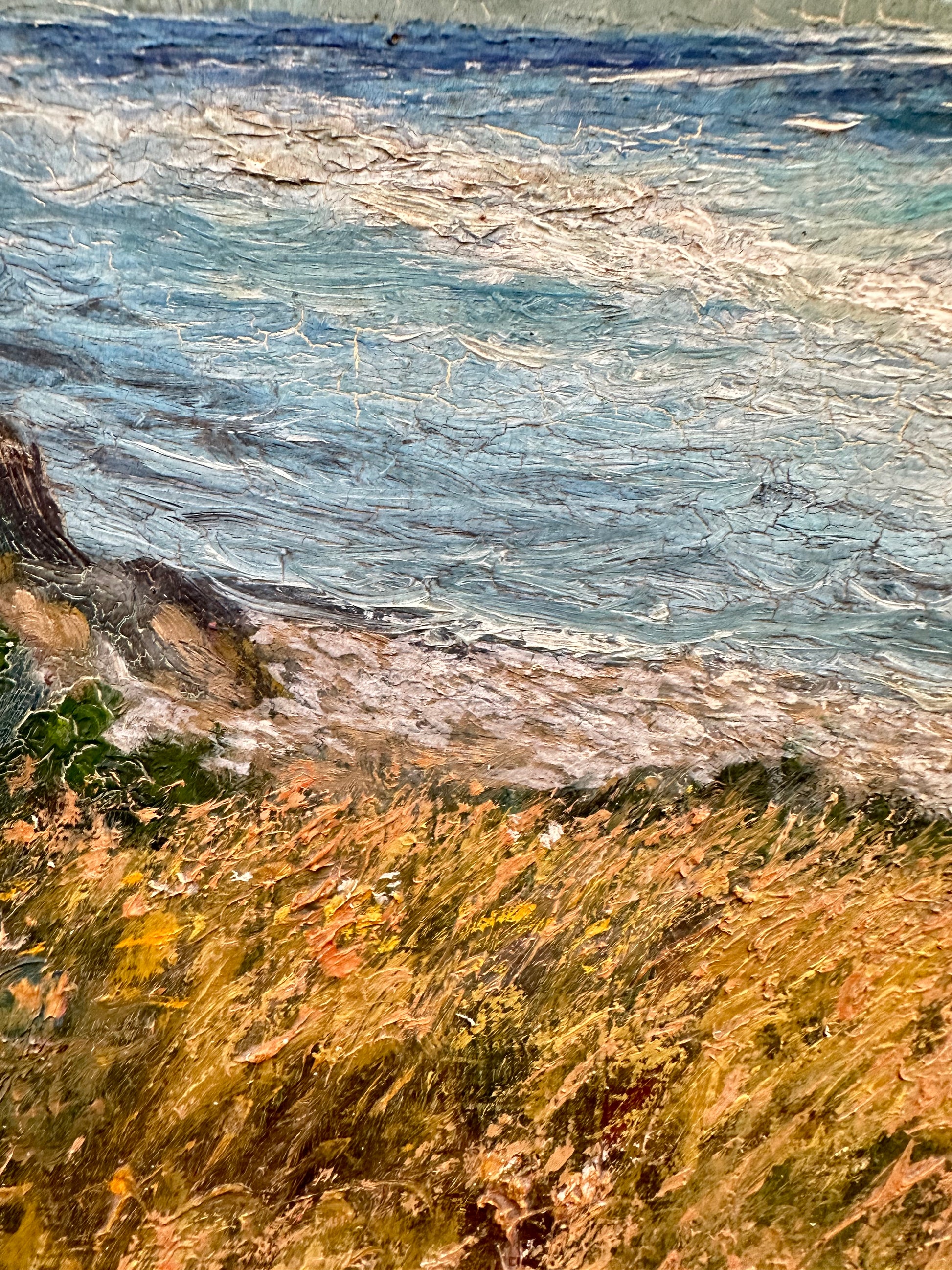 The palette is rich in moody blues, greys, and whites, emphasizing the raw power of the ocean and the cloudy sky. Signed by Maurice Houn, this work exemplifies the artist’s ability to convey both the beauty and unpredictability of coastal landscapes. The painting’s dynamic composition and textured brushwork evoke a strong sense of the natural elements in motion.