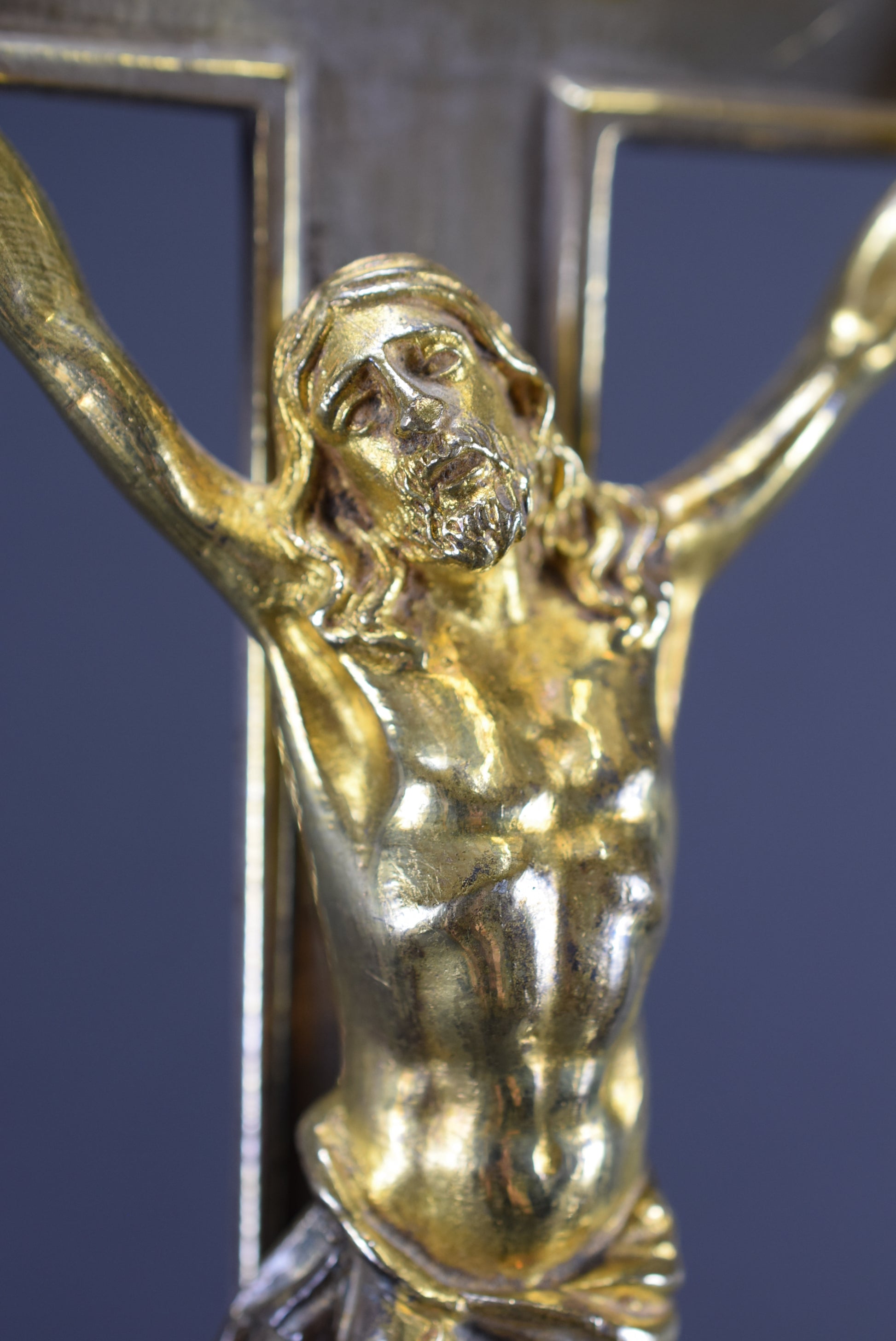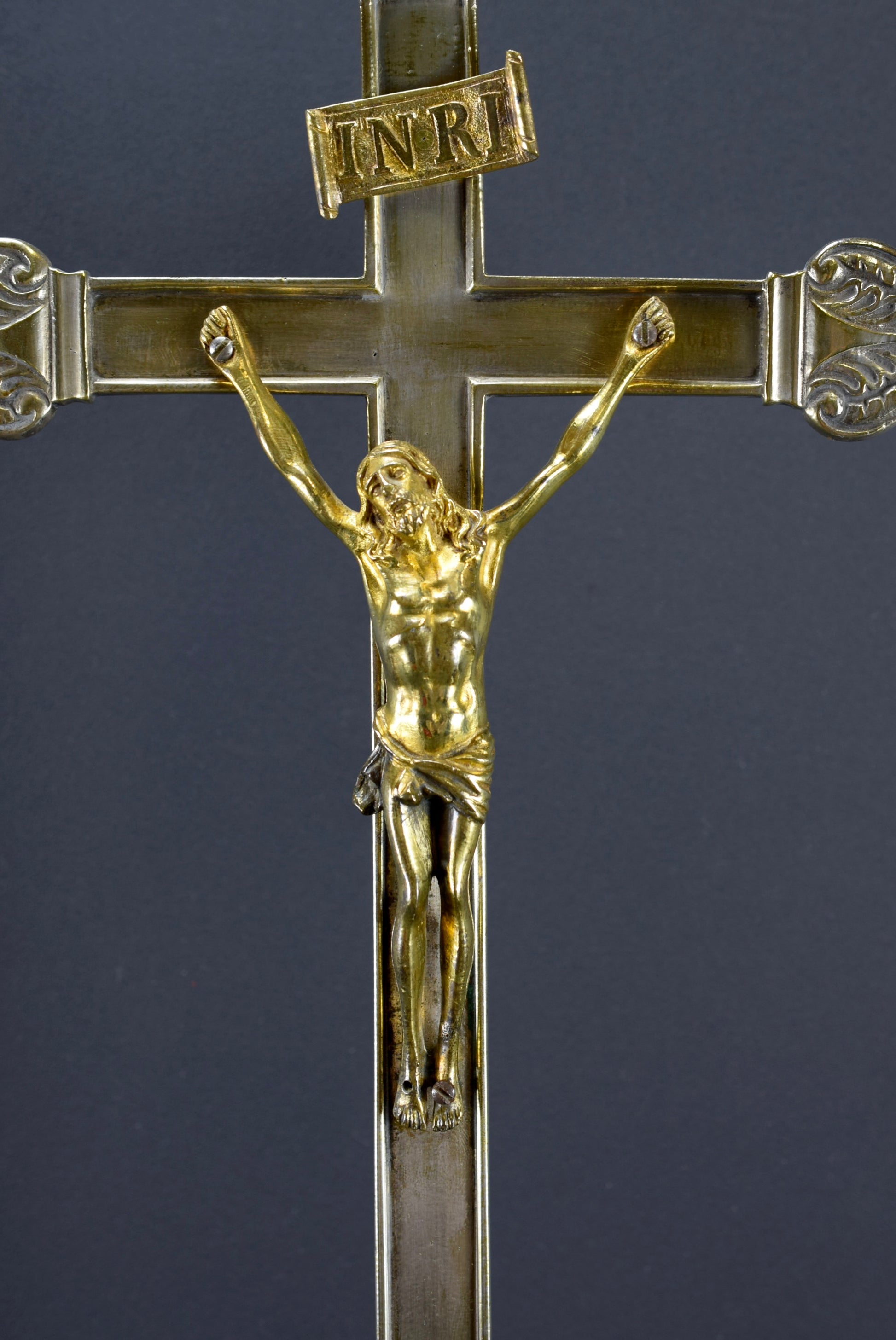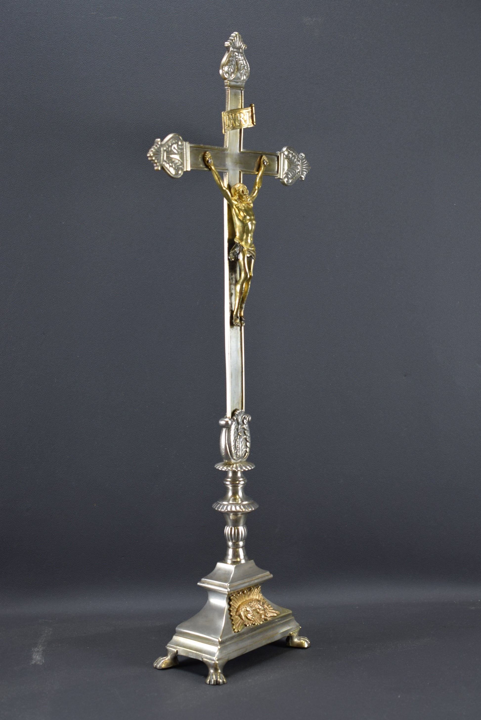 A gorgeous French antique standing cross dating to the 19th century. The altar crucifix measures 23 3/8 inches high (59,5cm). The beautiful religious piece displays an INRI plaque and a lamb. Lion paws feet. Acanthus leaves motifs. Magnificent work.