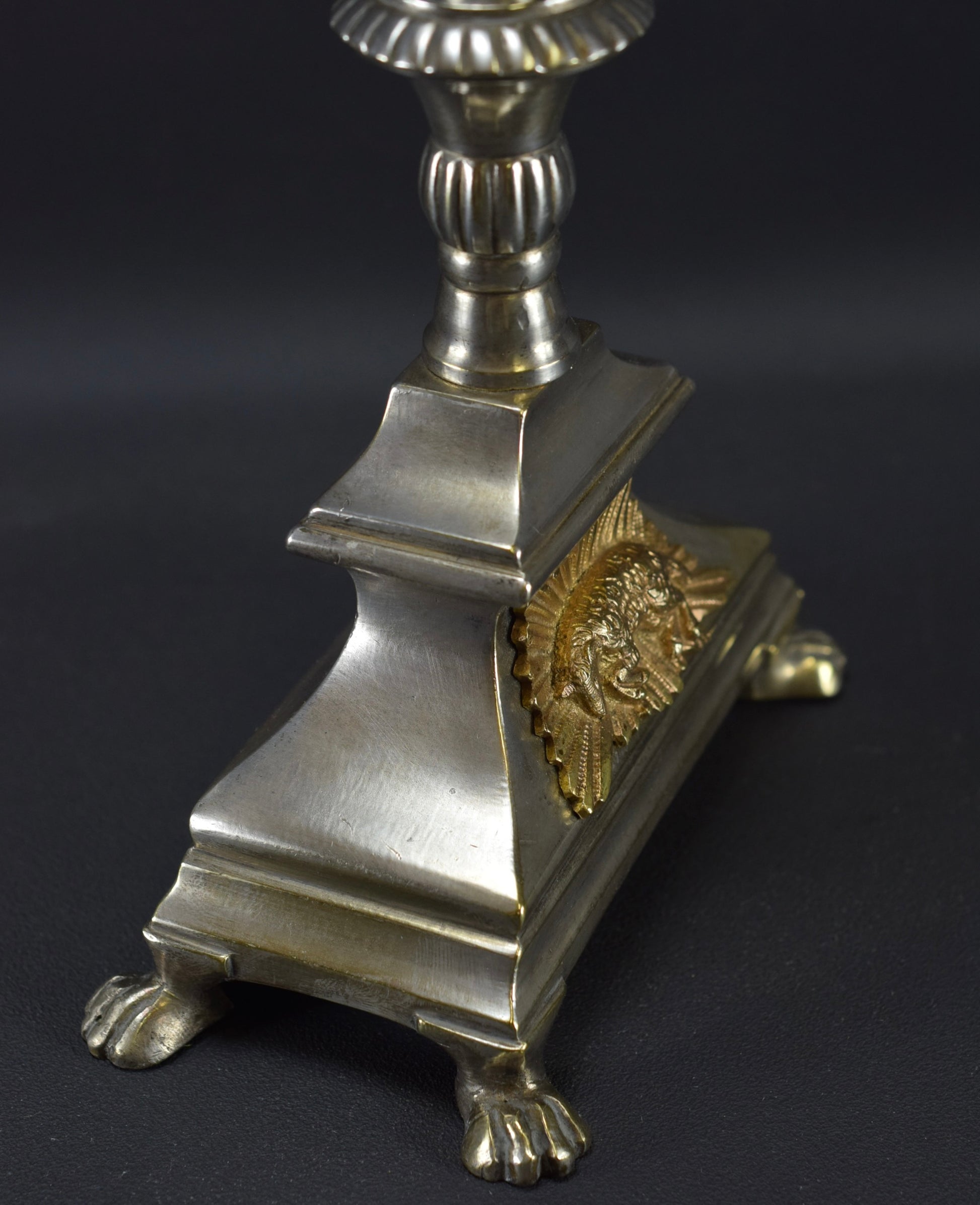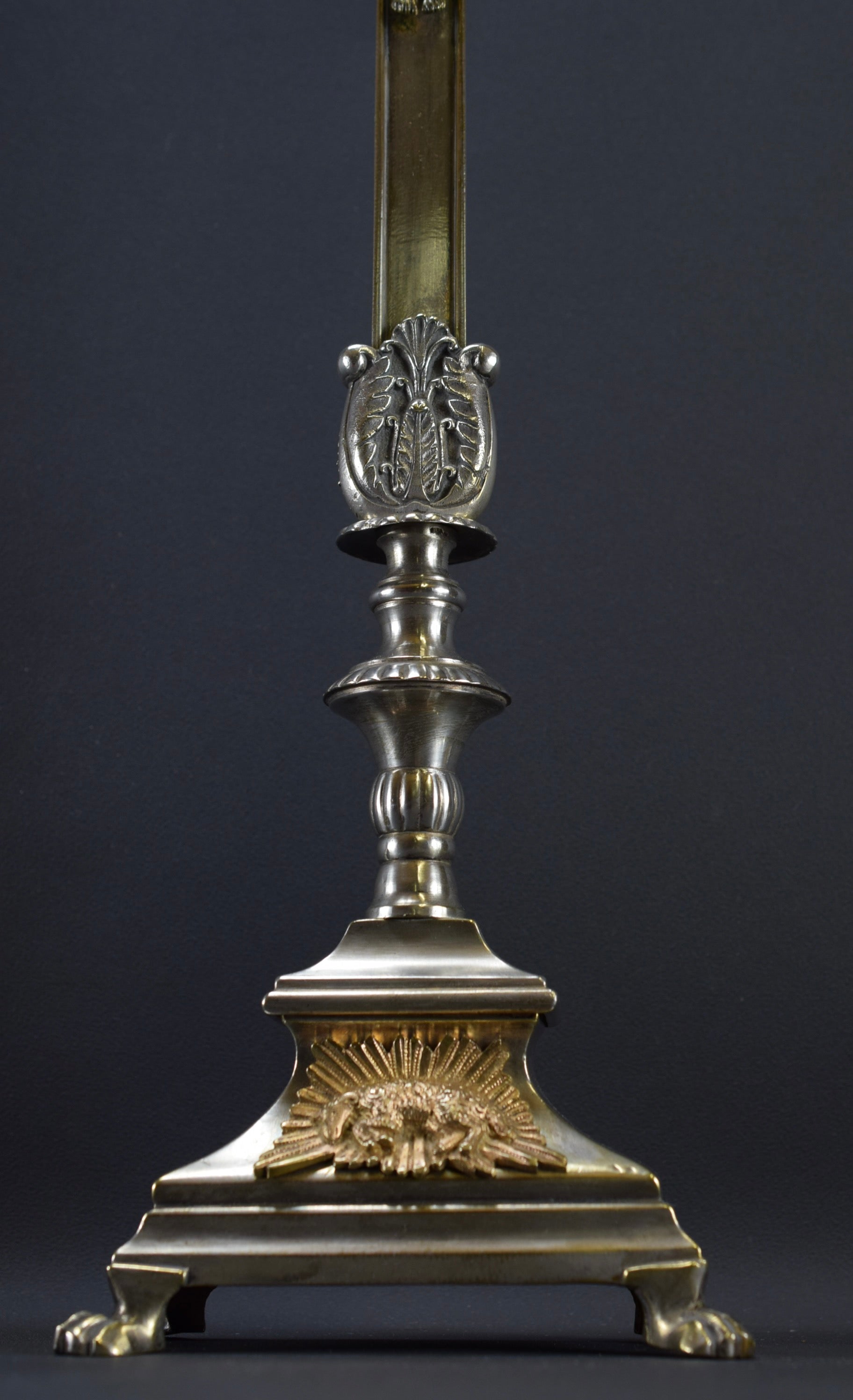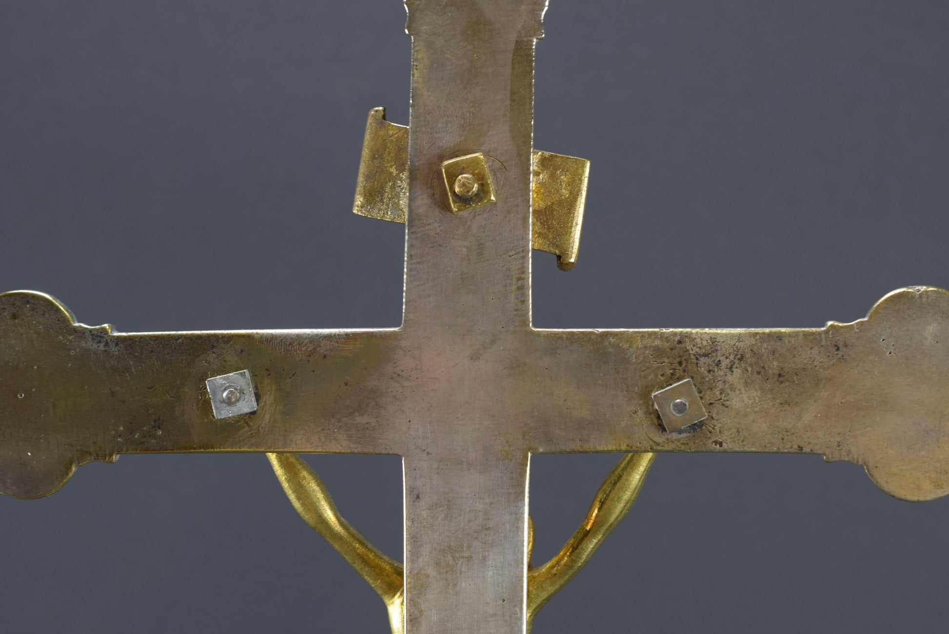 A gorgeous French antique standing cross dating to the 19th century. The altar crucifix measures 23 3/8 inches high (59,5cm). The beautiful religious piece displays an INRI plaque and a lamb. Lion paws feet. Acanthus leaves motifs. Magnificent work.