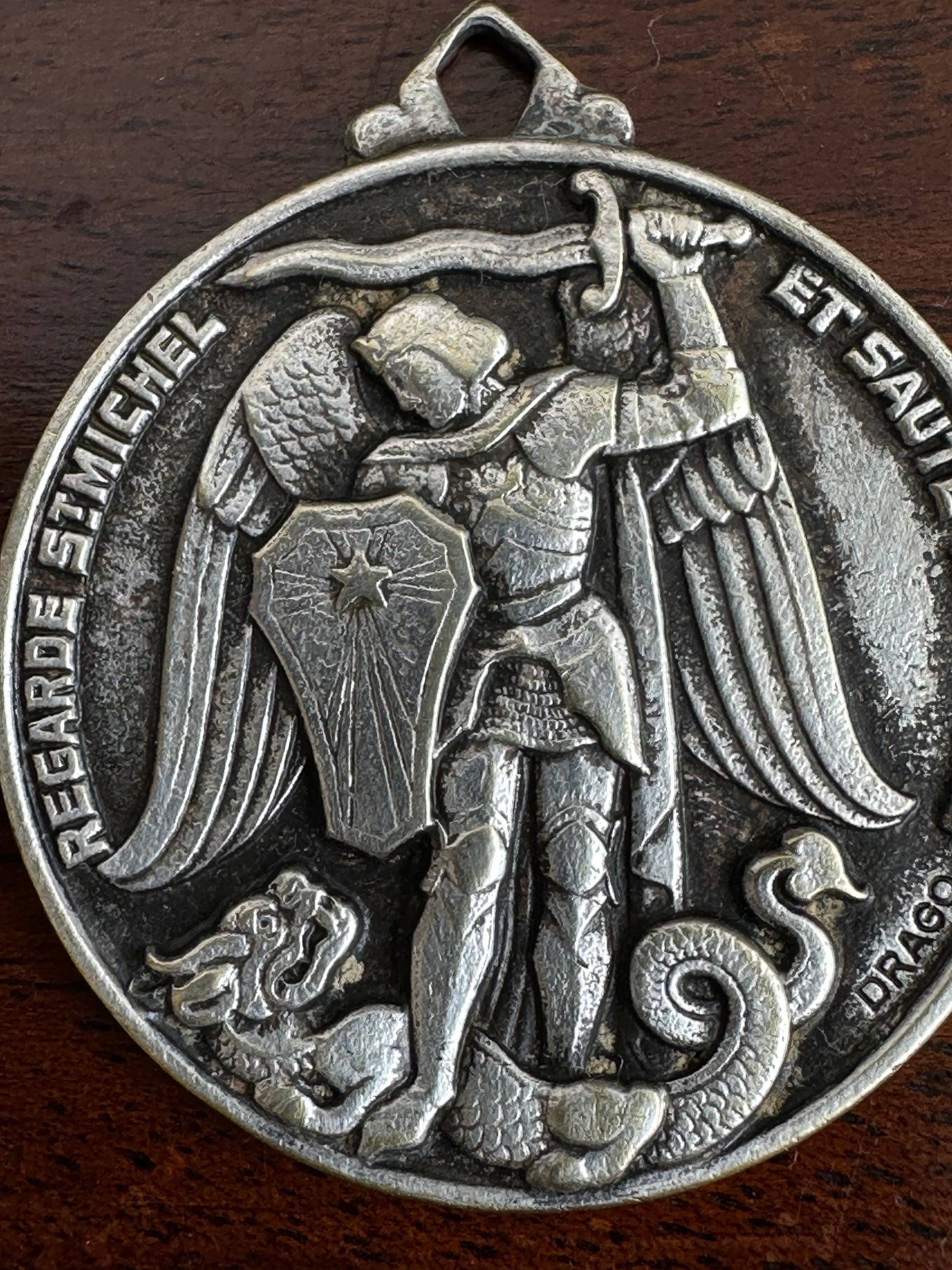 This is a beautiful vintage French religious medal made by the famous French engraver Drago. The pendant features Saint Michael against the Dragon and the inscription "Look at Saint Michael and jump reassured". The large amulet measures 1 1/4 inches diameter (3.3cm). It was made for the first squadron of parachutists. Fine details.