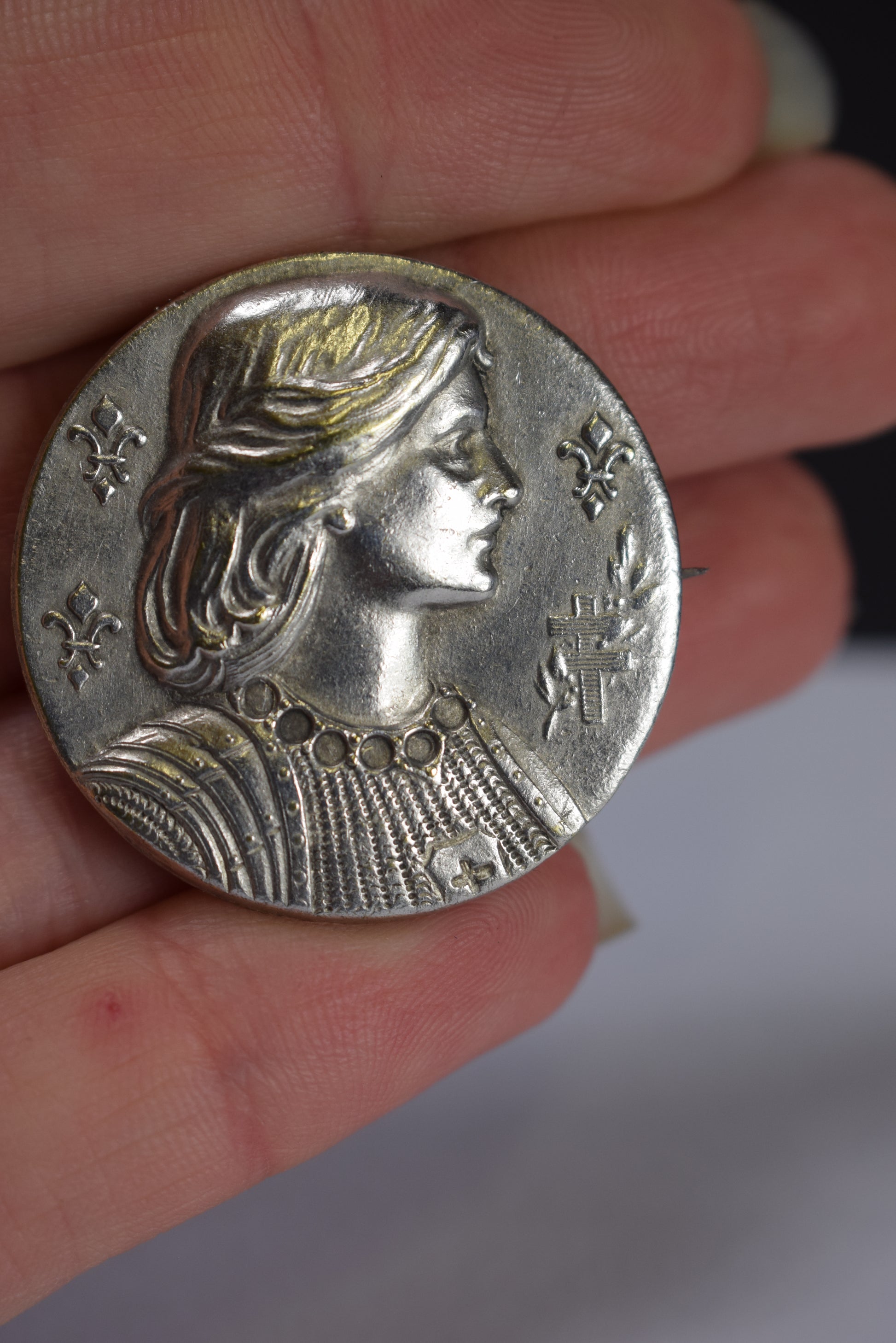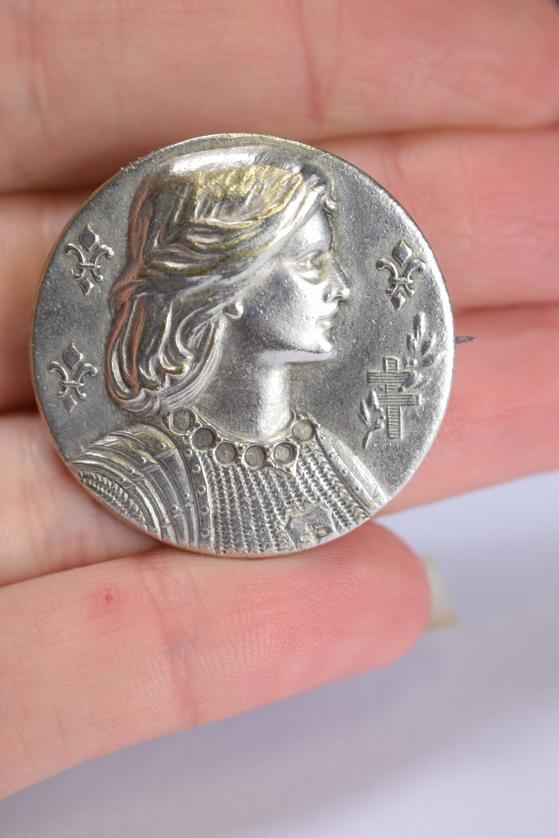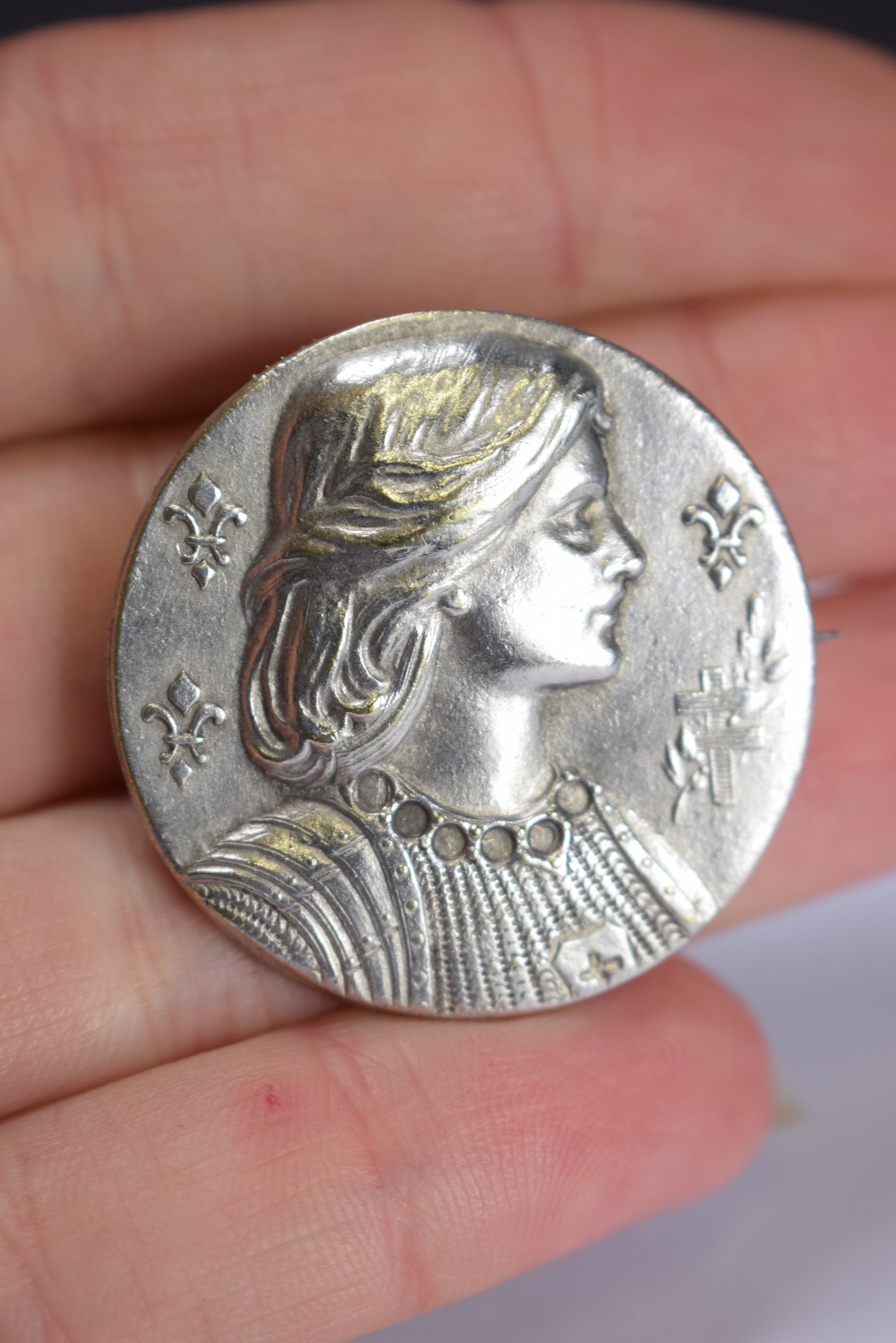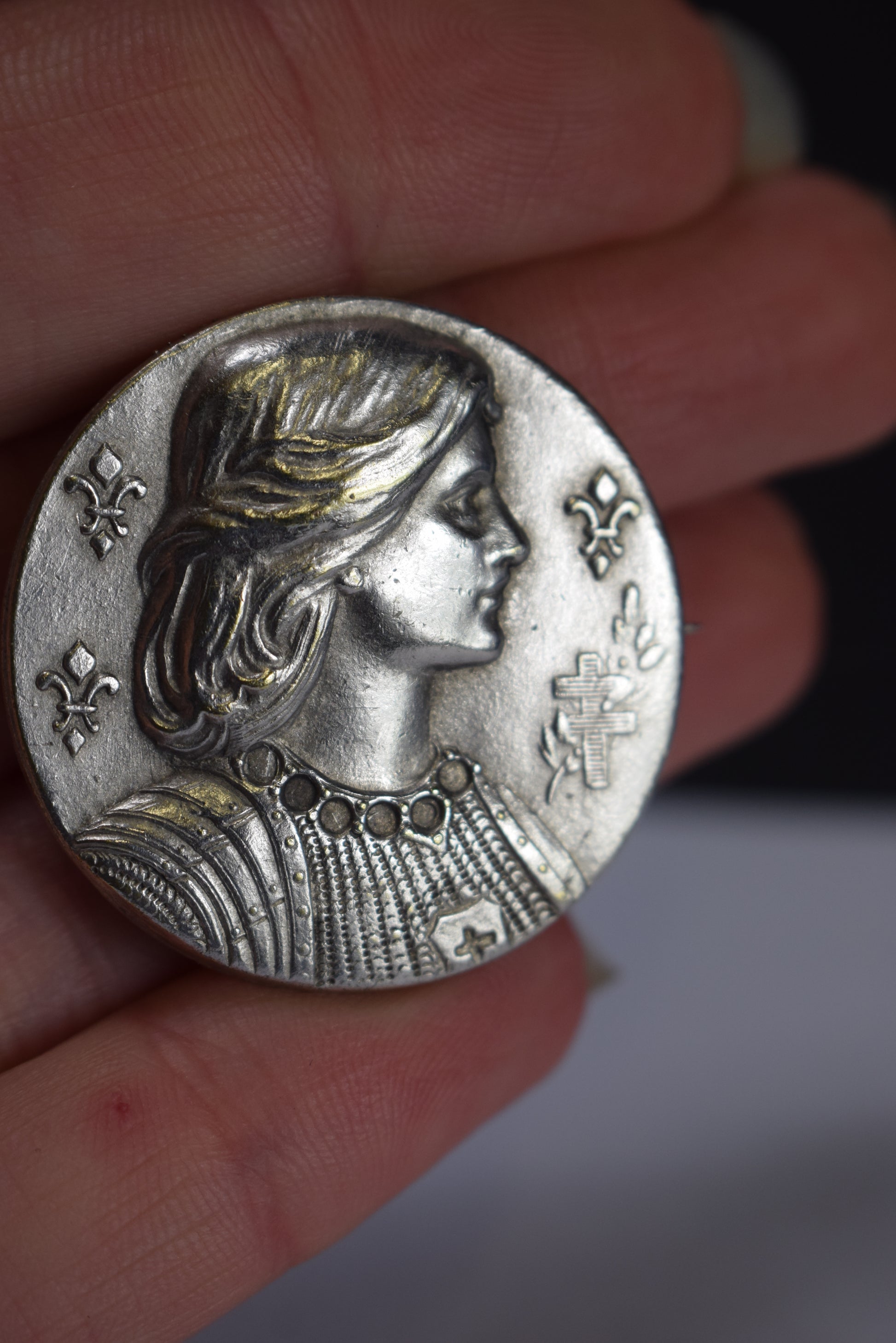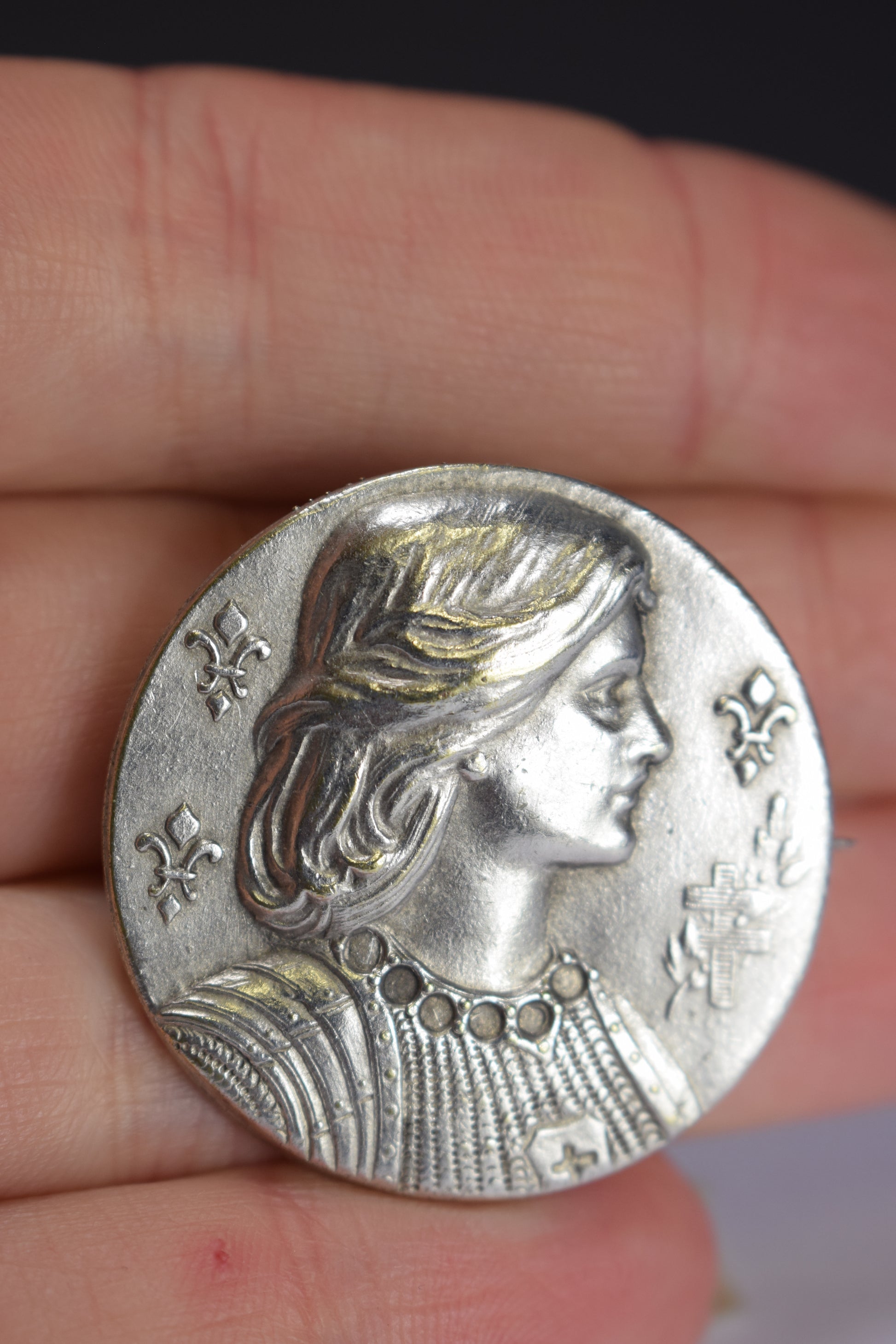 A beautiful French antique brooch dating to the early 20th century. The fine Art Nouveau silverplated metal jewelry features Saint Joan of Arc. Fleur de lis and Lorrain cross details. Large diameter, the pin brooch measures 1 1/4 inches diameter (3.2cm). Offered in a beautify jewelry pouch.