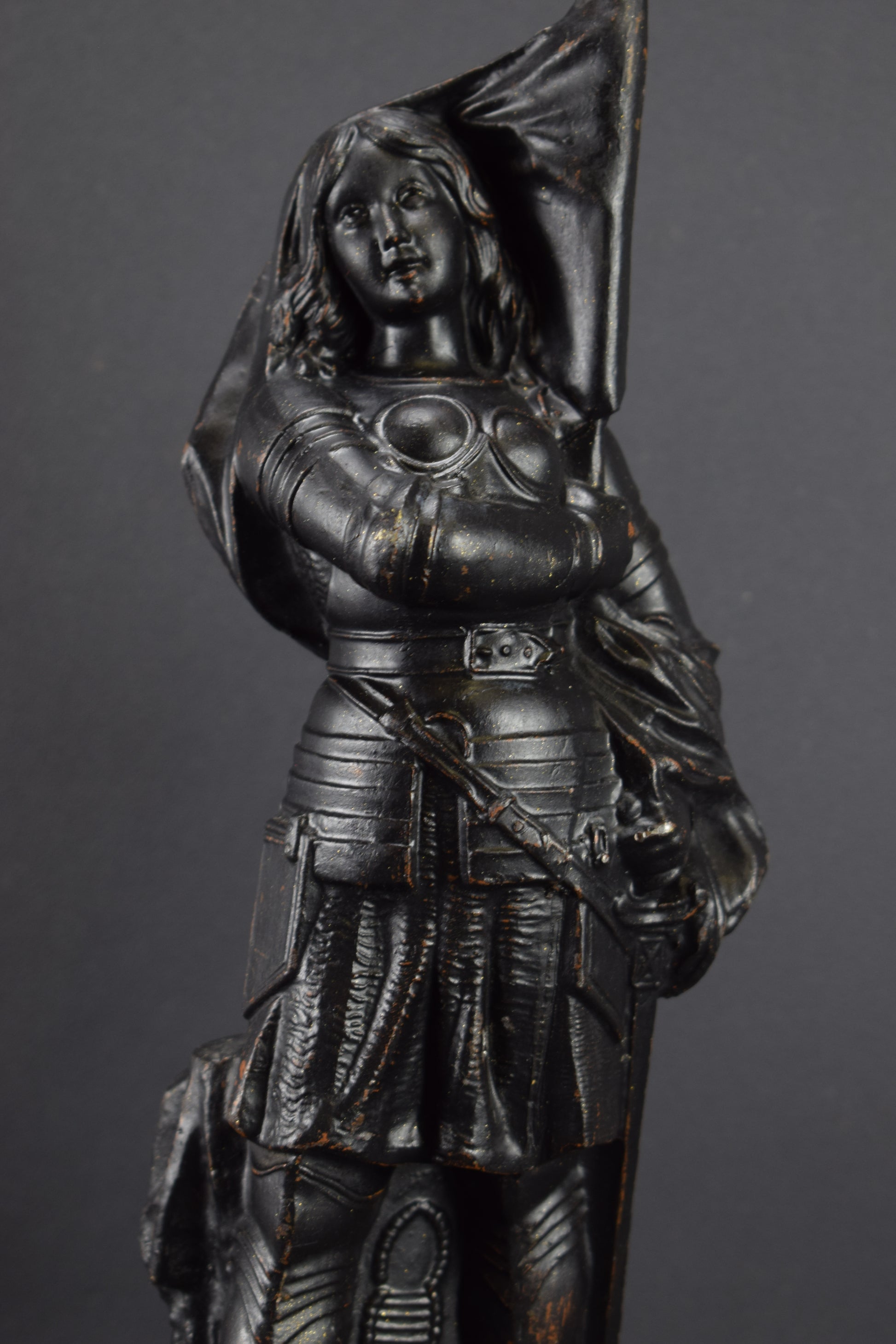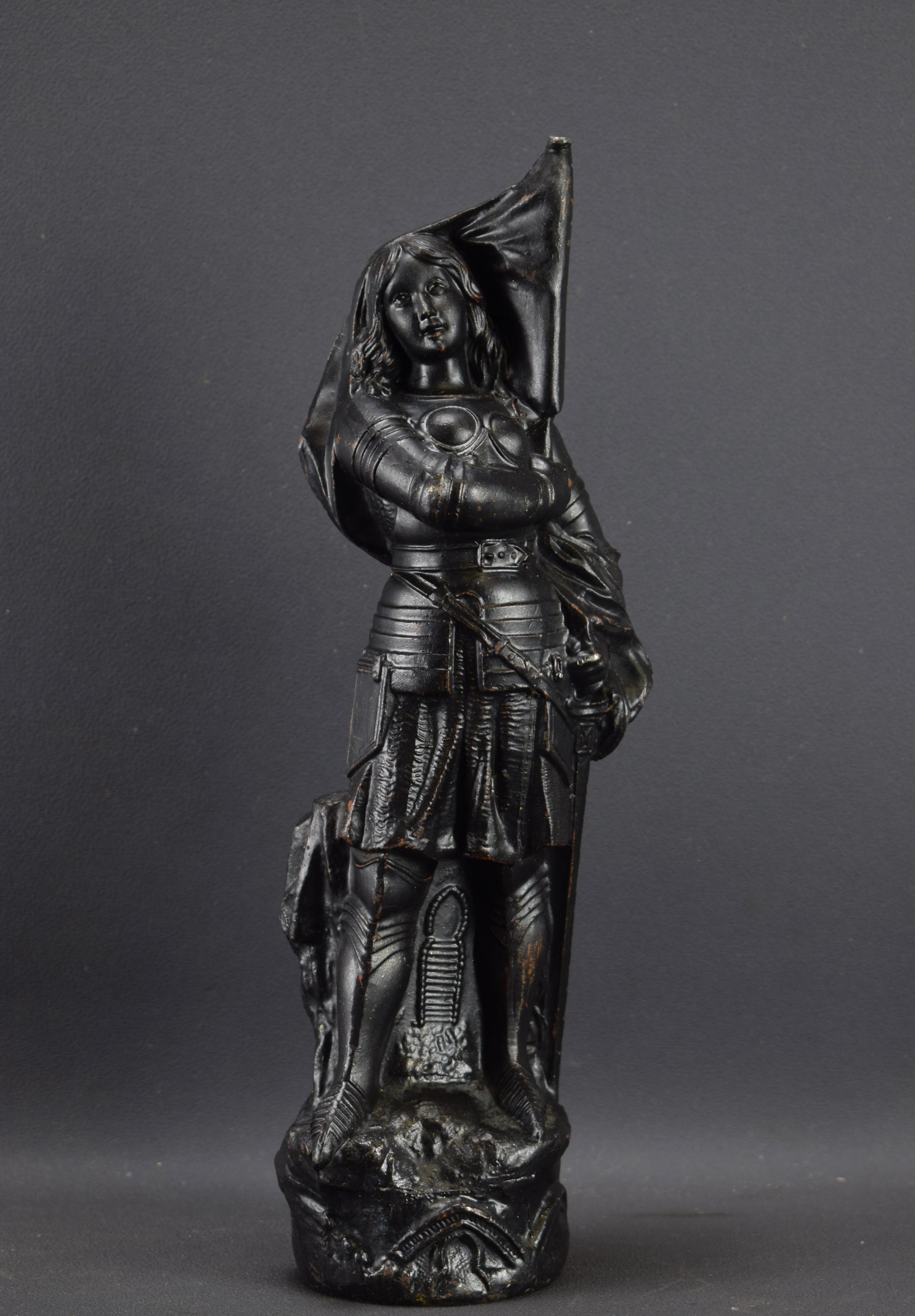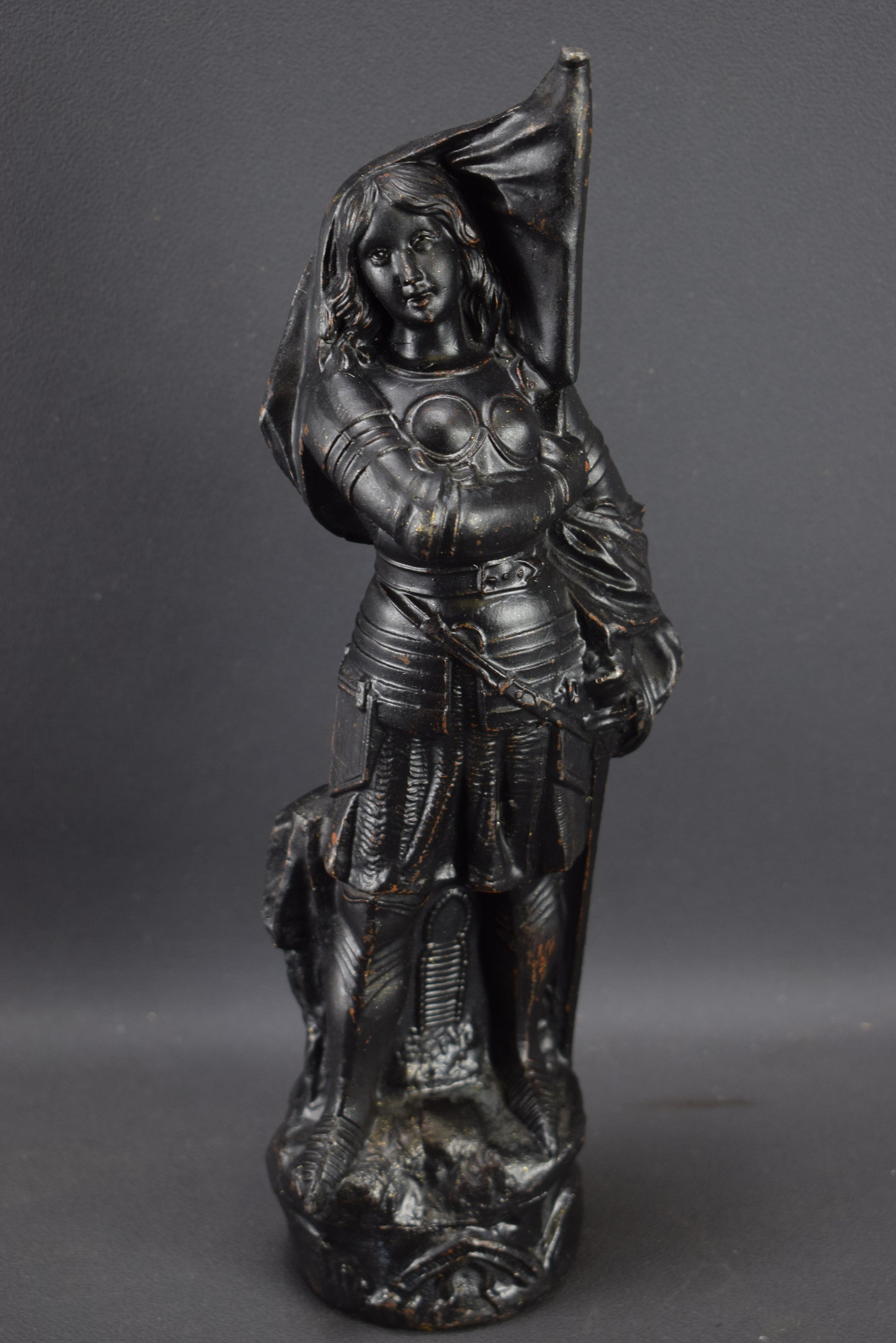 A French vintage religious statue of Saint Joan of Arc. The 11 5/8 inches high statuette depicts the Saint wearing an armor and holding a flag.