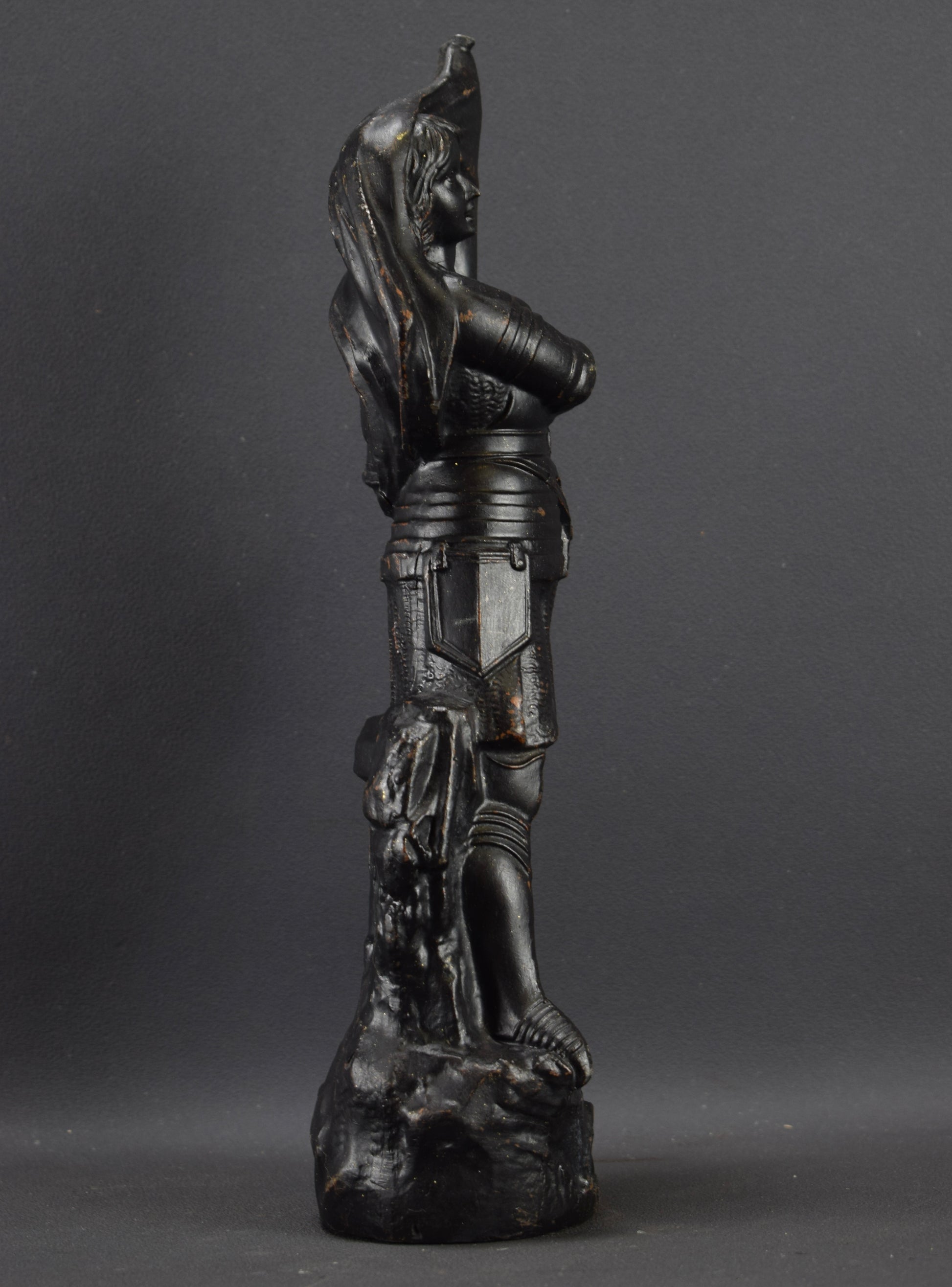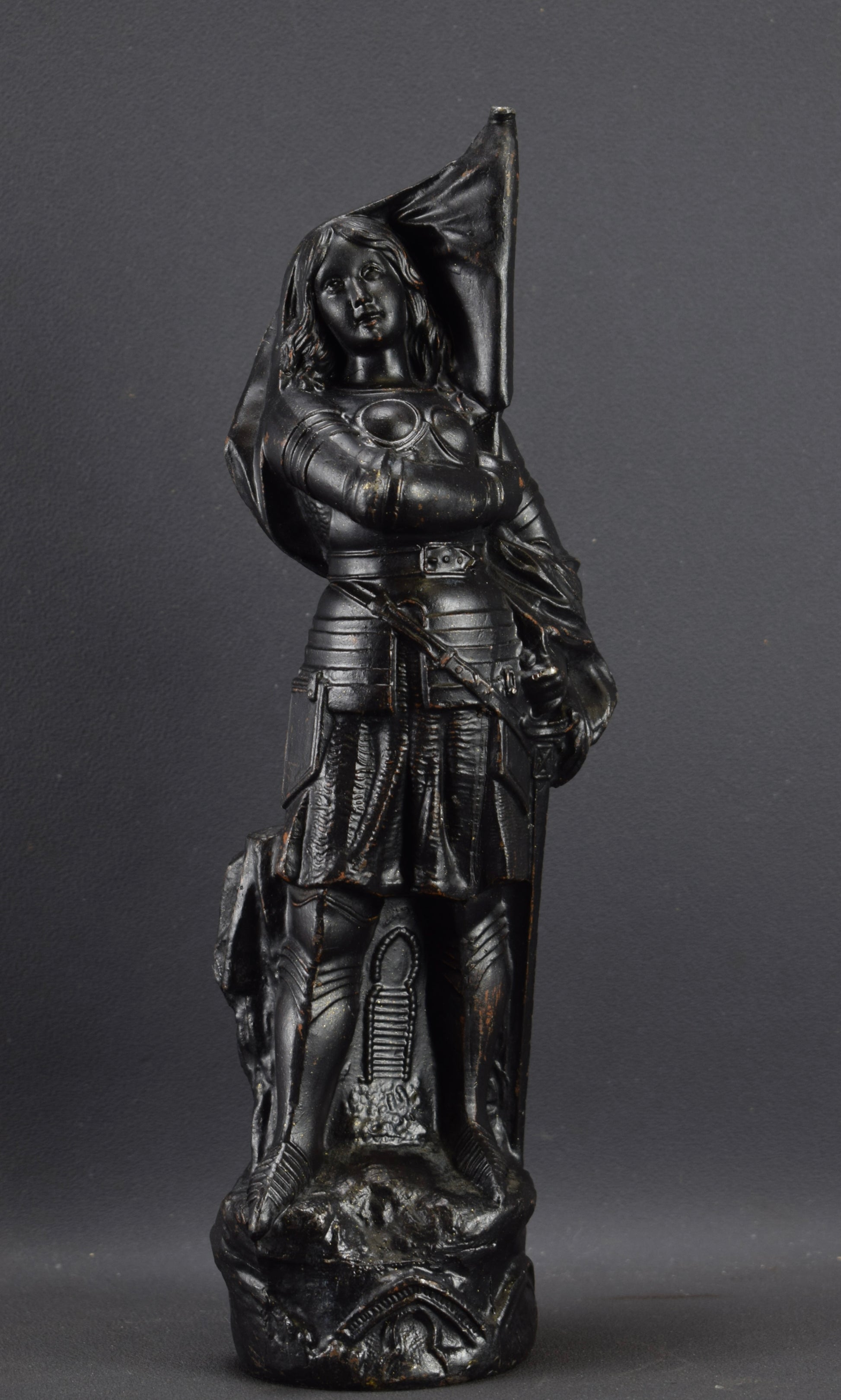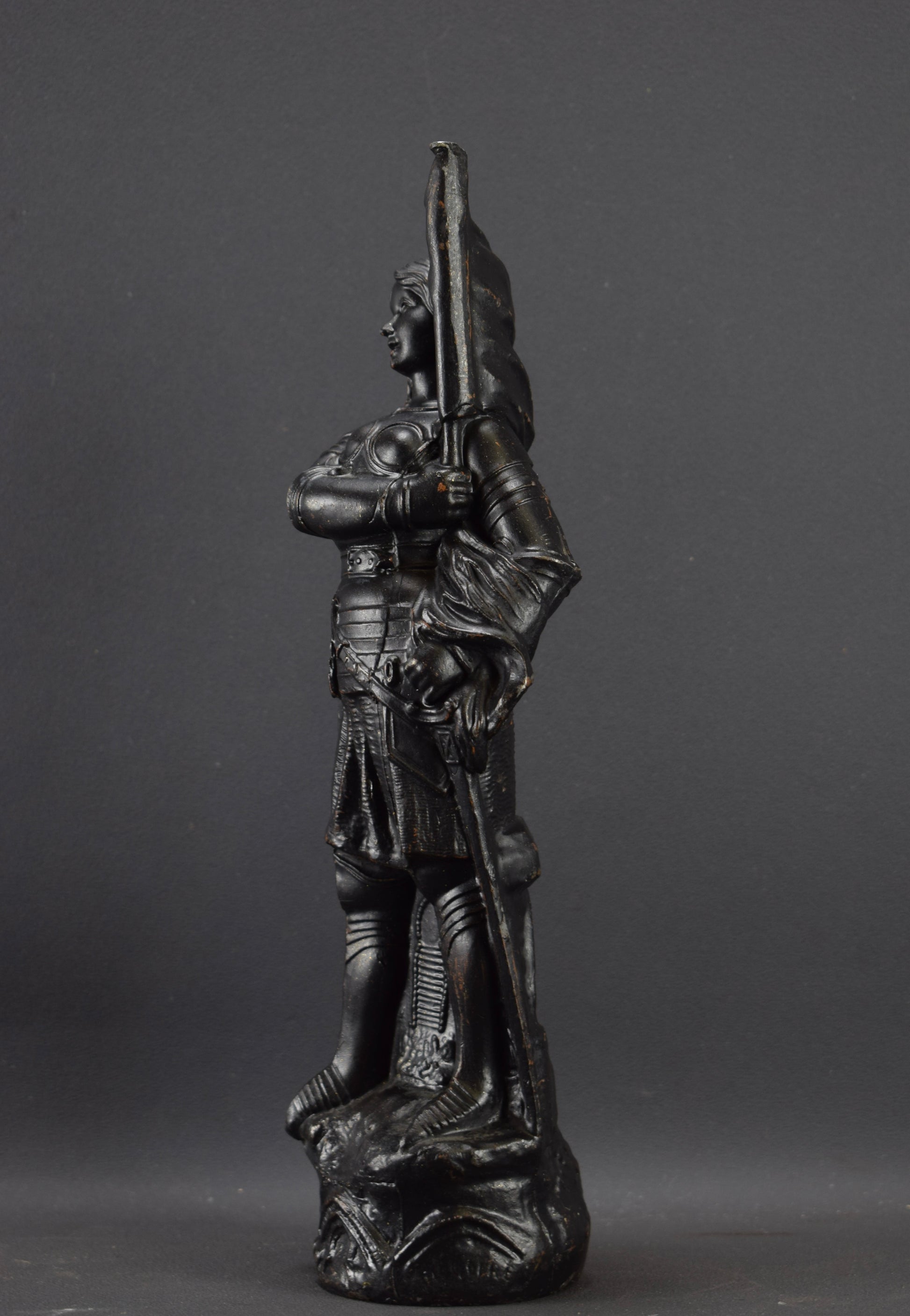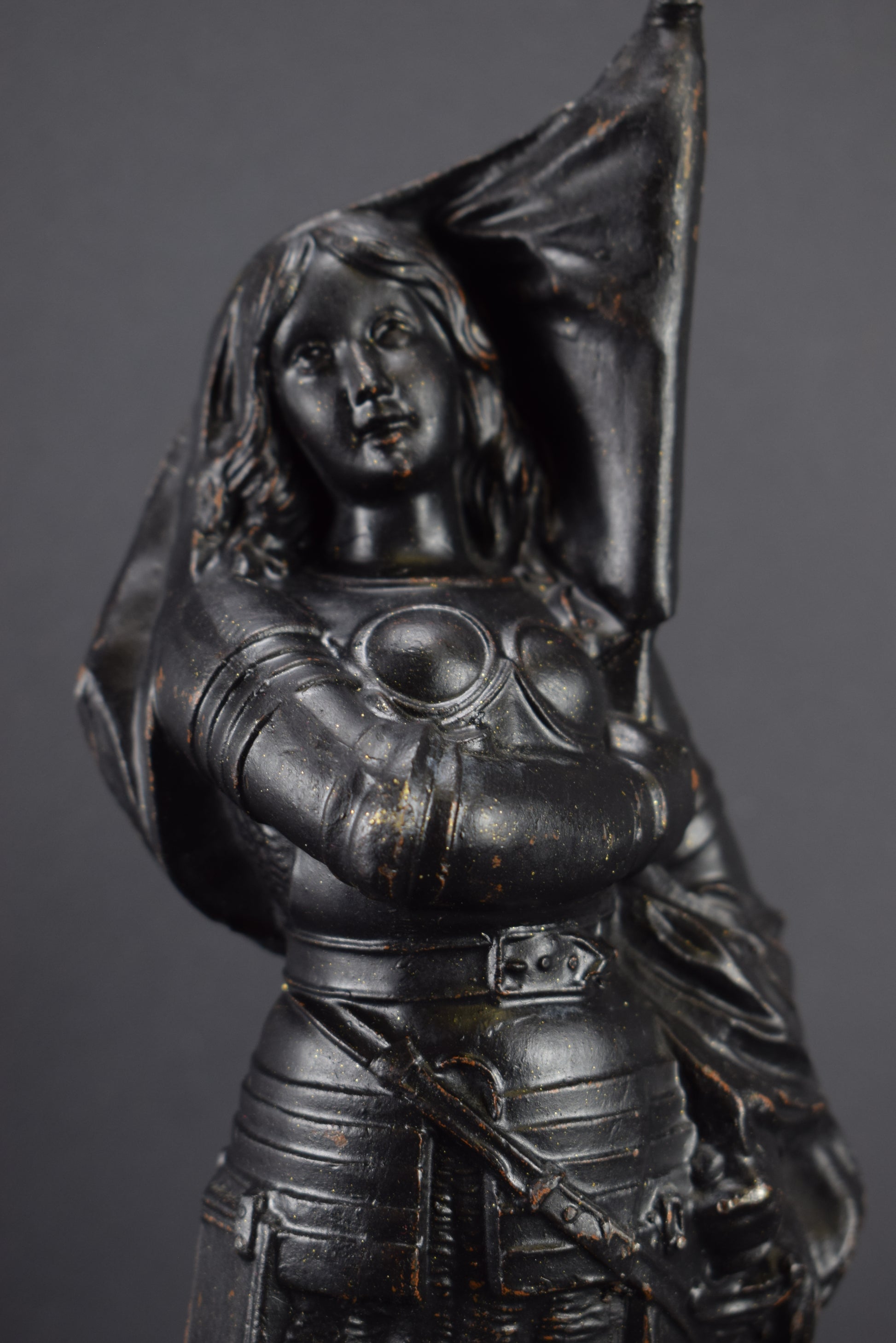 A French vintage religious statue of Saint Joan of Arc. The 11 5/8 inches high statuette depicts the Saint wearing an armor and holding a flag.