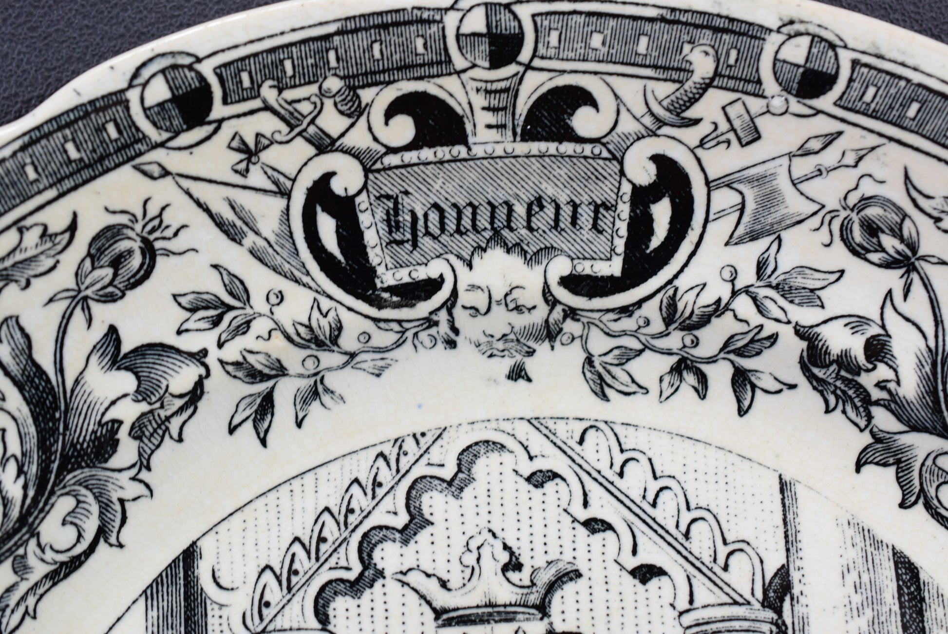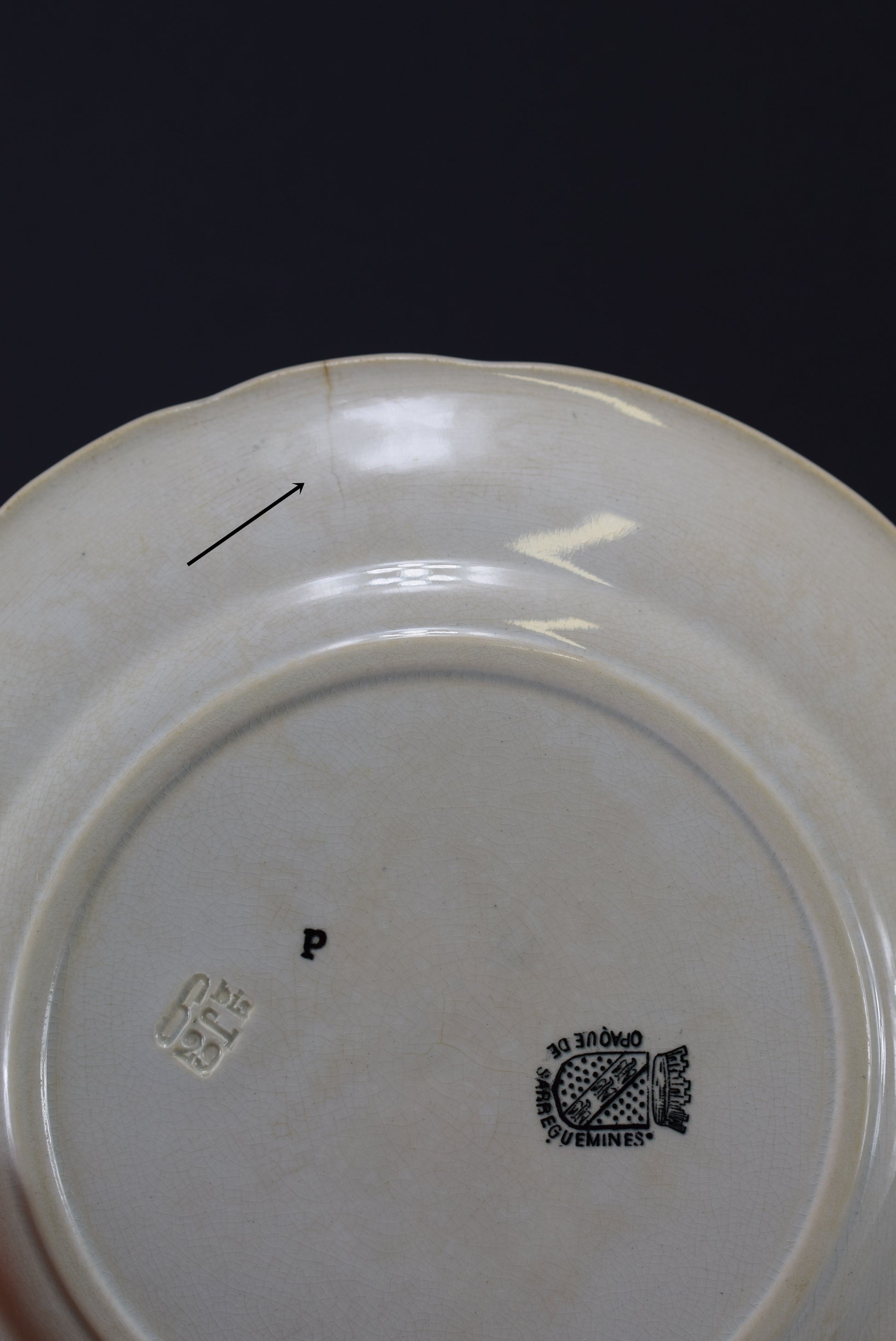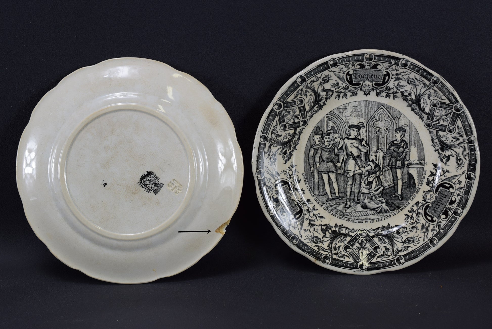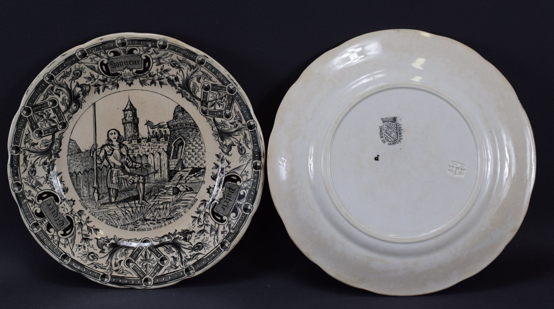 This wall decorative "talking" plates tell Saint Joan of Arc's life. They have been stamped with the Digoin Sarreguemines manufacturer's marks.
