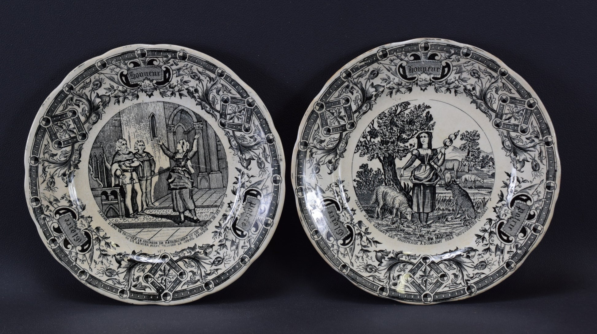 A beautiful antique French set of nine white and black transferware plate manufactured by the world-renowned Digoin Sarreguemines ceramic company, dating to the late 1800s. The wall plates depicts Saint Joan of Arc's life. The rim is finely ornated.