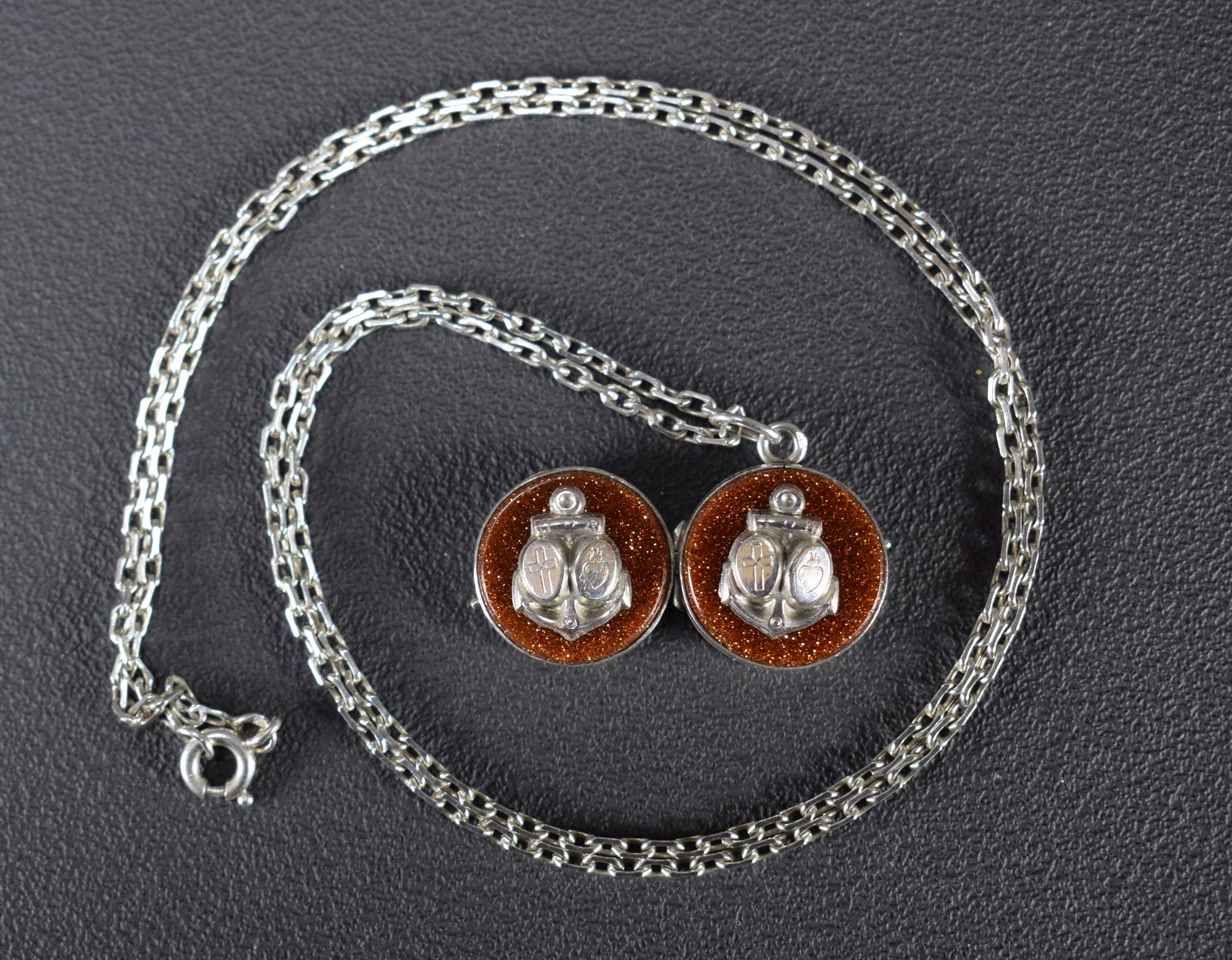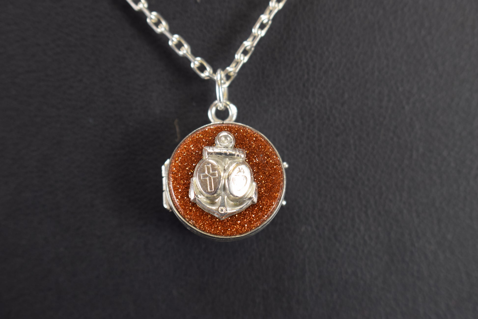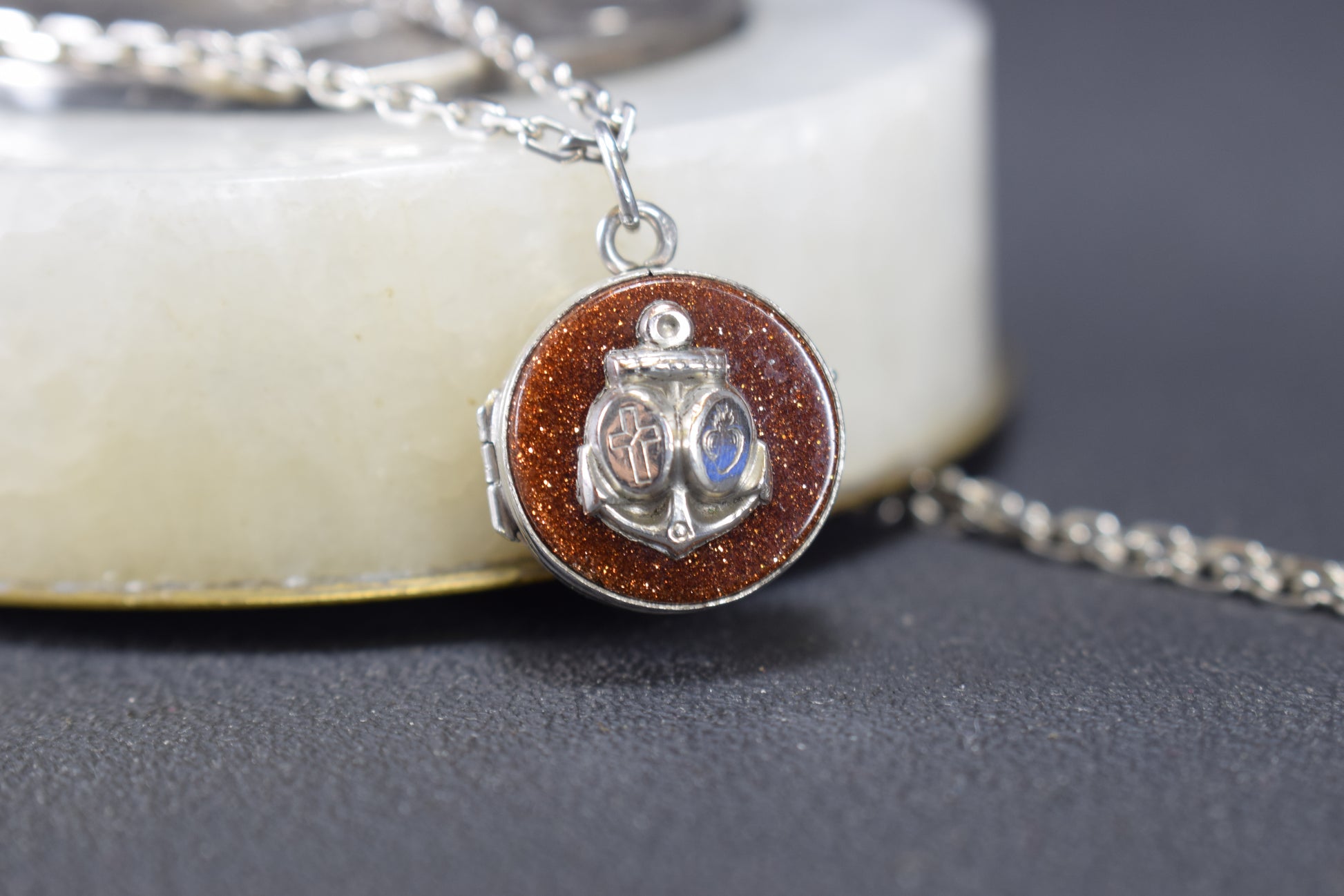The front and the back of the medallion depicts an anchor, a cross and a heart. These symbols stand for Hope, Faith and Charity. These symbols rest on a gorgeous sunstone. The reliquary pendant floats from a vintage sterling silver chain measuring 20 1/2 inches long.