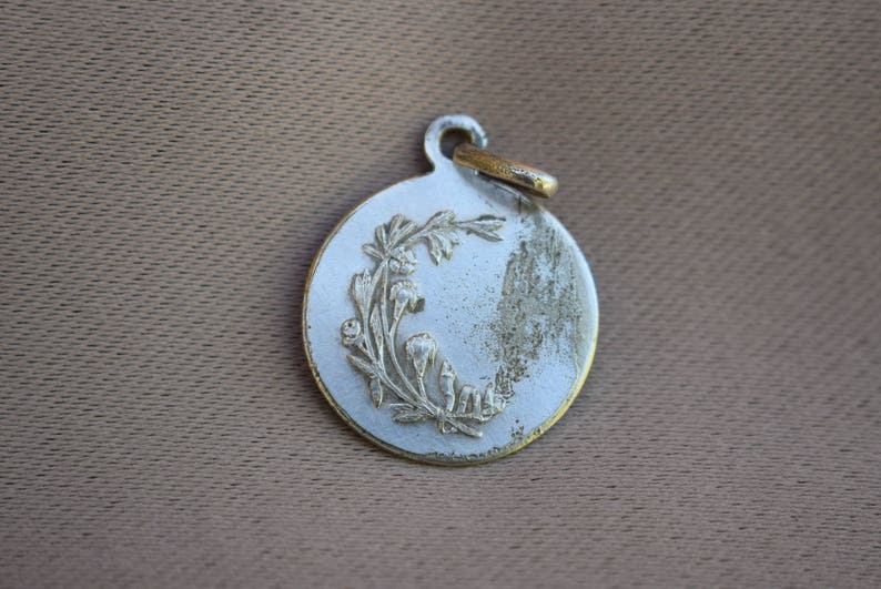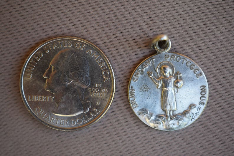 A French vintage religious medal designed by the artist A.Zacchi. The pendant features the Divine child. "Divin Enfant Protégez Nous" Protect Us.