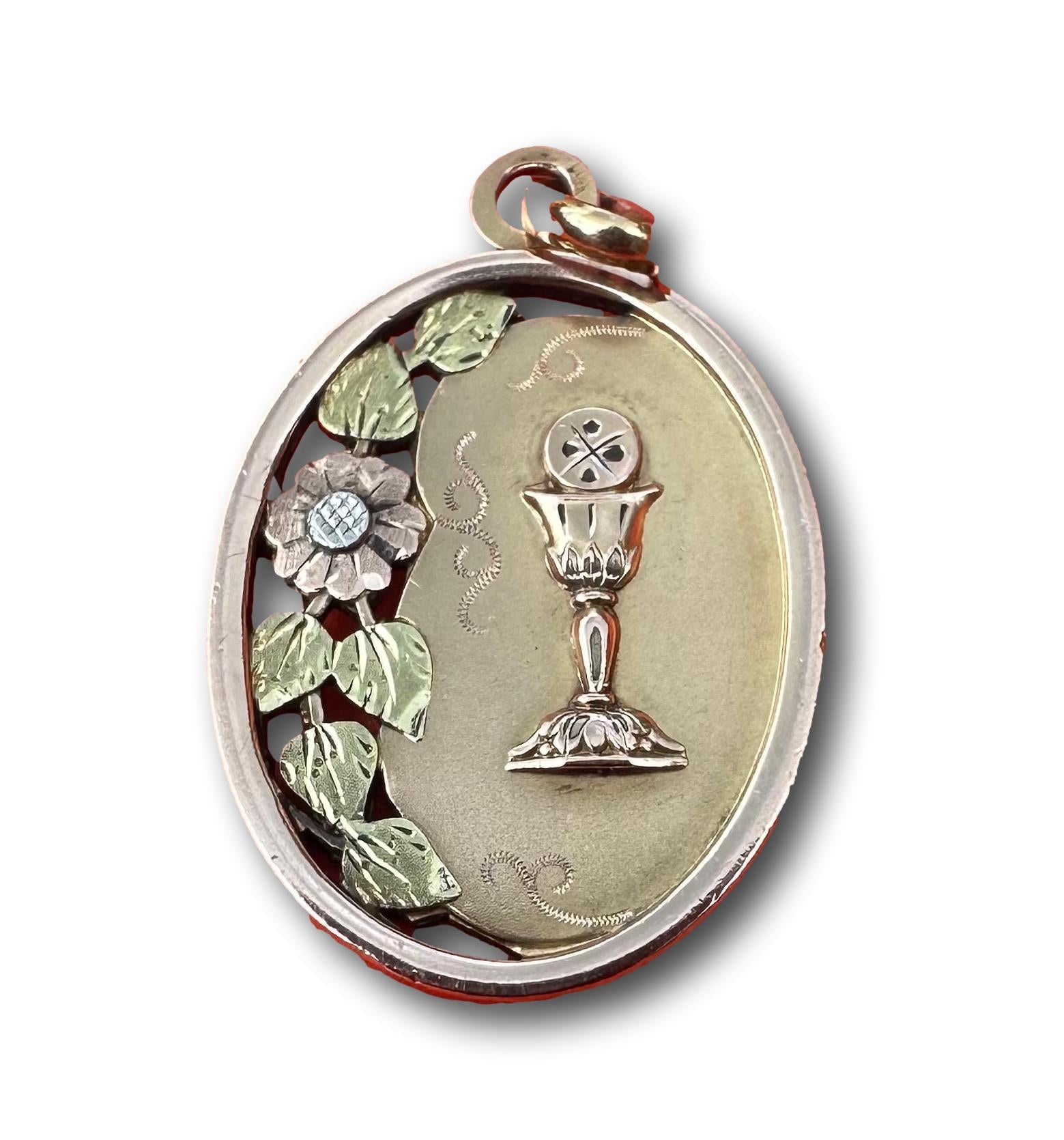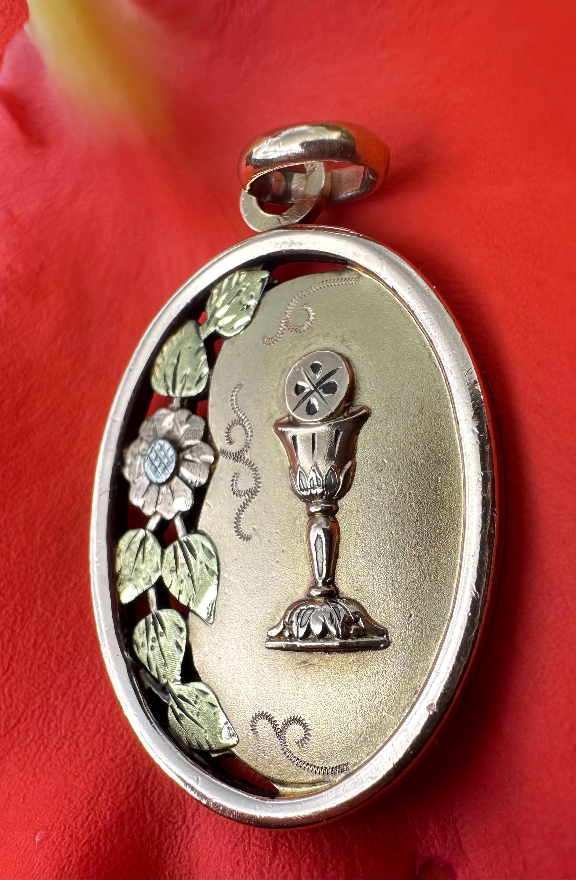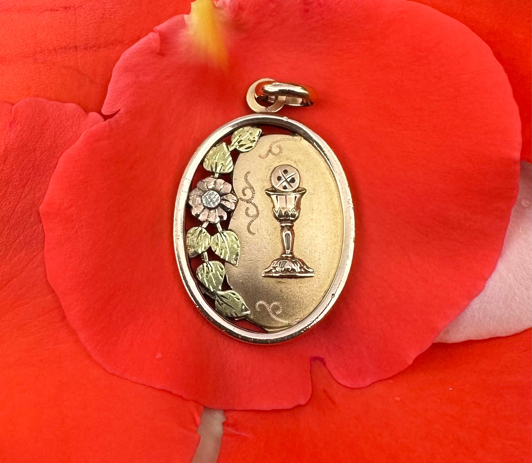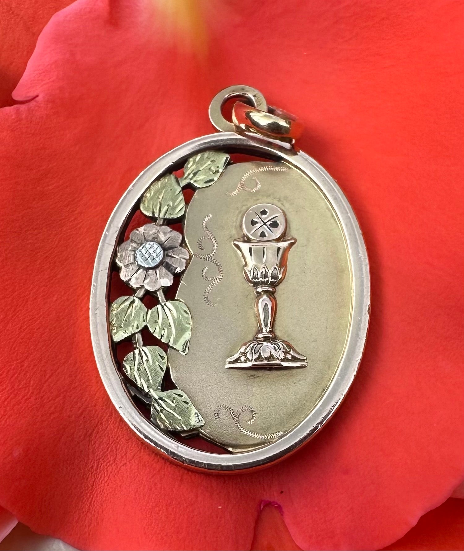 This is an exceptional antique French religious pendant dating to the early 20th century, circa 1920. The openwork medal finely depicts a chalice on the right and a flower and leaves on the left. This French high quality charm has been gold-filled with three kinds of gold. rose gold, green gold for the leaves and white gold for the center of the flower. This religious jewelry is a rare find !