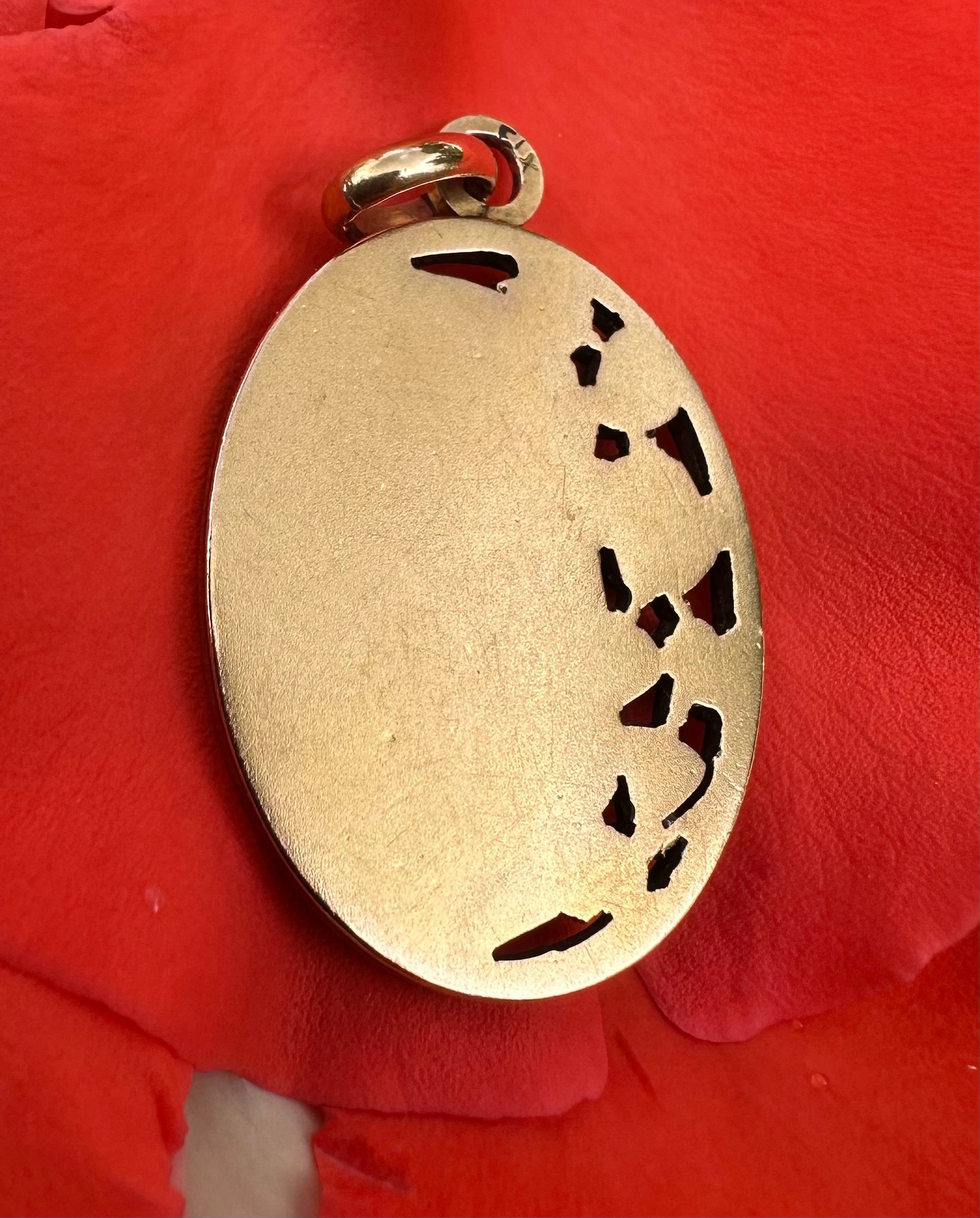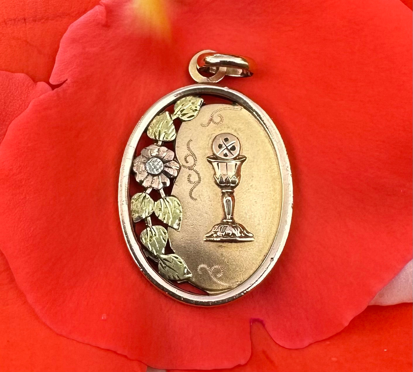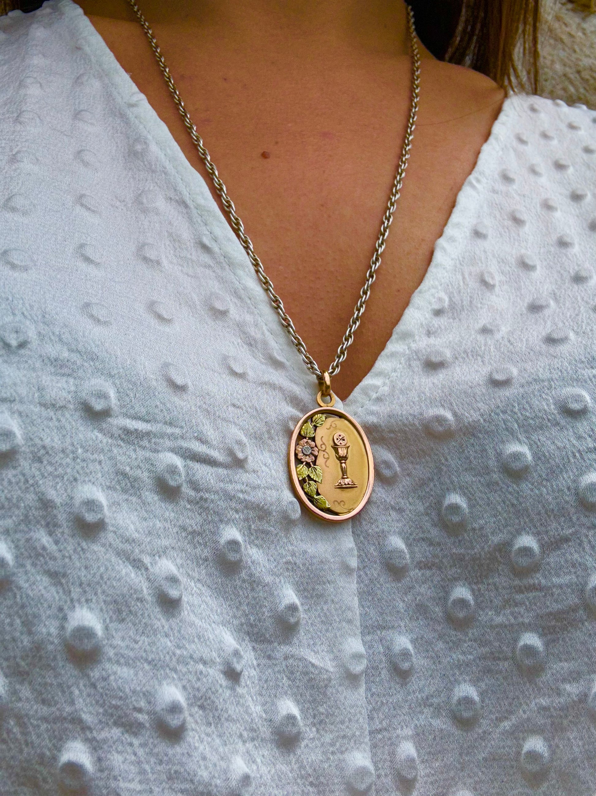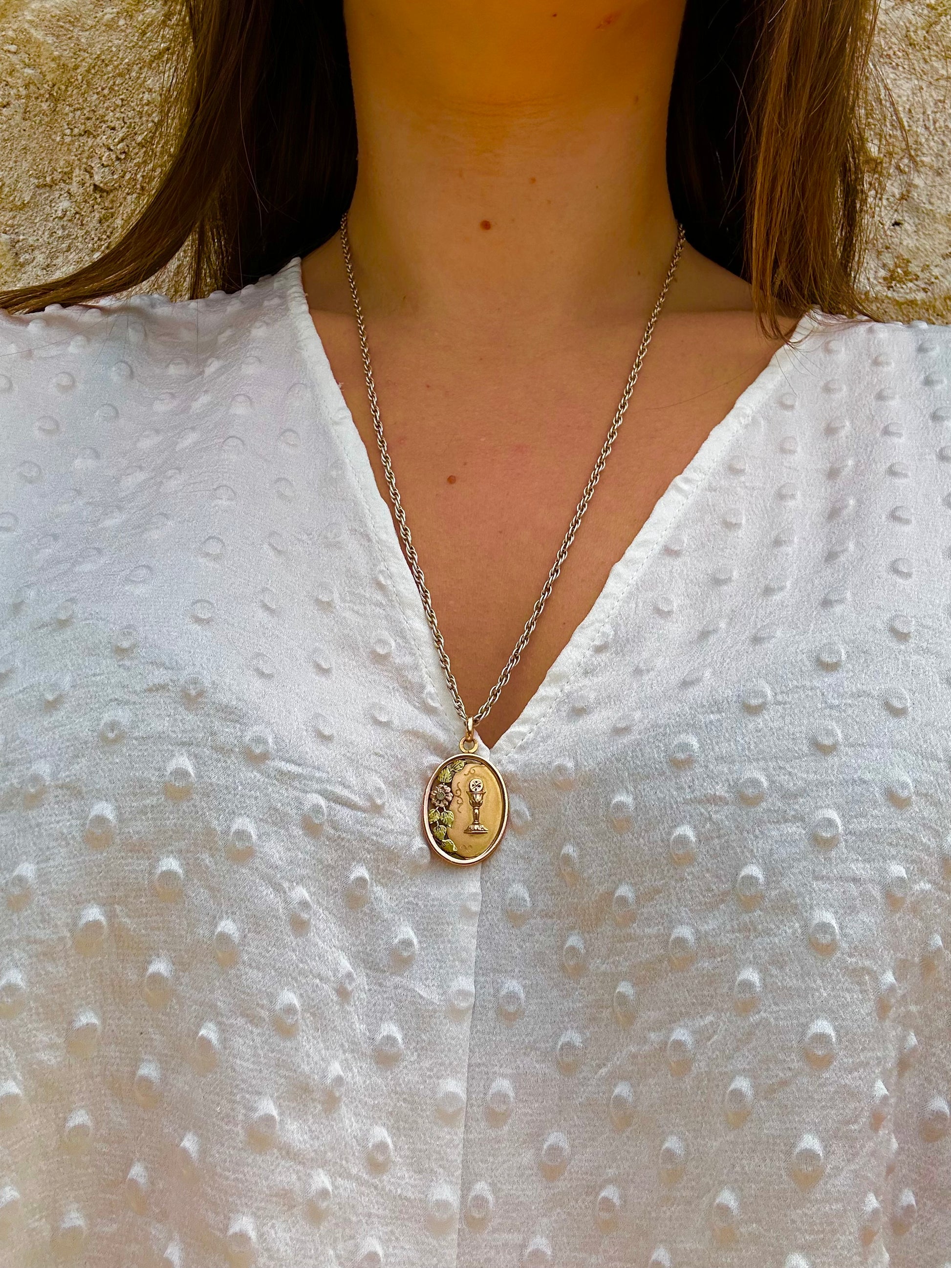 This is an exceptional antique French religious pendant dating to the early 20th century, circa 1920. The openwork medal finely depicts a chalice on the right and a flower and leaves on the left. This French high quality charm has been gold-filled with three kinds of gold. rose gold, green gold for the leaves and white gold for the center of the flower. This religious jewelry is a rare find !