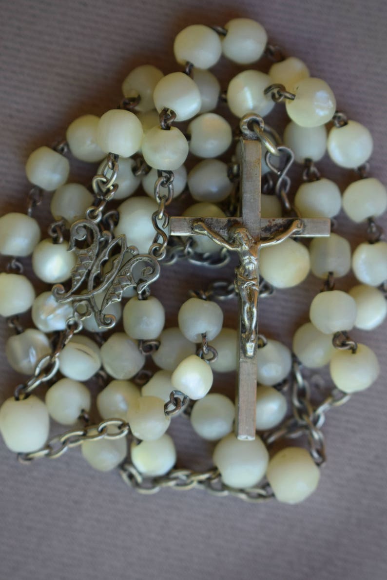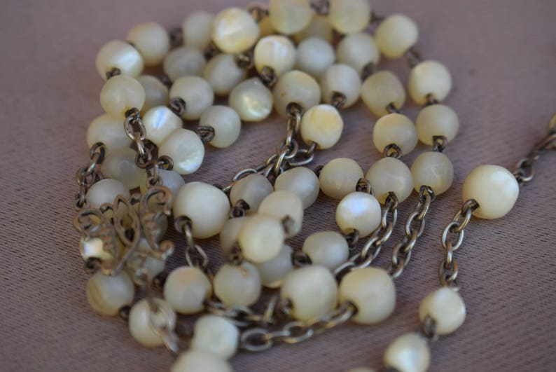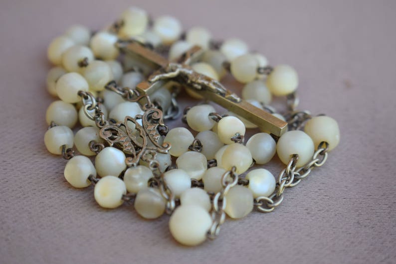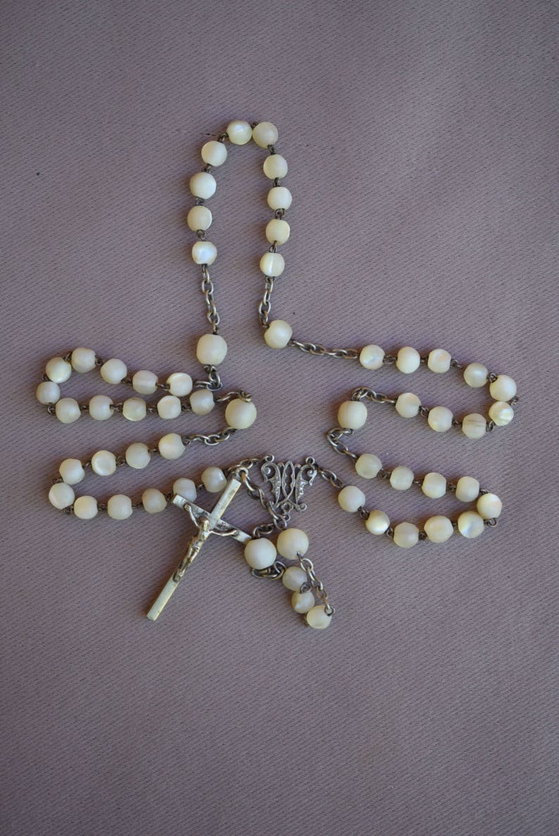 A vintage French rosary from the 1940's. It is made of 59 mother of pearl beads and metal. The cross and the connector are finely crafted. There are nine beads on one side and eleven on the other side.