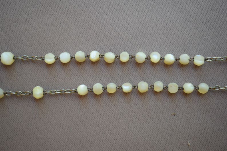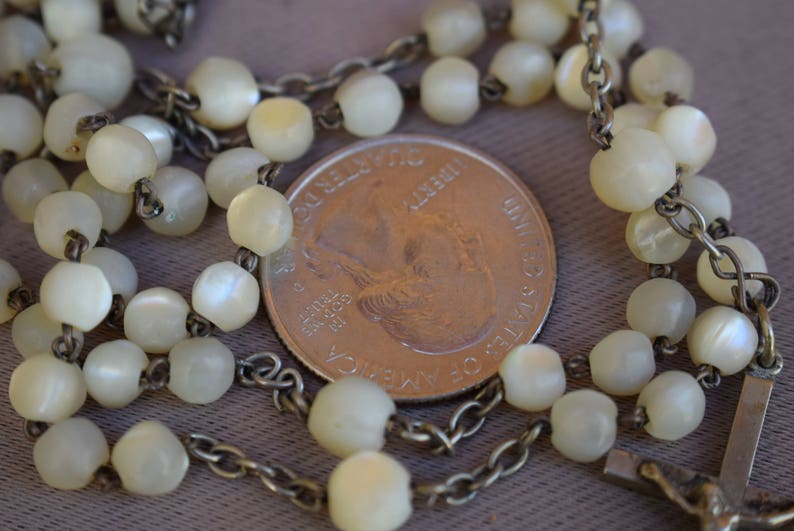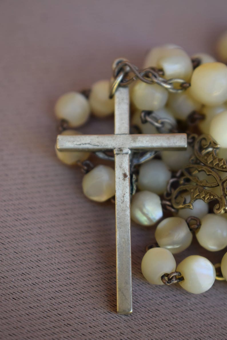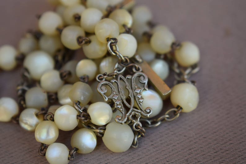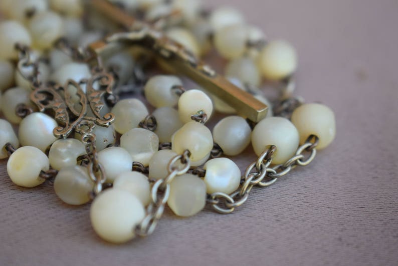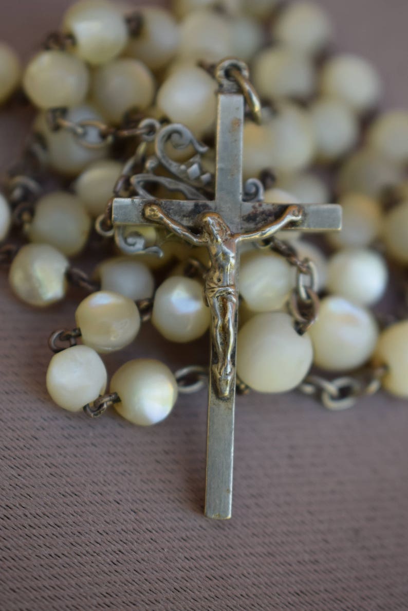 A vintage French rosary from the 1940's. It is made of 59 mother of pearl beads and metal. The cross and the connector are finely crafted. There are nine beads on one side and eleven on the other side.