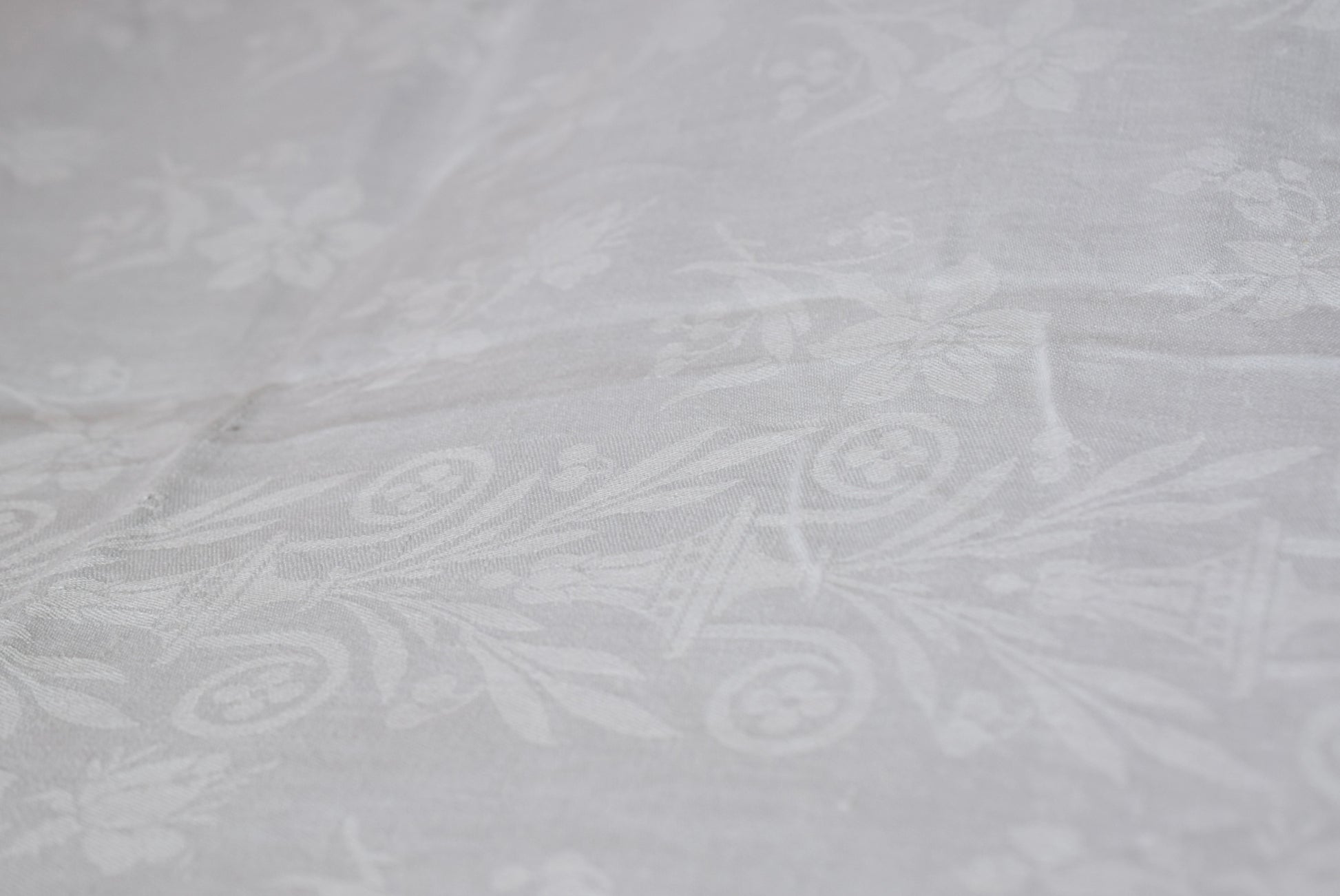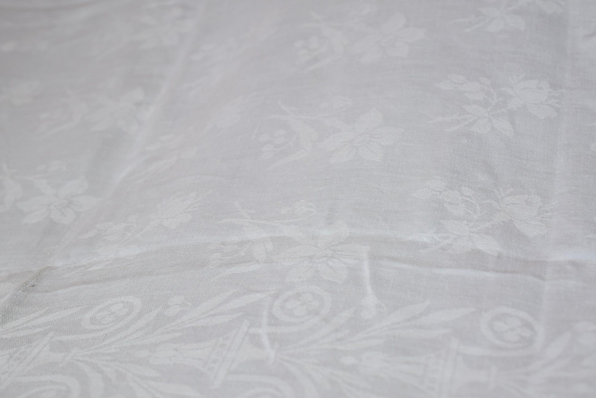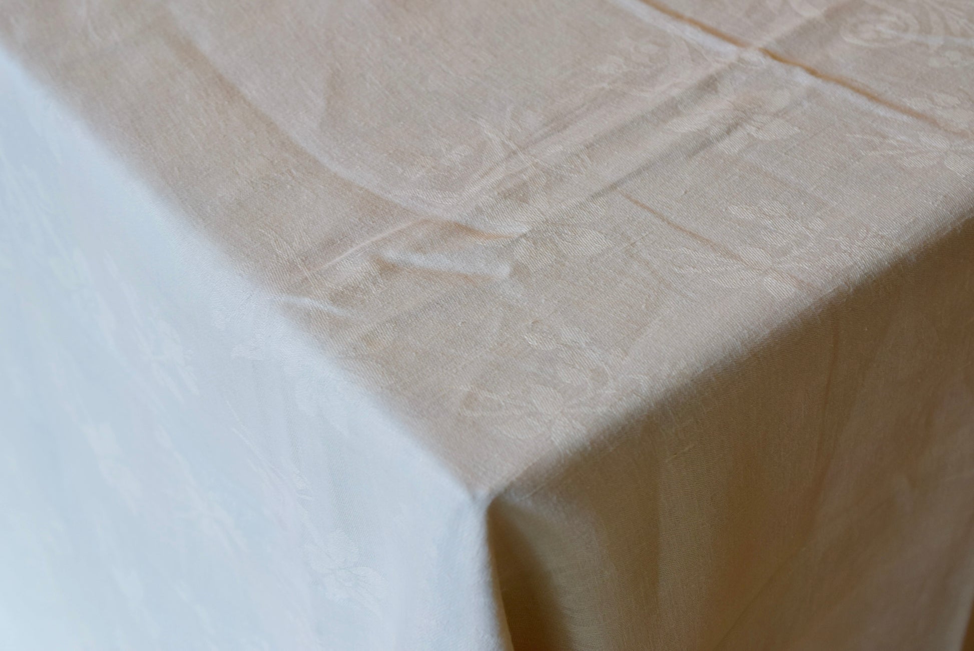 A French vintage tablecloth made of damasse cotton/linen. Leaves and floral motifs. No monogram. This beautiful tablecloth dates from the 1950's. It measures 88 5/8 inches (225cm) long and 61 inches wide (155cm).